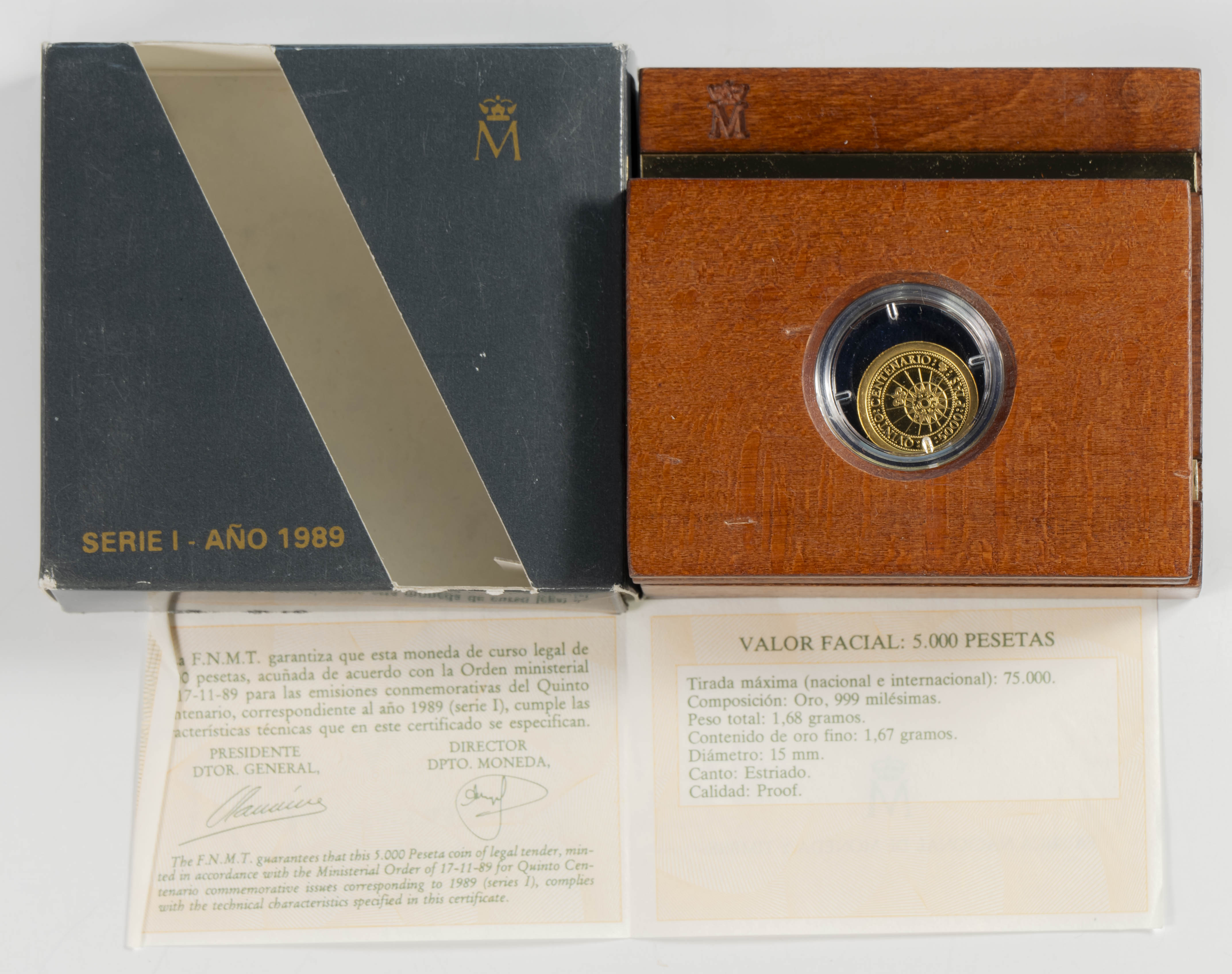JUAN CARLOS I (1975-2014). 5.000 Pesetas. (Au. 1,68g/15mm). Quinto Centenario. Serie I. 1989. FNMT. PROOF. Presentada en estuche oficial y con certificado de autenticidad.