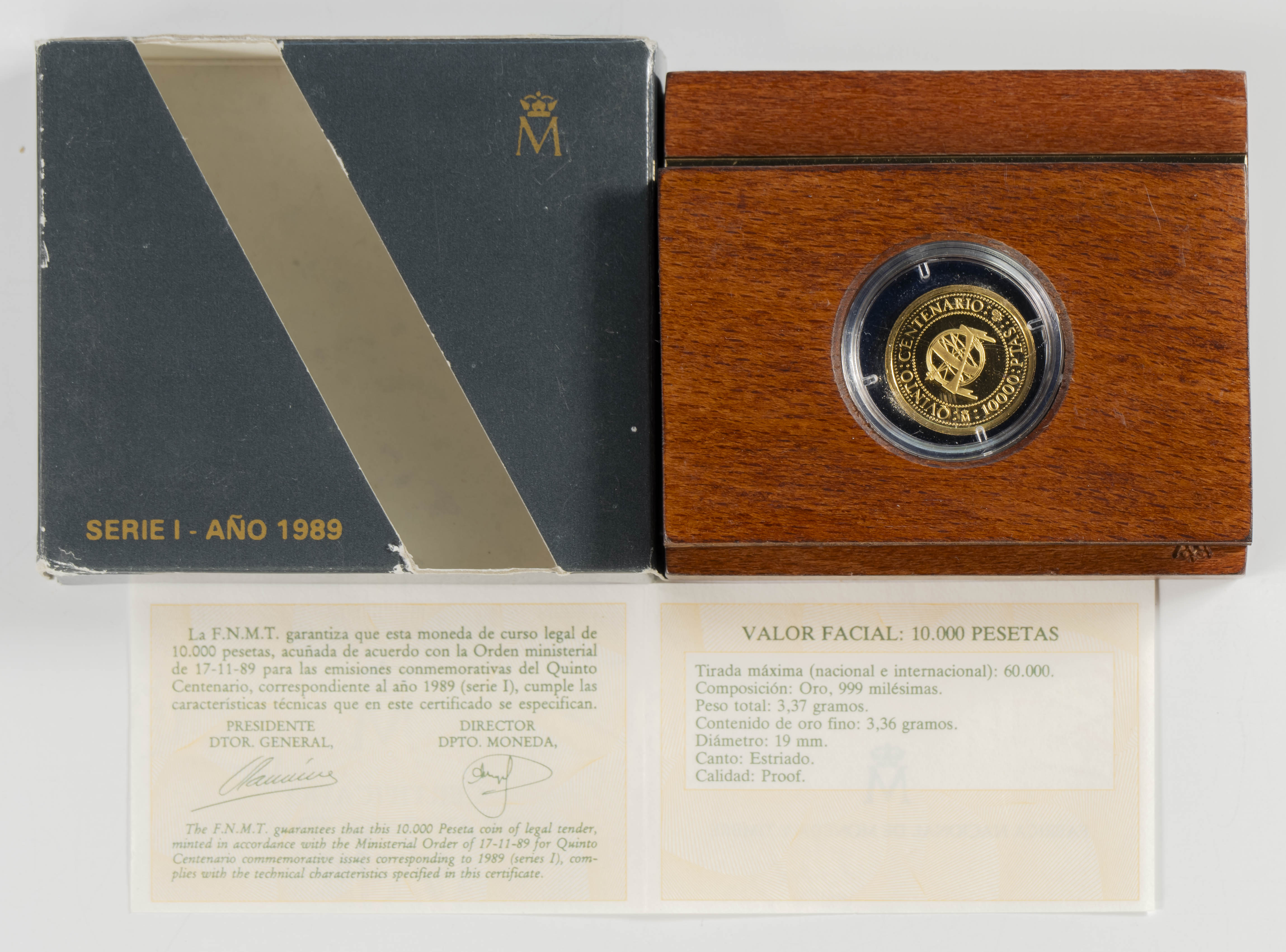 JUAN CARLOS I (1975-2014). 10.000 Pesetas. (Au. 3,37g/19mm). Quinto Centenario. Serie I. 1989. FNMT. PROOF. Presentada en estuche oficial y con certificado de autenticidad.