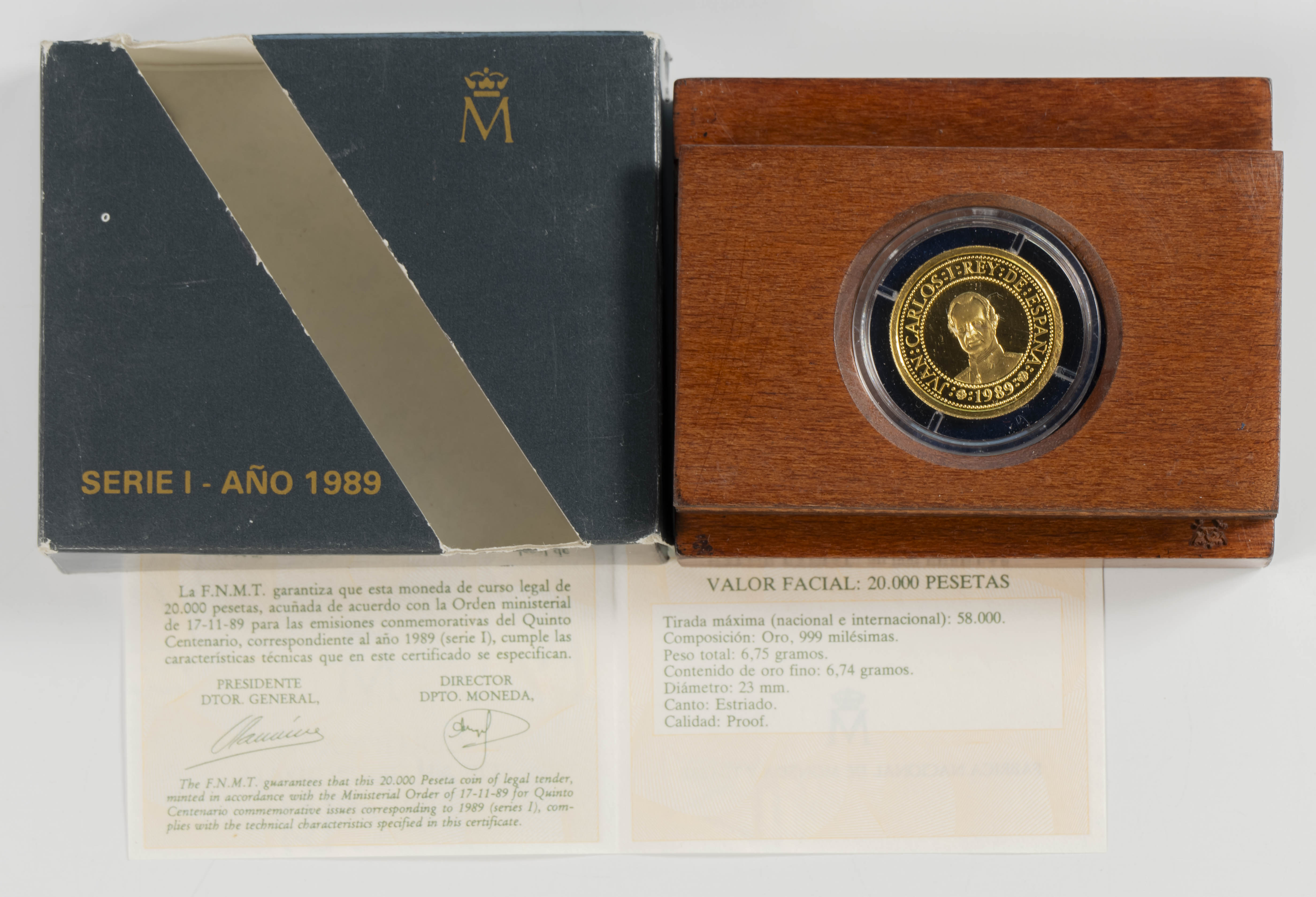 JUAN CARLOS I (1975-2014). 20.000 Pesetas. (Au. 6,75g/23mm). Quinto Centenario. Serie I. 1989. FNMT. PROOF. Presentada en estuche oficial y con certificado de autenticidad.