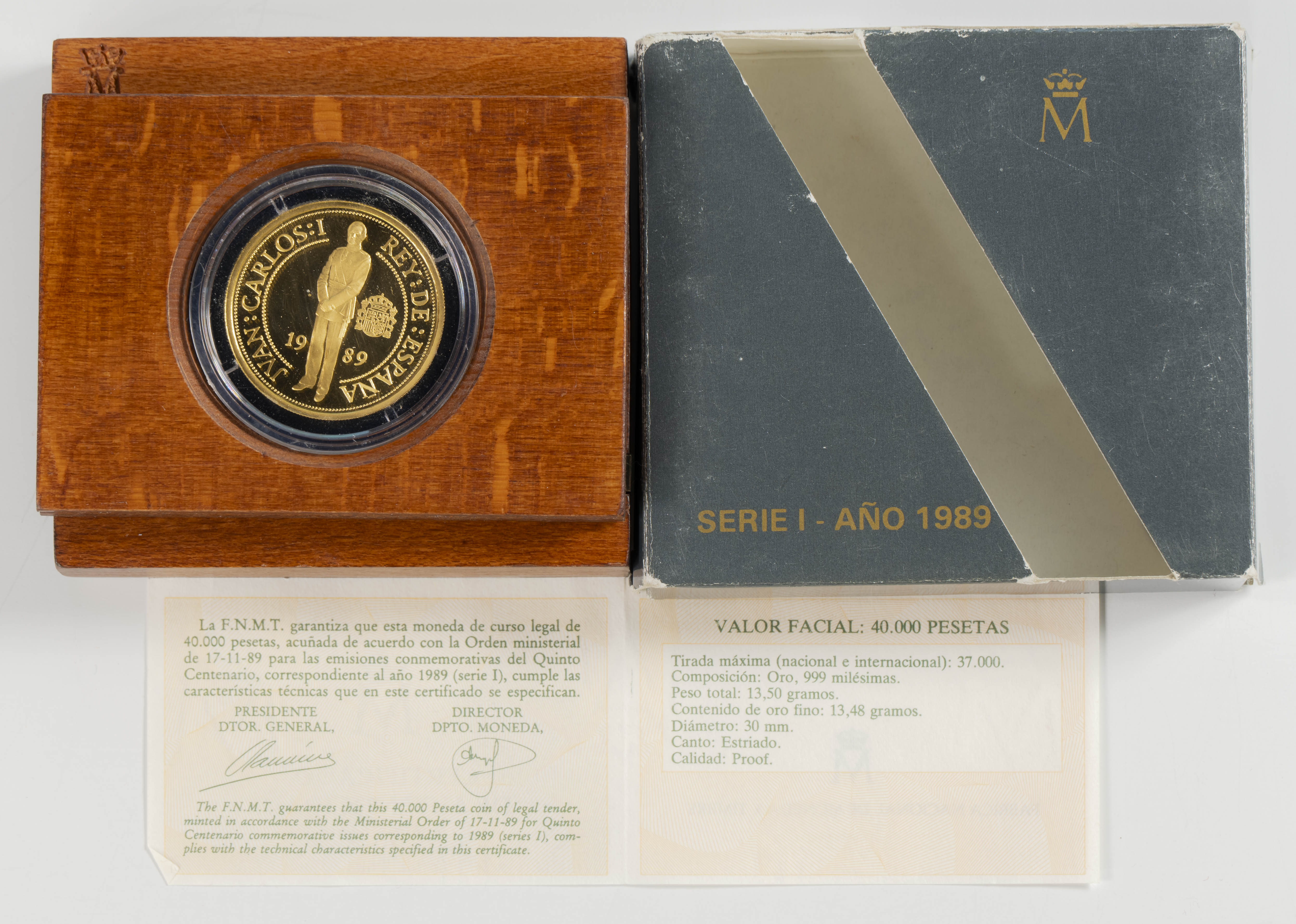 JUAN CARLOS I (1975-2014). 40.000 Pesetas. (Au. 13,50g/30mm). Quinto Centenario. Serie I. 1989. FNMT. PROOF. Presentada en estuche oficial y con certificado de autenticidad.