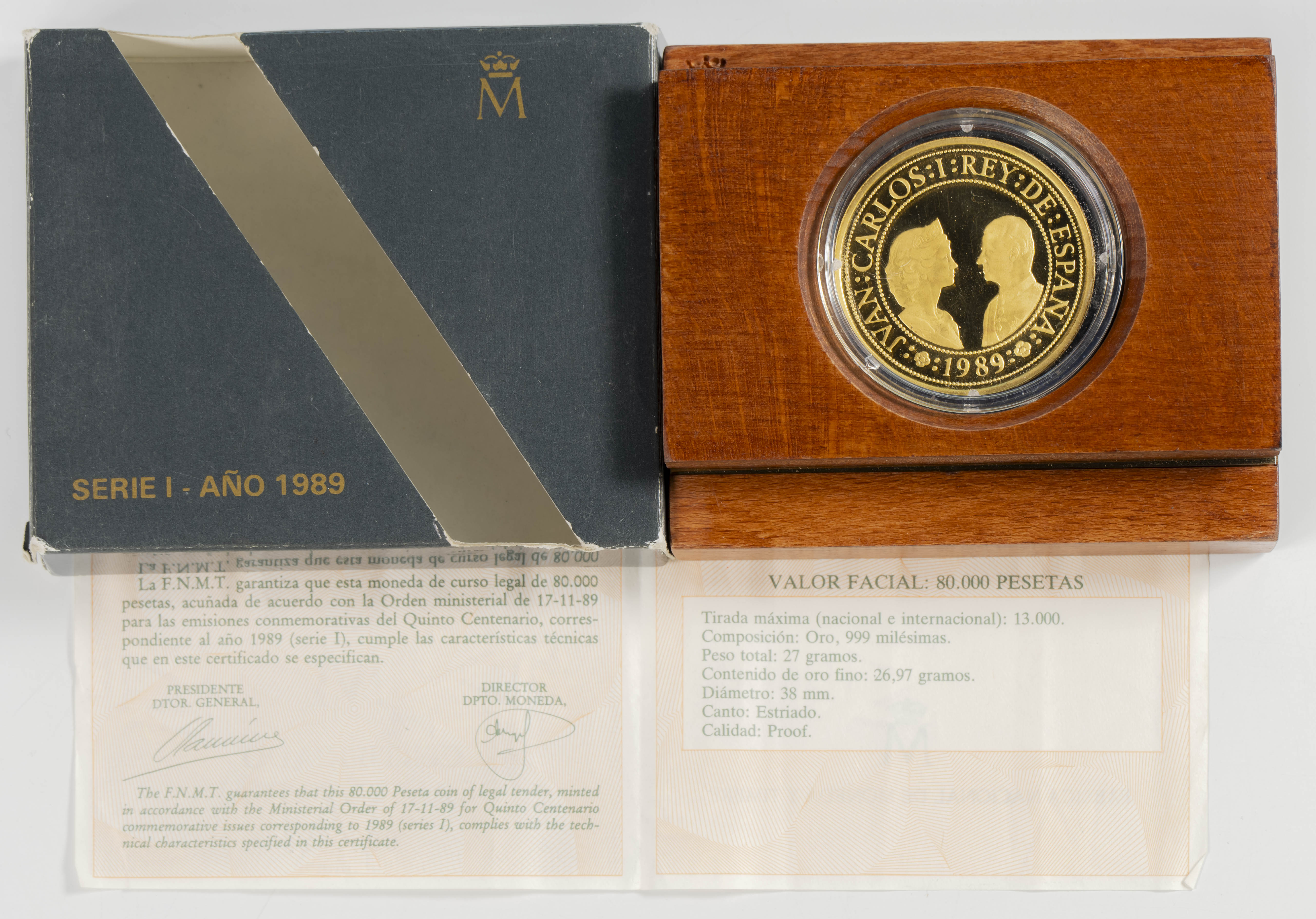 JUAN CARLOS I (1975-2014). 80.000 Pesetas. (Au. 27,00g/38mm). Quinto Centenario. Serie I. 1989. FNMT. PROOF. Presentada en estuche oficial y con certificado de autenticidad.