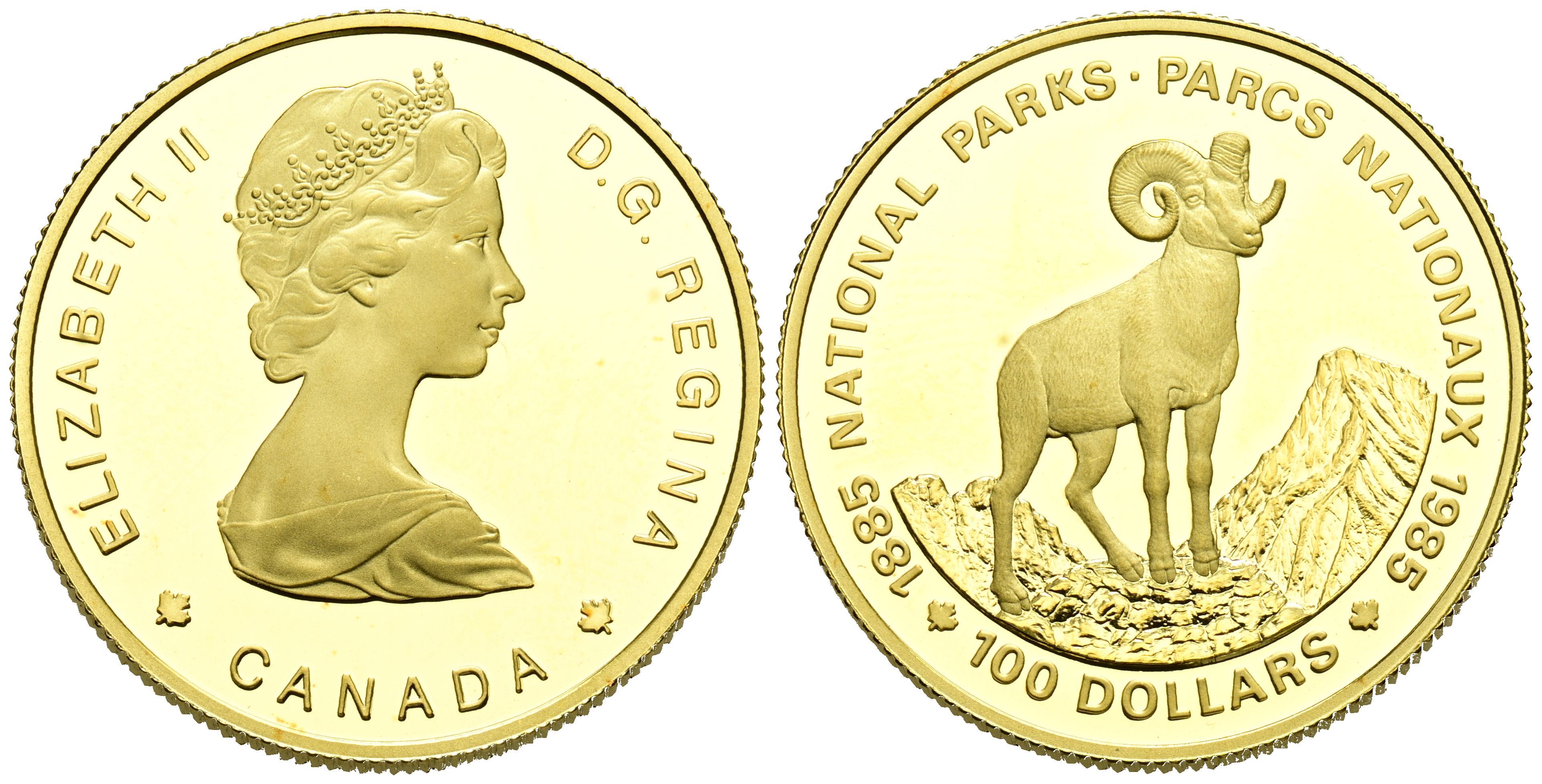 CANADÁ. 100 Dollars. (Au. 16,99g/27mm). 1985. Centenario Parques Nacionales. (Km#144). PROOF.