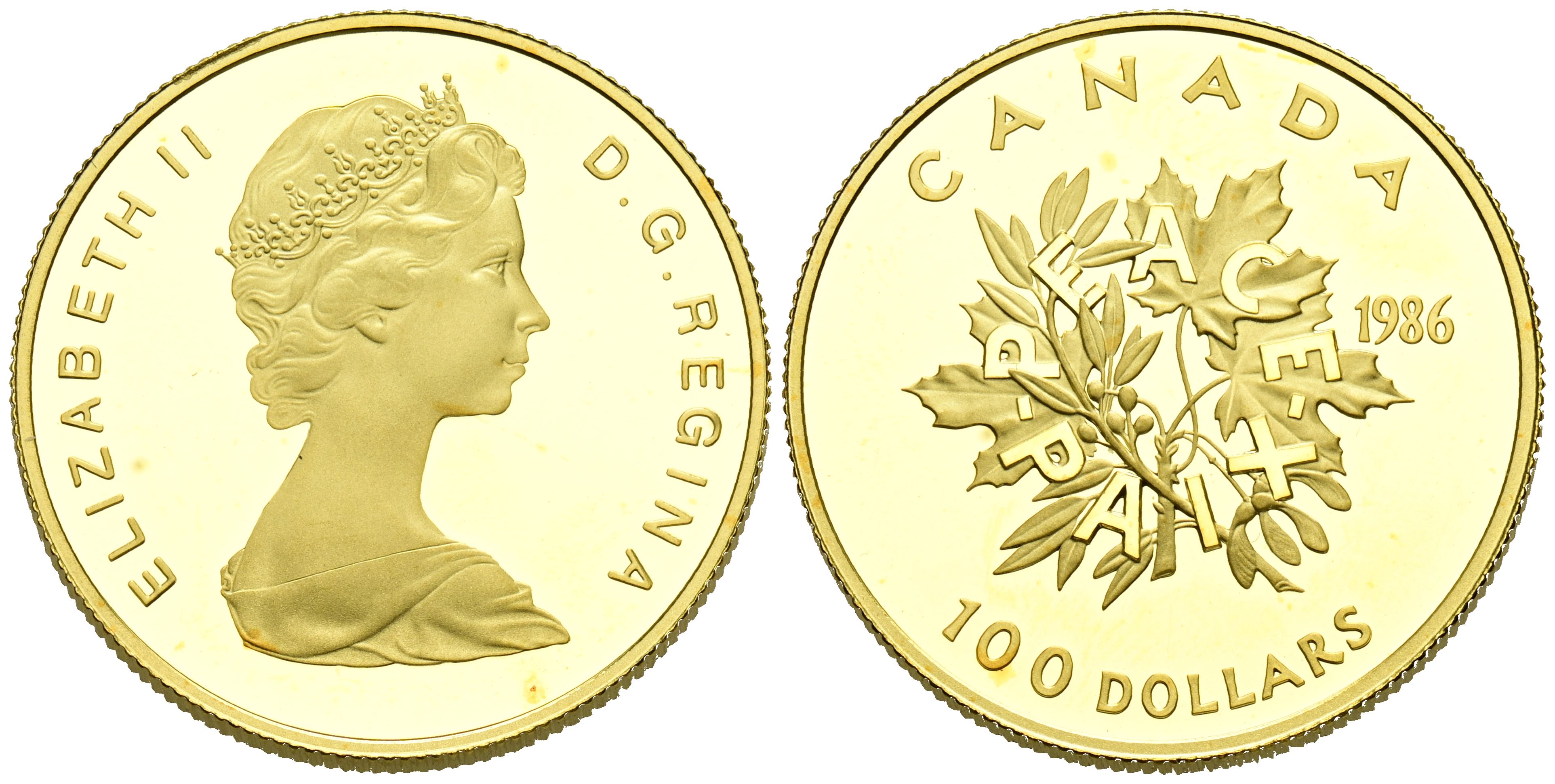CANADÁ. 100 Dollars. (Au. 17,00g/27mm). 1986. Año Internacional de la Paz. (Km#152). PROOF.