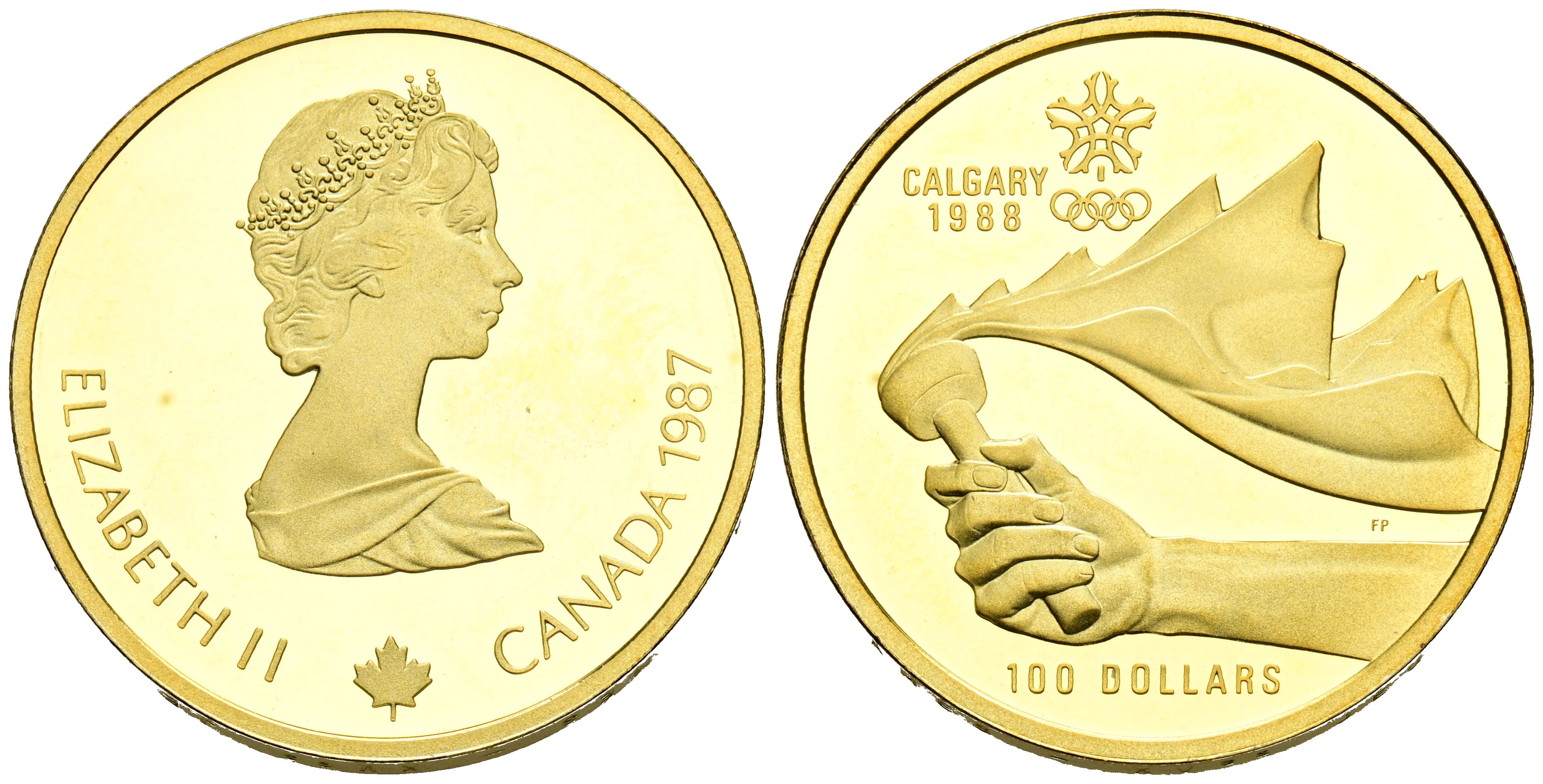CANADÁ. 100 Dollars. (Au. 13,28g/27mm). 1987. Isabel II. Juegos de Invierno de Cagliari 88. (Km#158). PROOF.