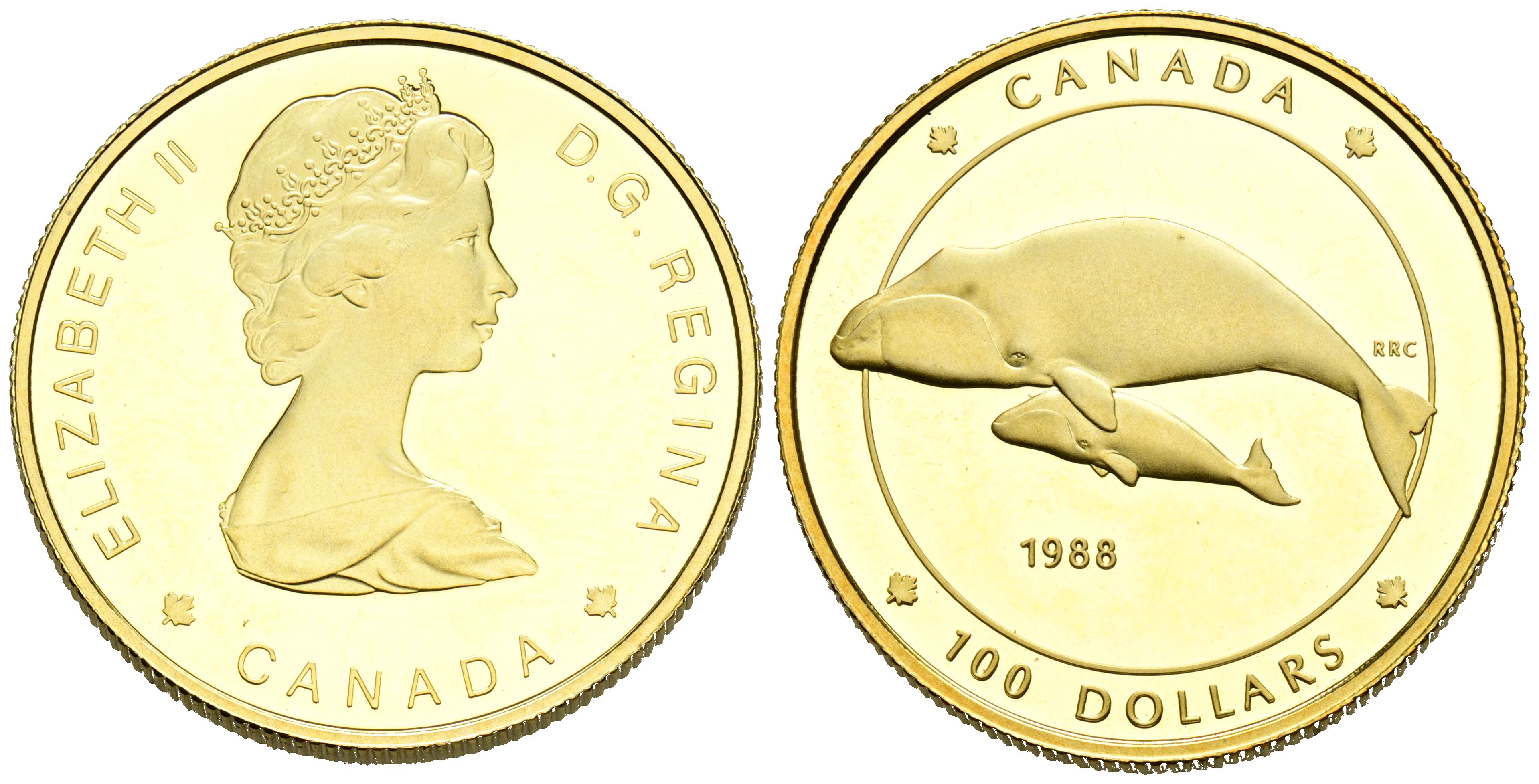 CANADÁ. 100 Dollars. (Au. 13,36g/27mm). 1988. Ballena y ballenato. (Km#162). PROOF.