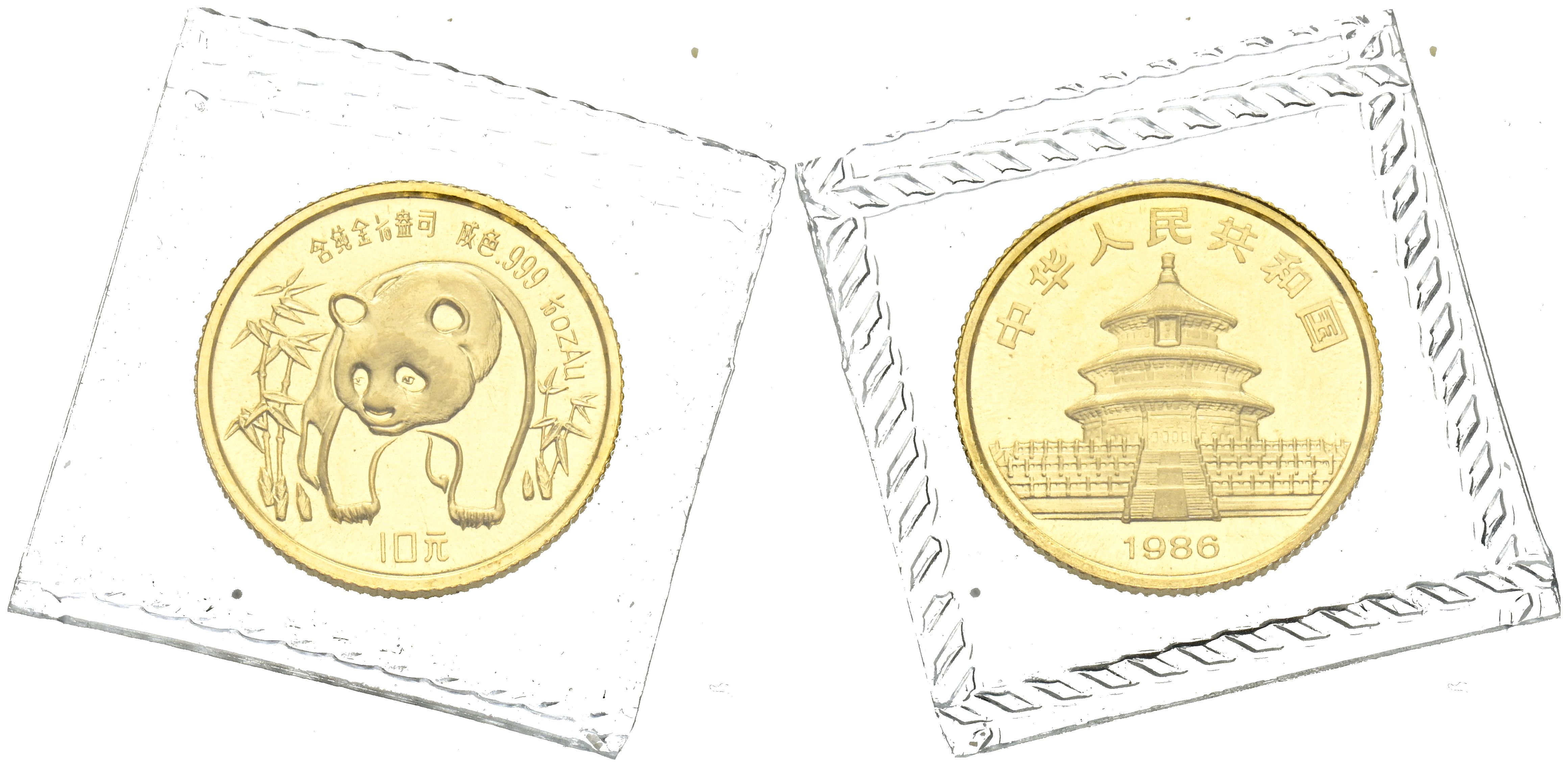 CHINA. 10 Yuan. (Au. 3,11g/18mm). 1986. Serie Panda. (Km#132). SC. En blíster original sin abrir.