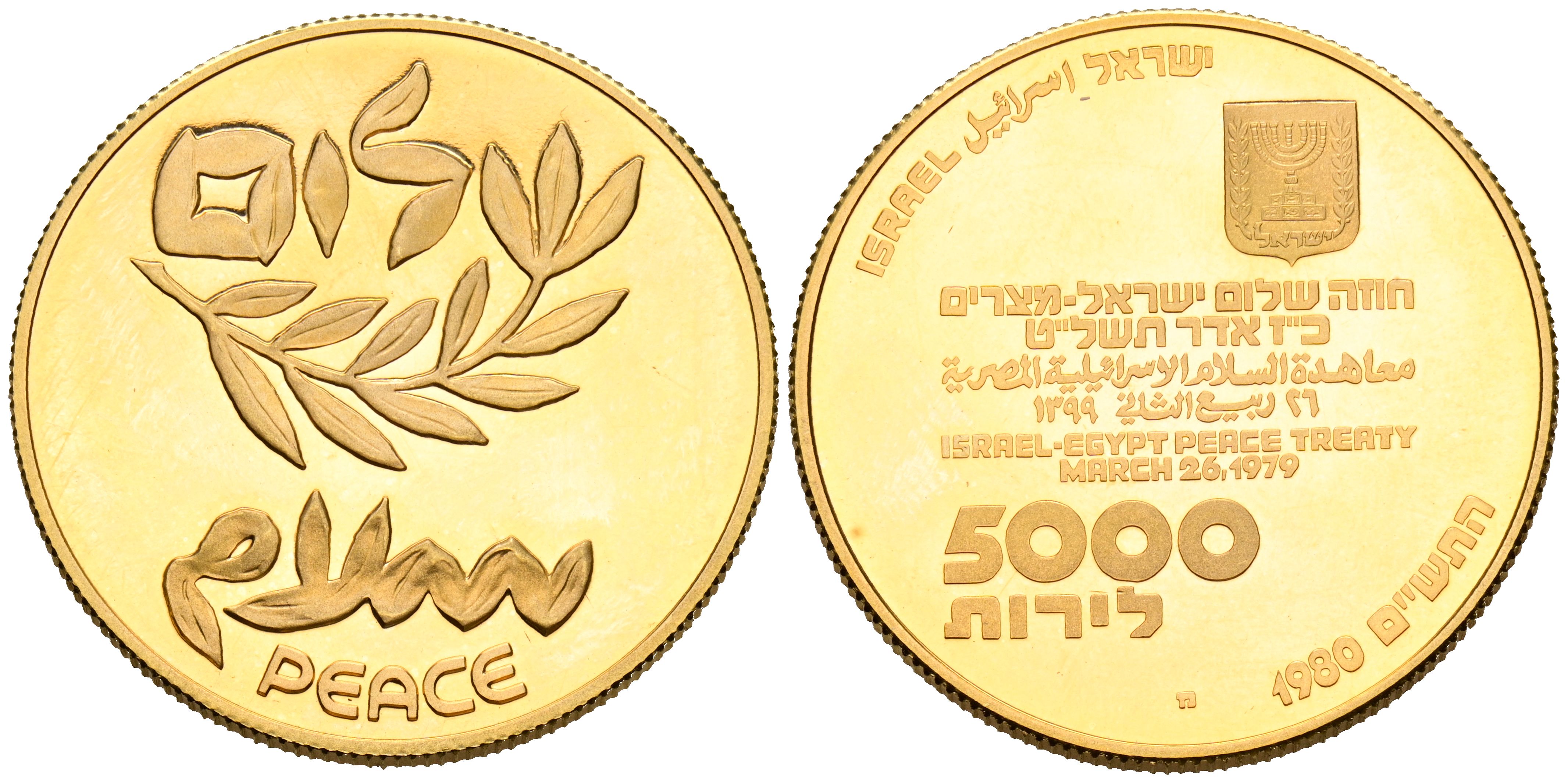 ISRAEL. 5000 Lirot. (Au. 17,22g/30mm). 1980. Tratado de Paz entre Israel y Egipto. (Km#105). PROOF. Escasa.