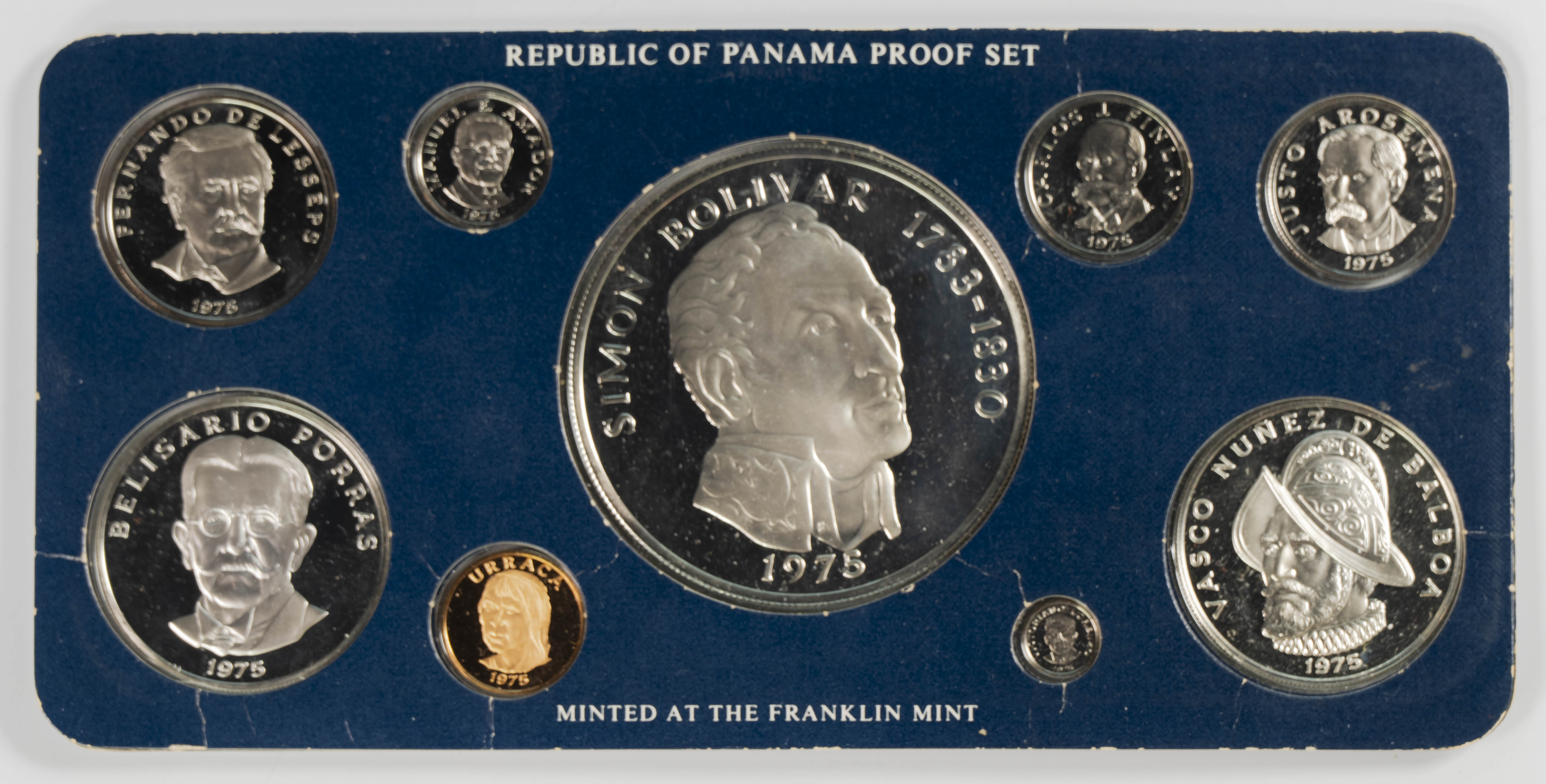 PANAMÁ. Set completo, sin estuche, compuesto por 9 piezas (los 3 módulos mayores en plata) con valores comprendidos entre 1 centésimo y 20 Balboas. 1975. Franklin Mint. PROOF.