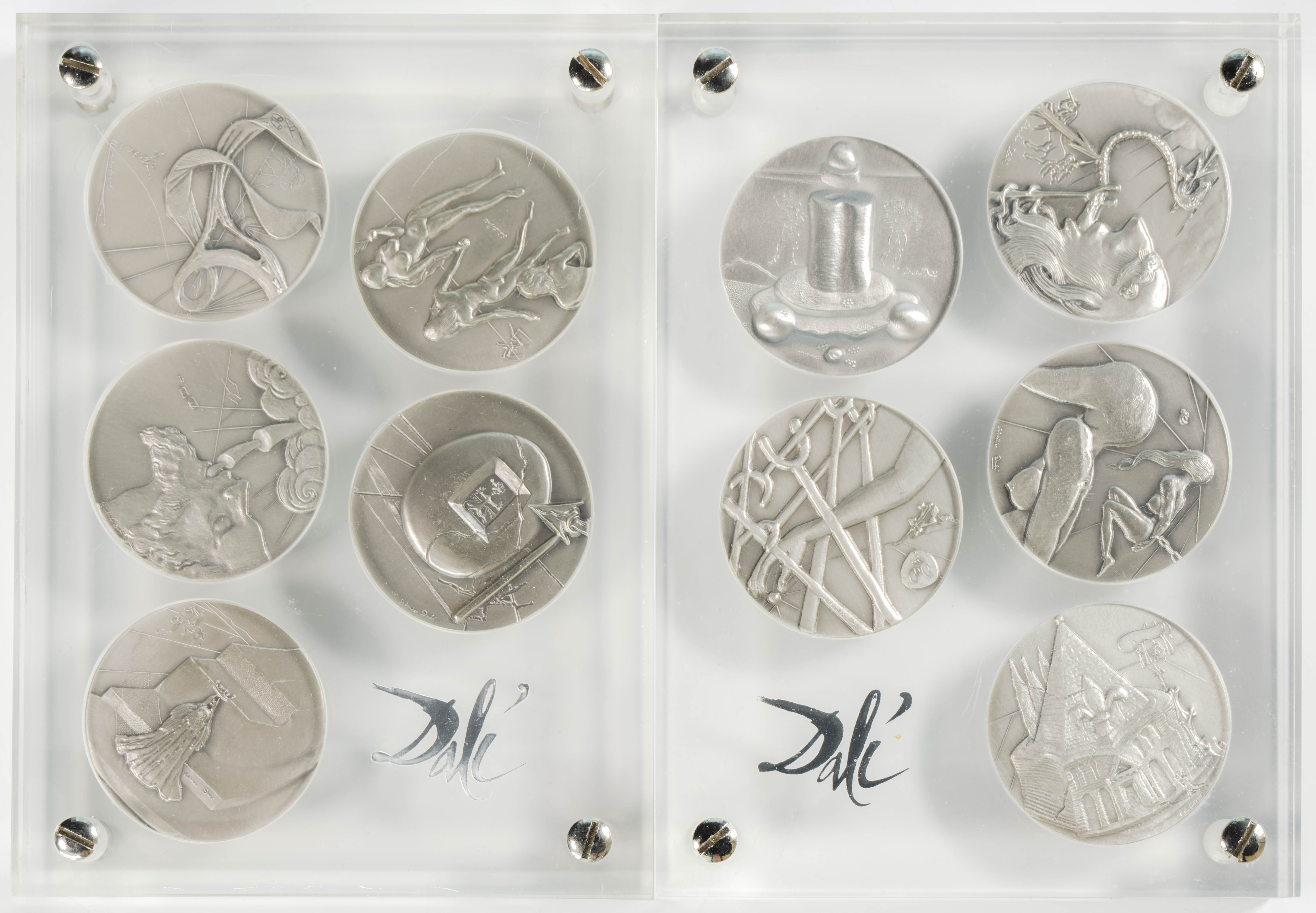 ESPAÑA. Conjunto de 10 medallas en plata de "Los Diez Mandamientos" de Salvador Dalí. Presentadas en 2 estuches de metacrilato. Peso total aproximado del conjunto: 500g. SC.