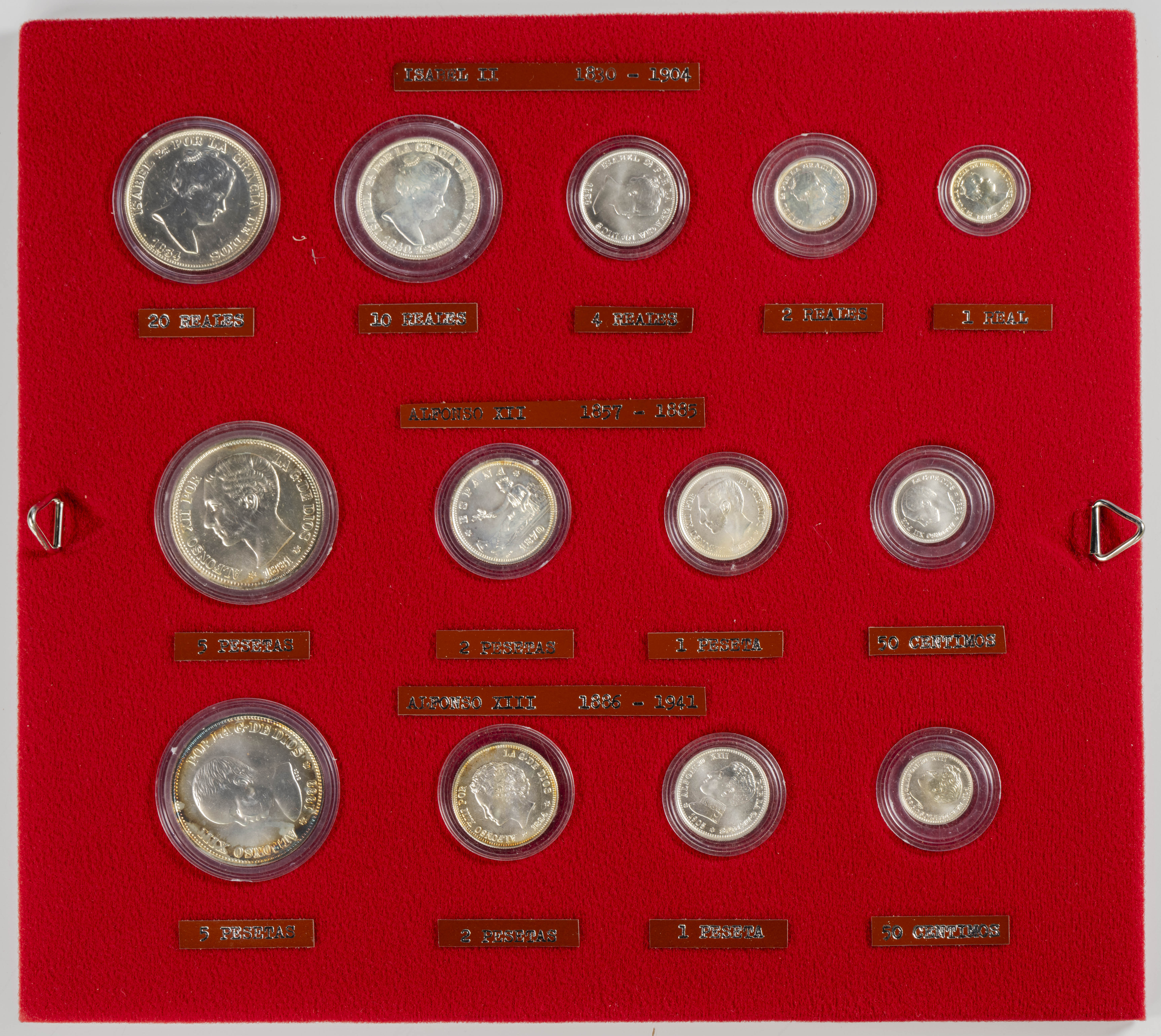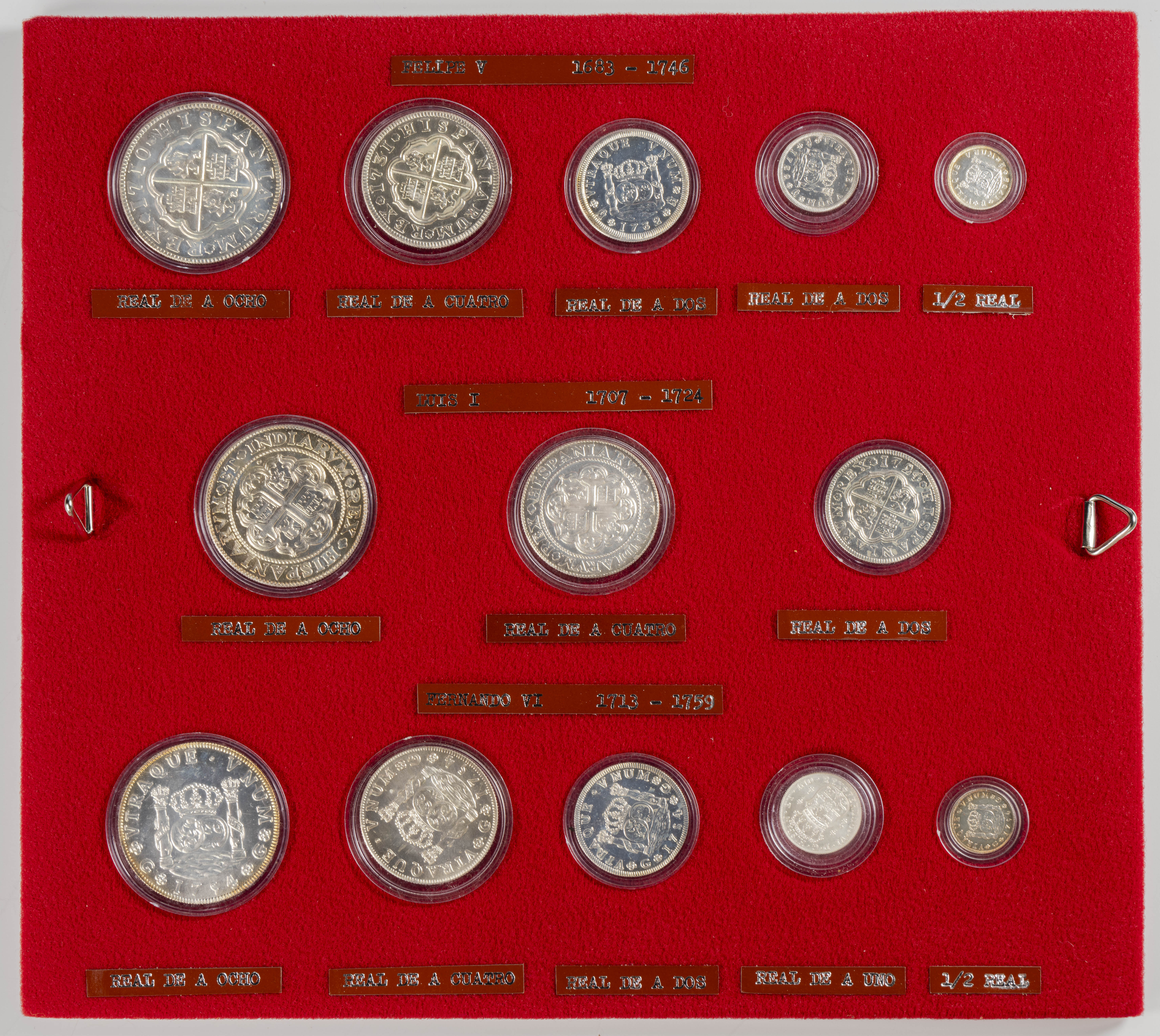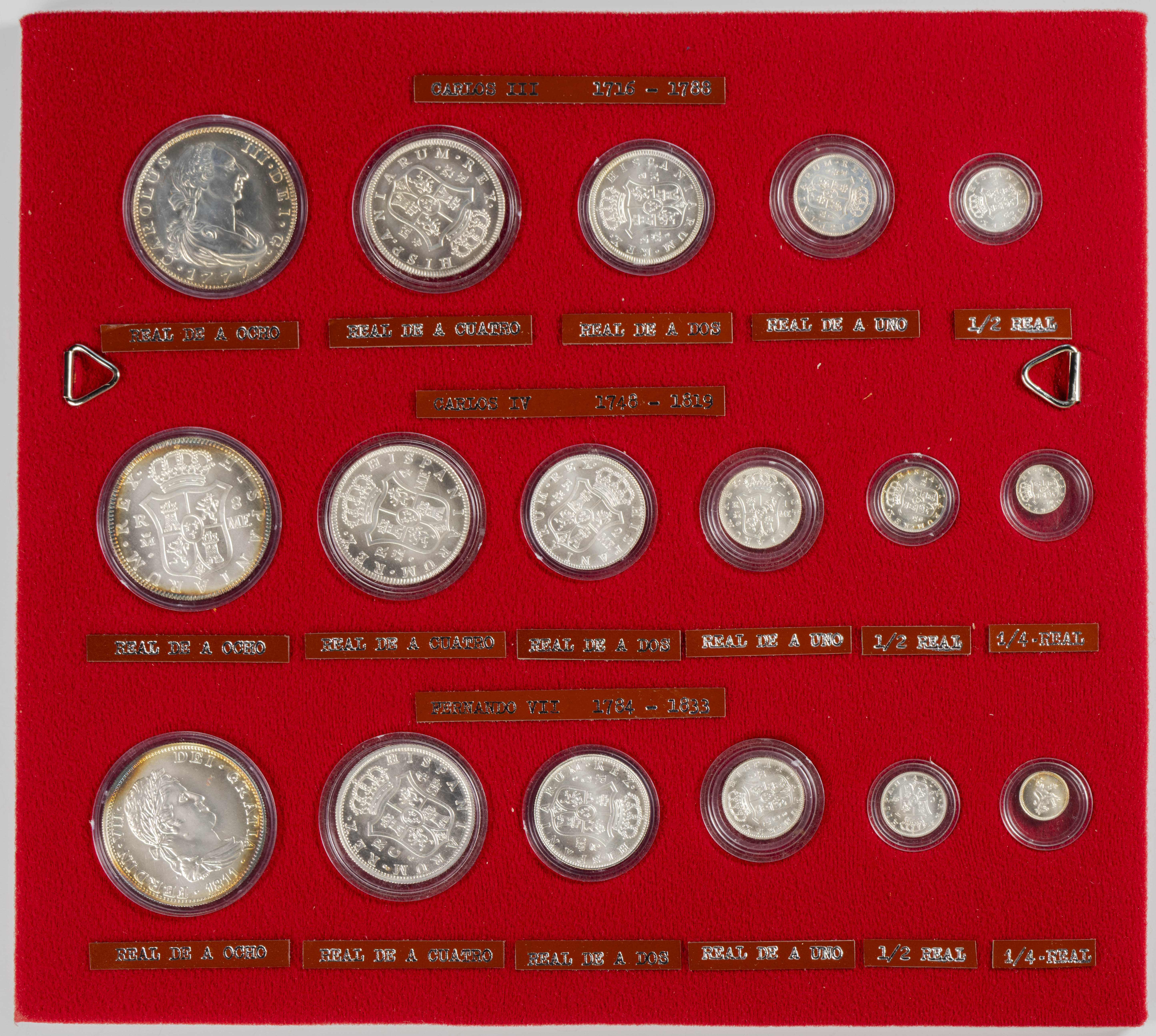 ESPAÑA. Bonita colección de 43 réplicas de moneda histórica española en plata correspondiente al periodo de la Monarquía Española y el Centenario de la Peseta. Presentada en estuche. A EXAMINAR.