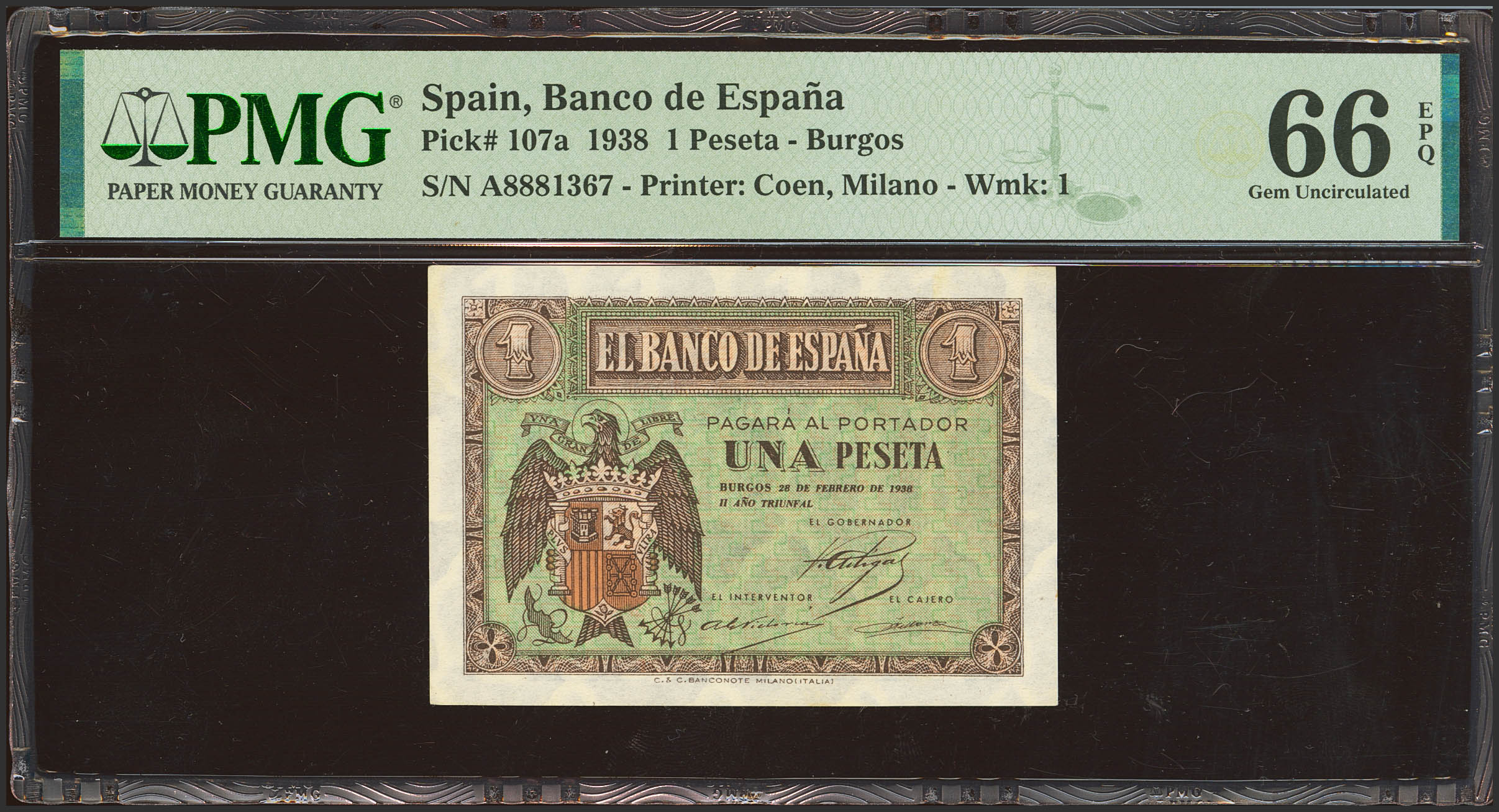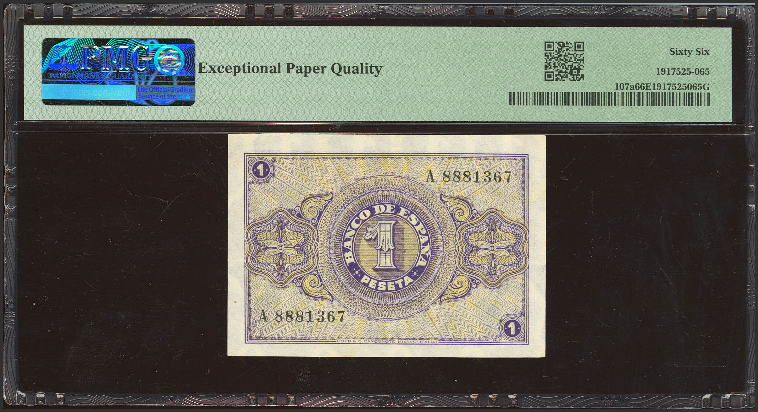 1 Pesetas. 28 de Febrero de 1938. Serie A. (Edifil 2023: 427, Pick: 107a). Apresto original. SC. Encapsulado PMG66EPQ.