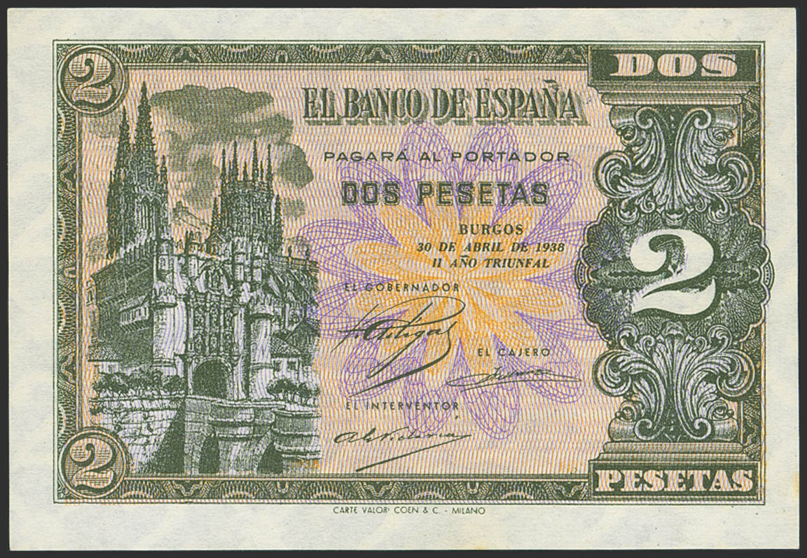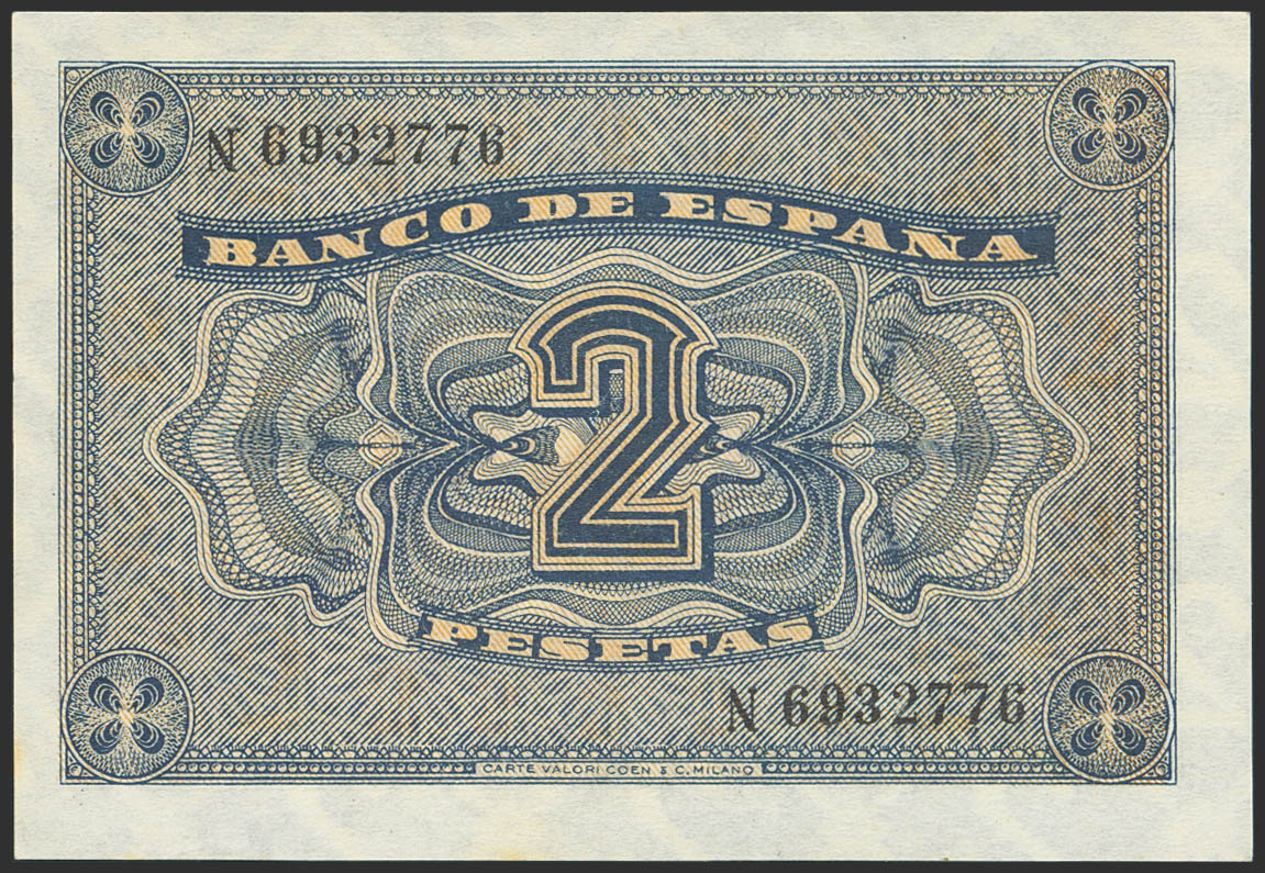 2 Pesetas. 30 de Abril de 1938. Serie N, última serie emitida. (Edifil 2023: 429b). Apresto original. SC.