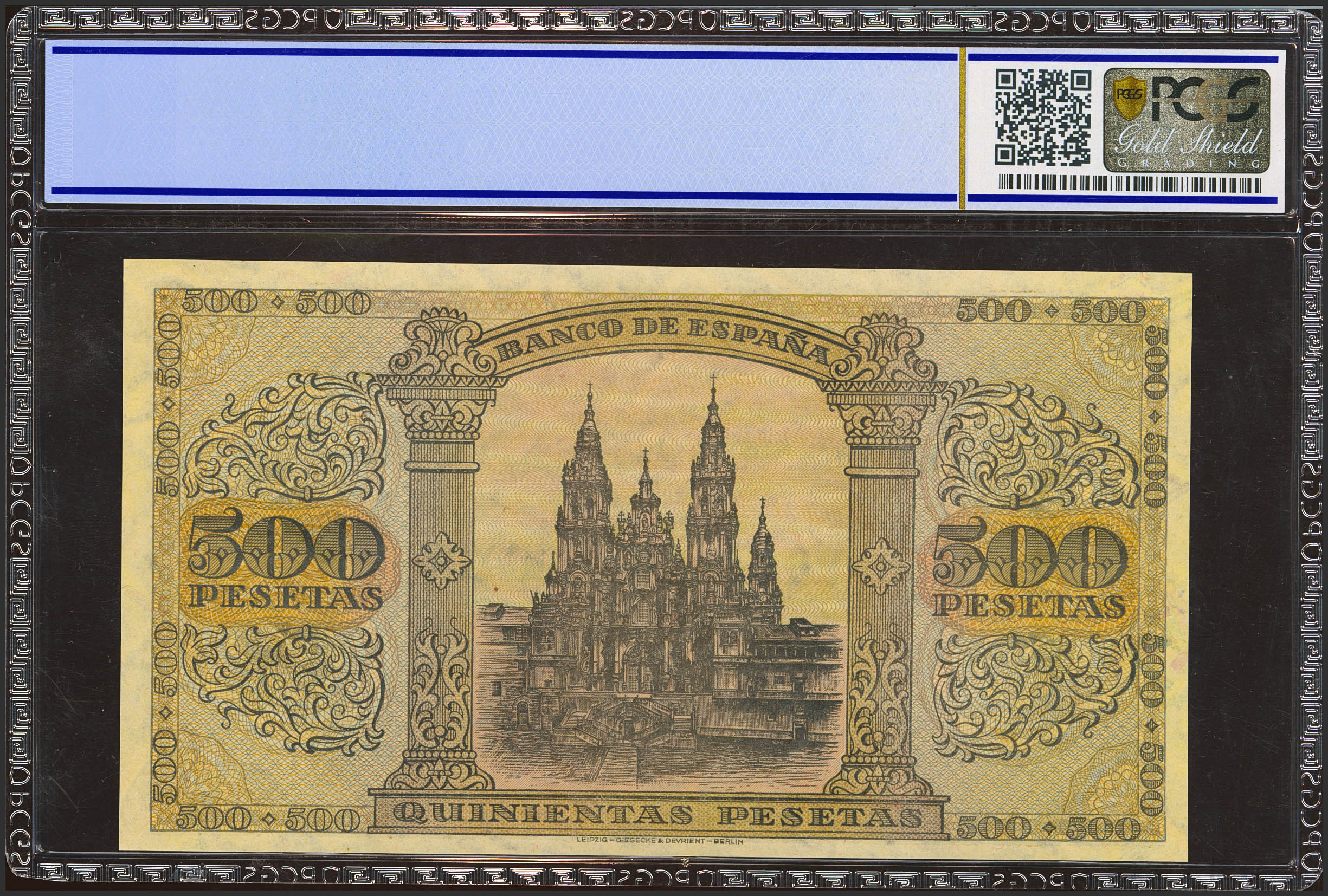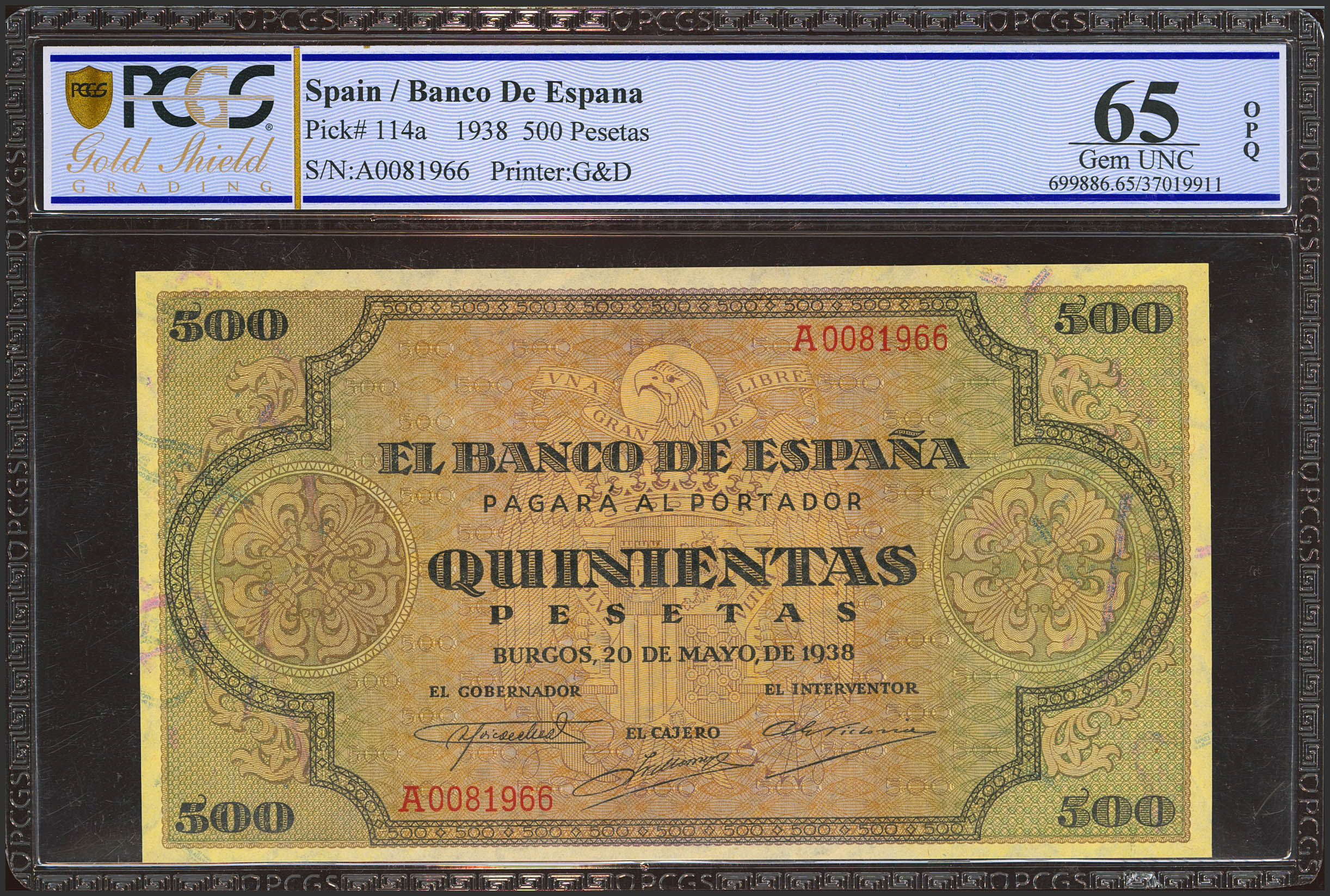 500 Pesetas. 20 de Mayo de 1938. Serie A. (Edifil 2023: 433, Pick: 114a). Muy raro en esta excepcional calidad, apresto original. SC. Encapsulado PCGS65OPQ.