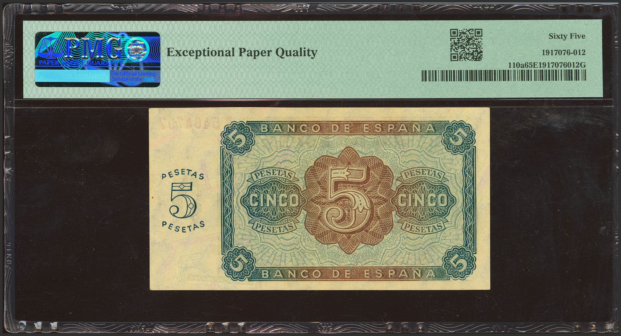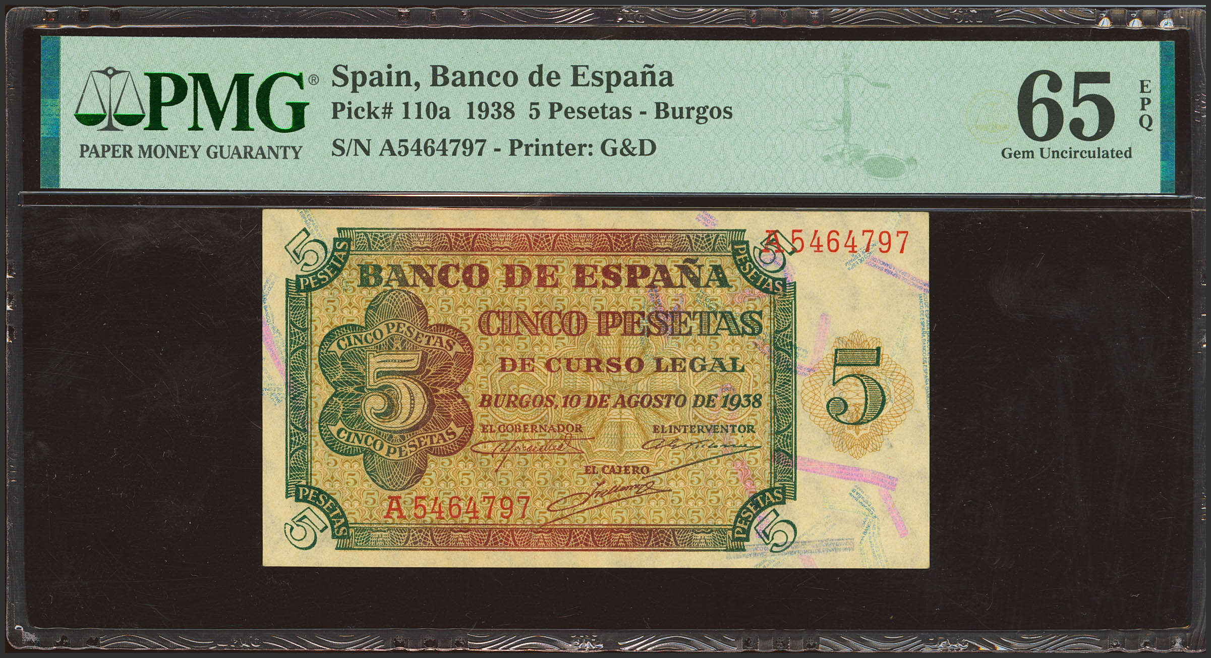 5 Pesetas. 10 de Agosto de 1938. Serie A. (Edifil 2023: 435, Pick: 110a). Raro en esta excepcional calidad, apresto original. SC. Encapsulado PMG65EPQ.