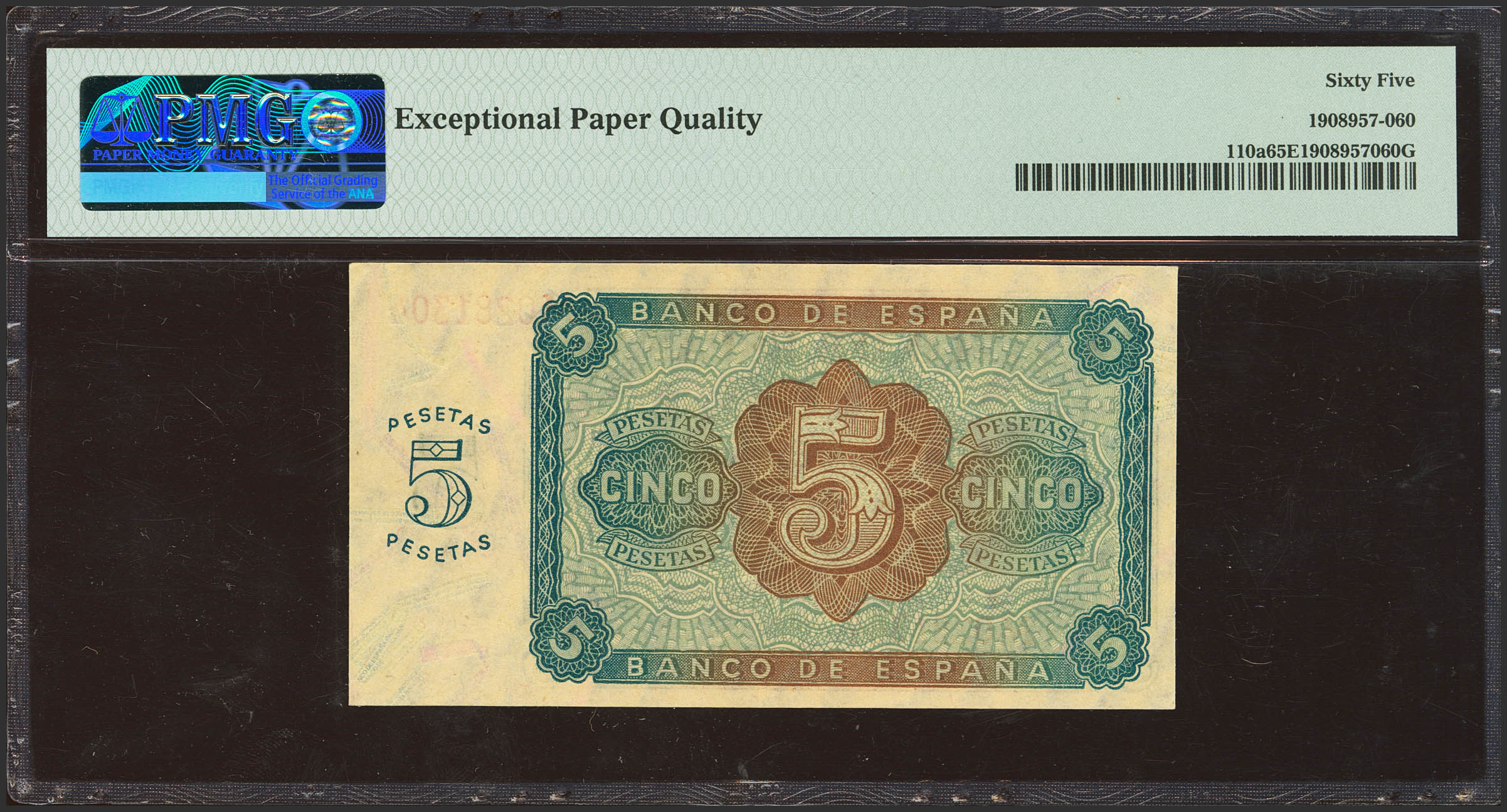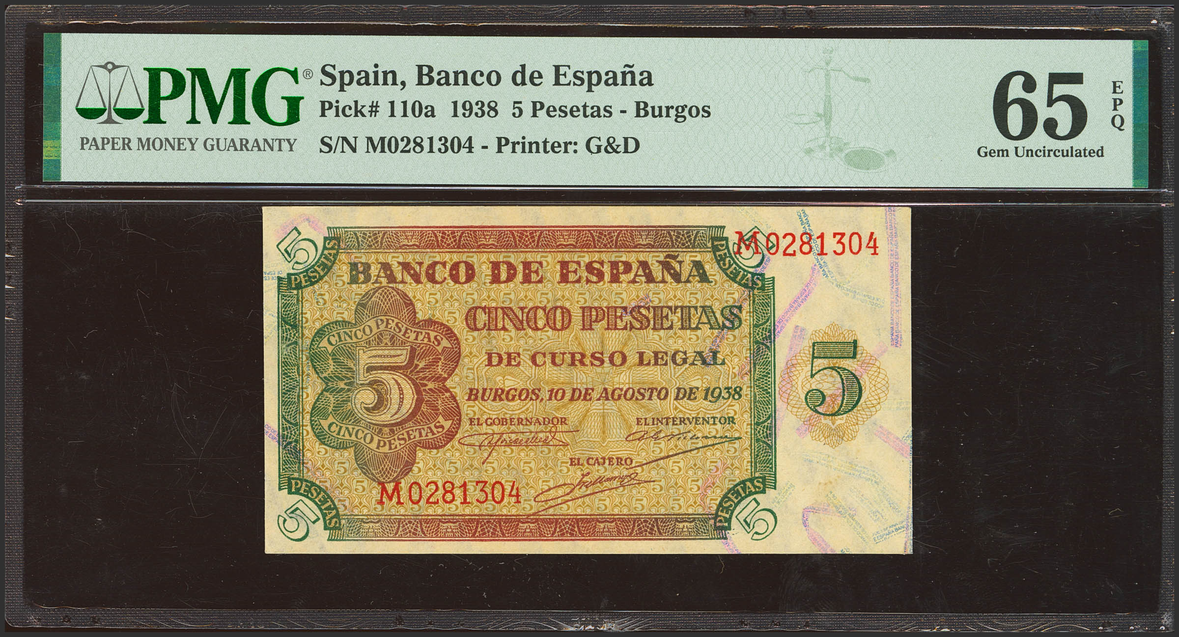 5 Pesetas. 10 de Agosto de 1938. Serie M, última serie emitida. (Edifil 2023: 435b, Pick: 110a). Rarísima serie, especialmente en esta rara calidad, apresto original. SC. Encapsulado PMG65EPQ.