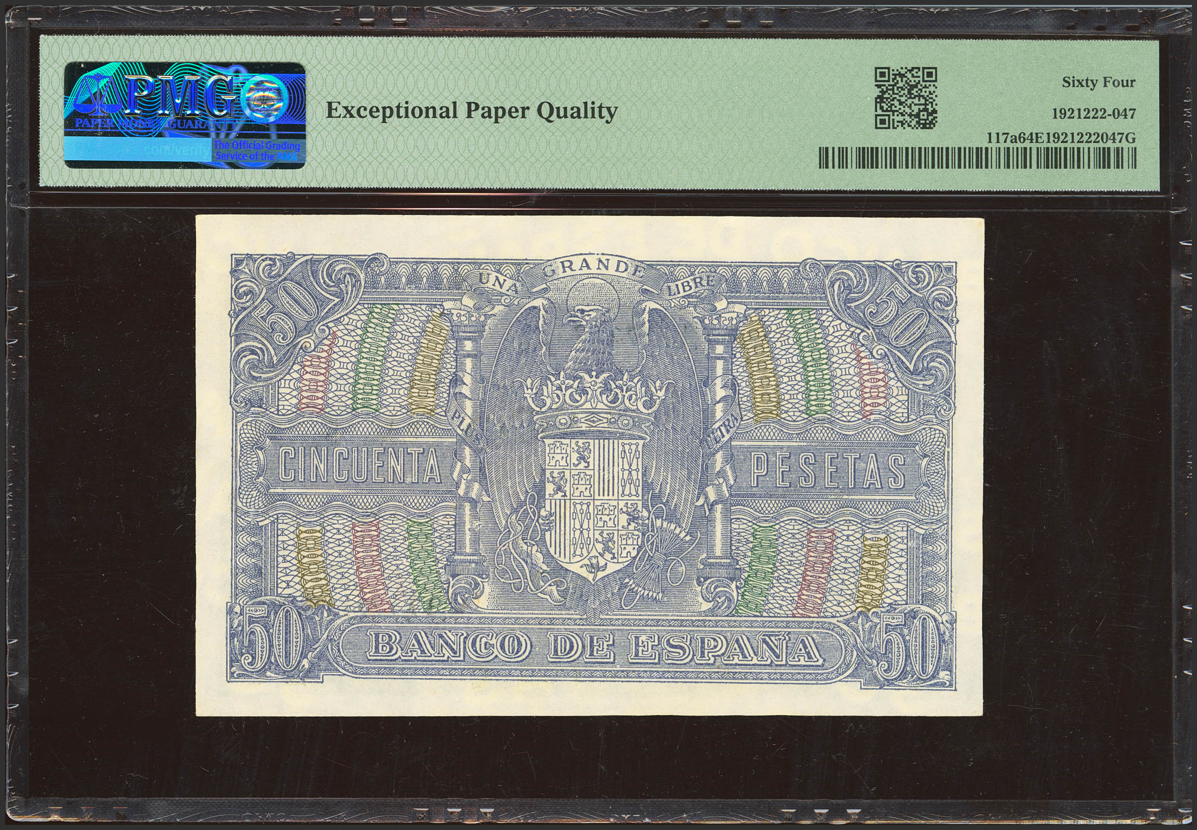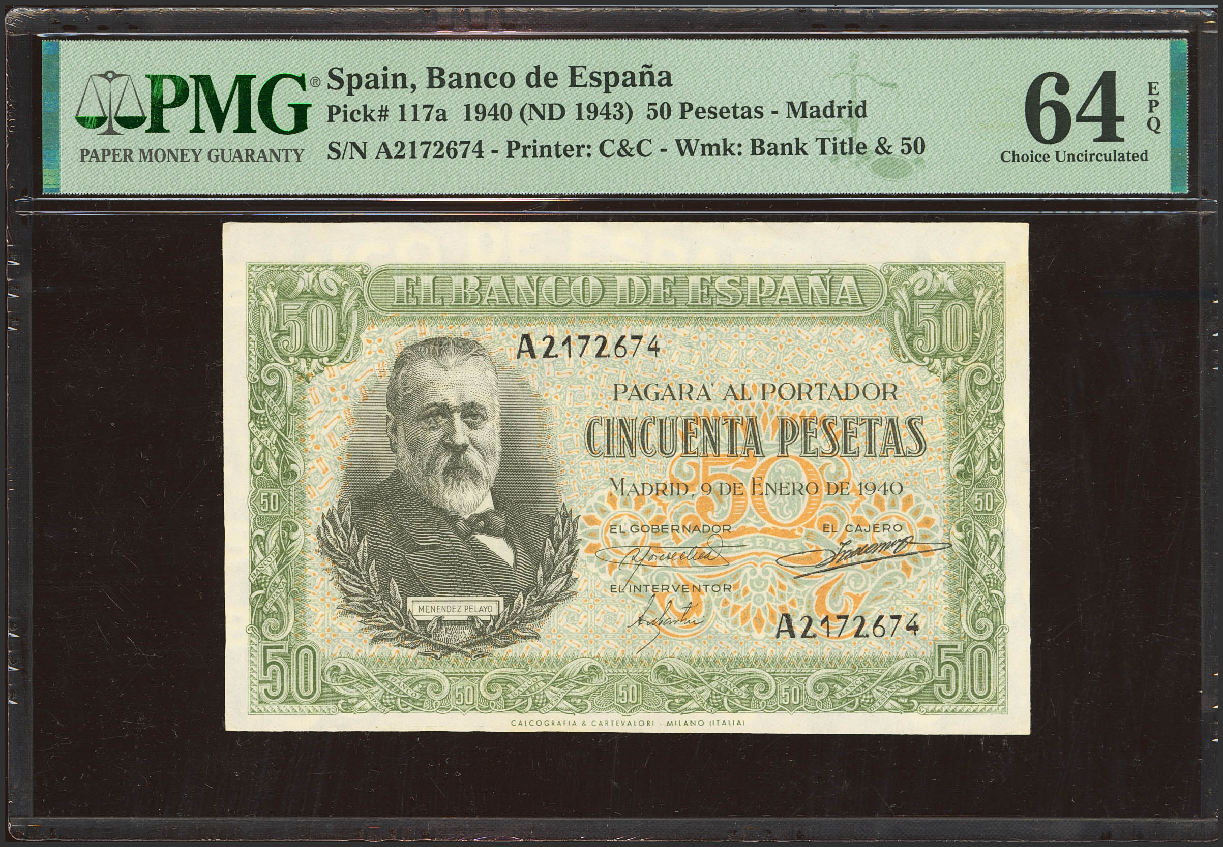 50 Pesetas. 9 de Enero de 1940. Serie A. (Edifil 2023: 437, Pick: 117a). Raro en esta calidad, apresto original. SC. Encapsulado PMG64EPQ.