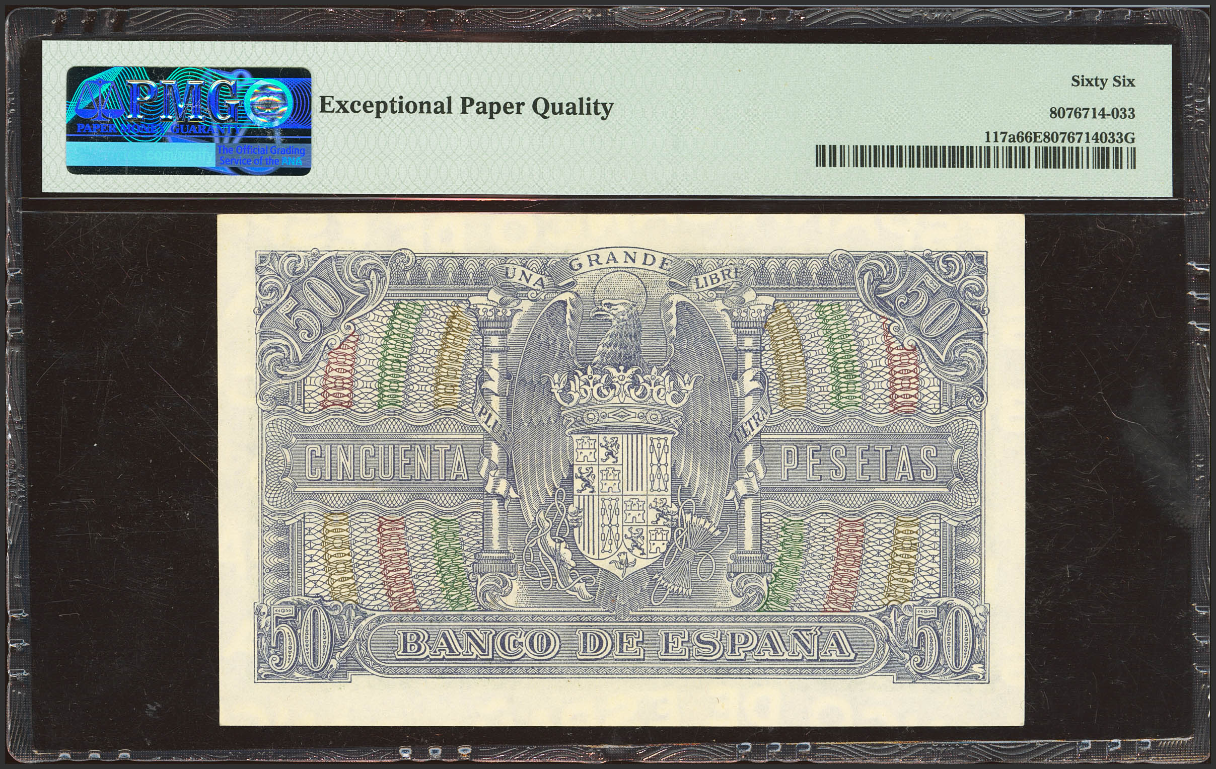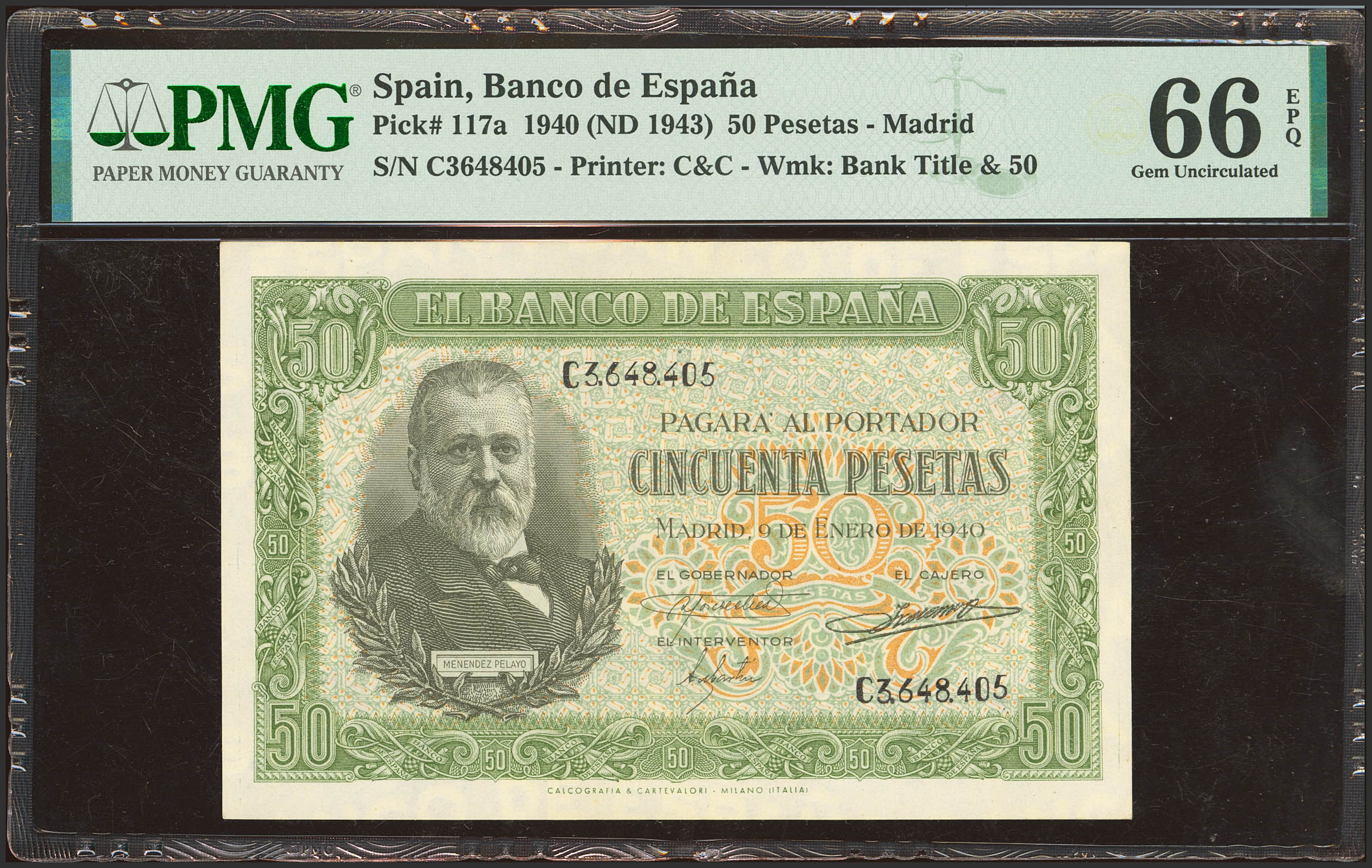 50 Pesetas. 9 de Enero de 1940. Serie C. (Edifil 2023: 437a, Pick: 117a). Raro en esta excepcional calidad, apresto original. SC. Encapsulado PMG66EPQ