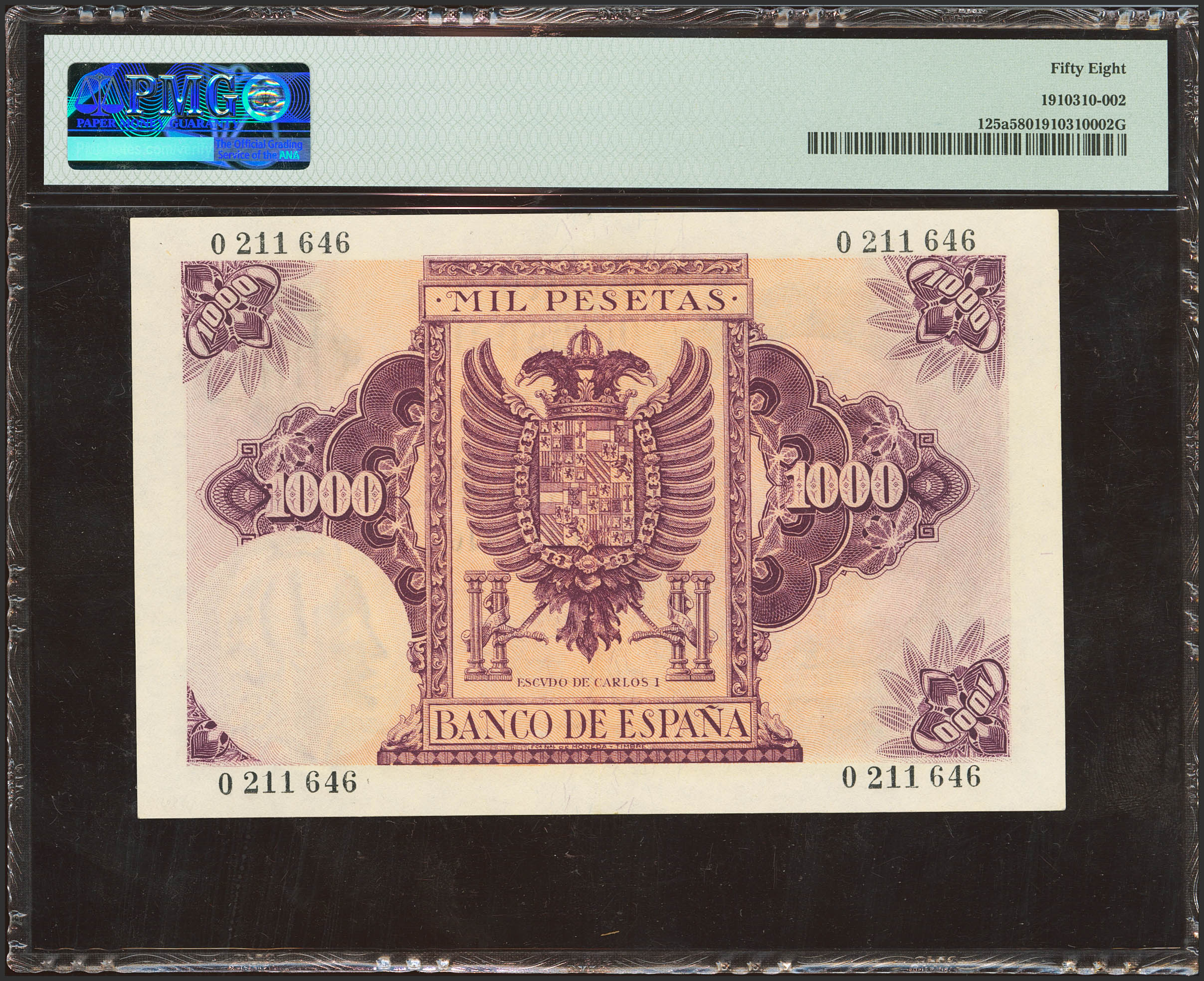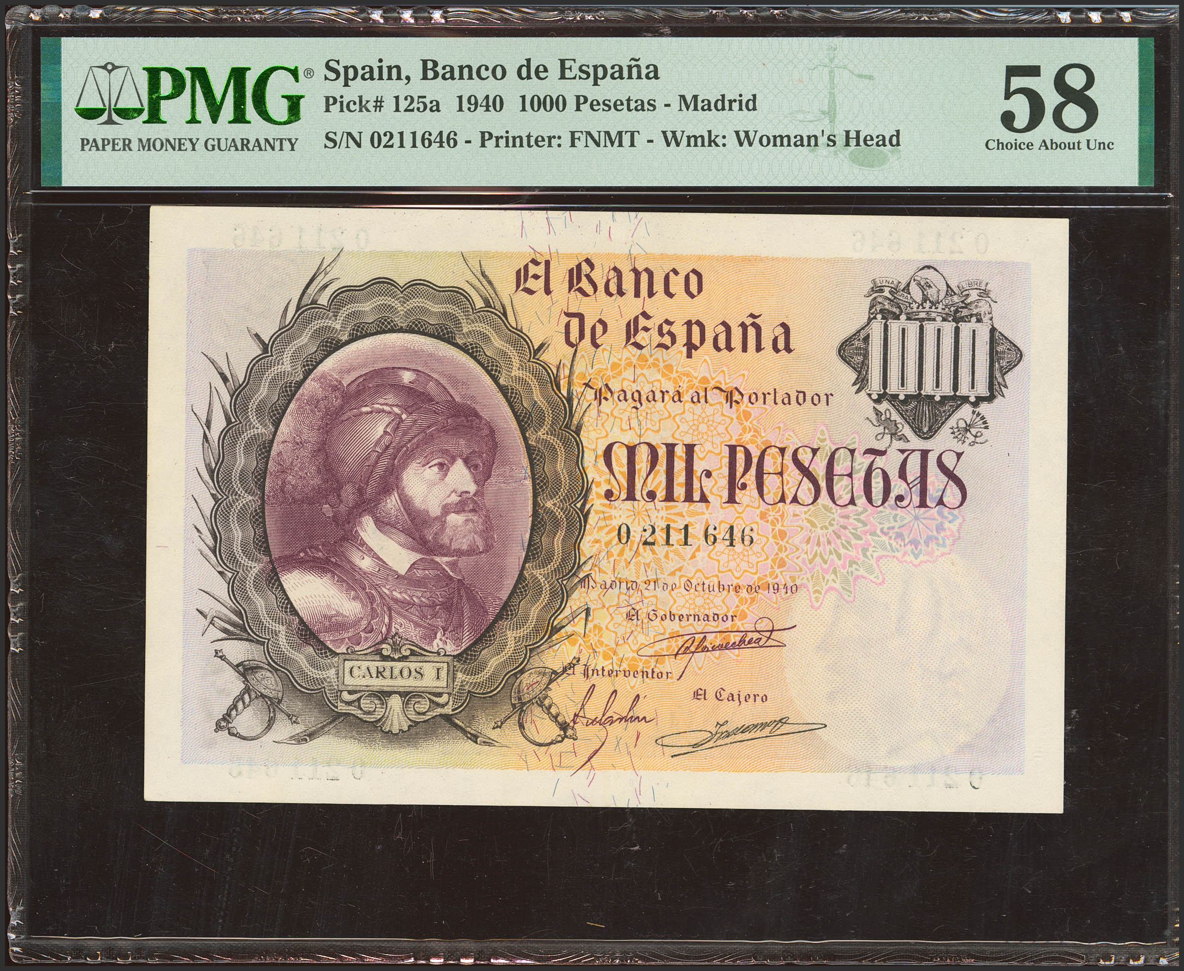 1000 Pesetas. 21 de Octubre de 1940. Sin serie. (Edifil 2023: 445, Pick: 125a). Rarísimo en esta calidad. EBC+. Encapsulado PMG58.