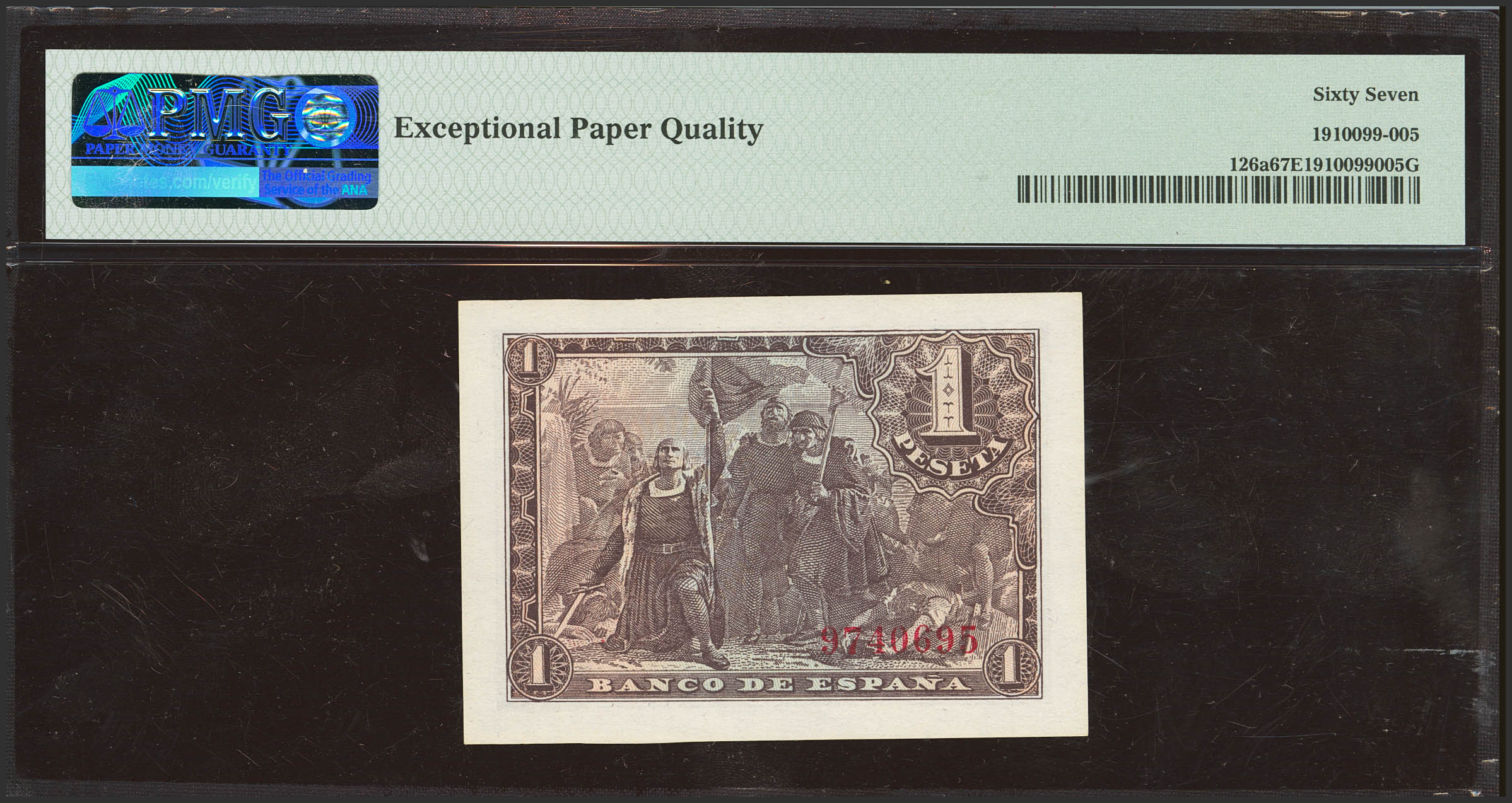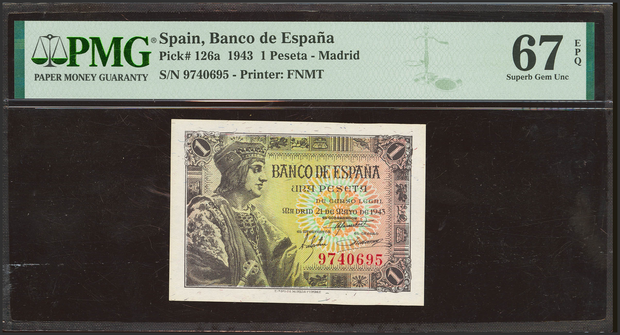1 Peseta. 21 de Mayo de 1943. Sin serie. (Edifil 2023: 447, Pick: 126a). Inusual en esta calidad, apresto original. SC. Encapsulado PMG67EPQ