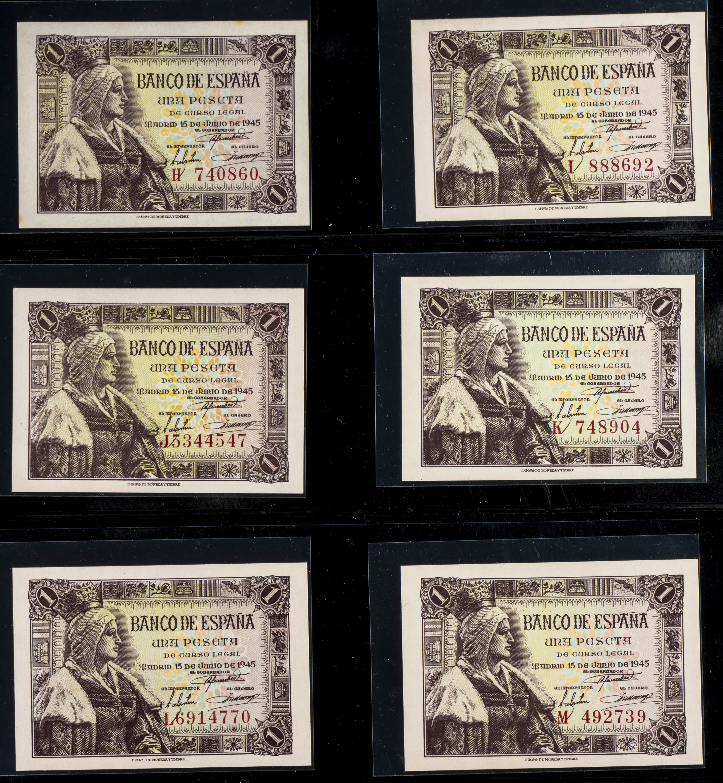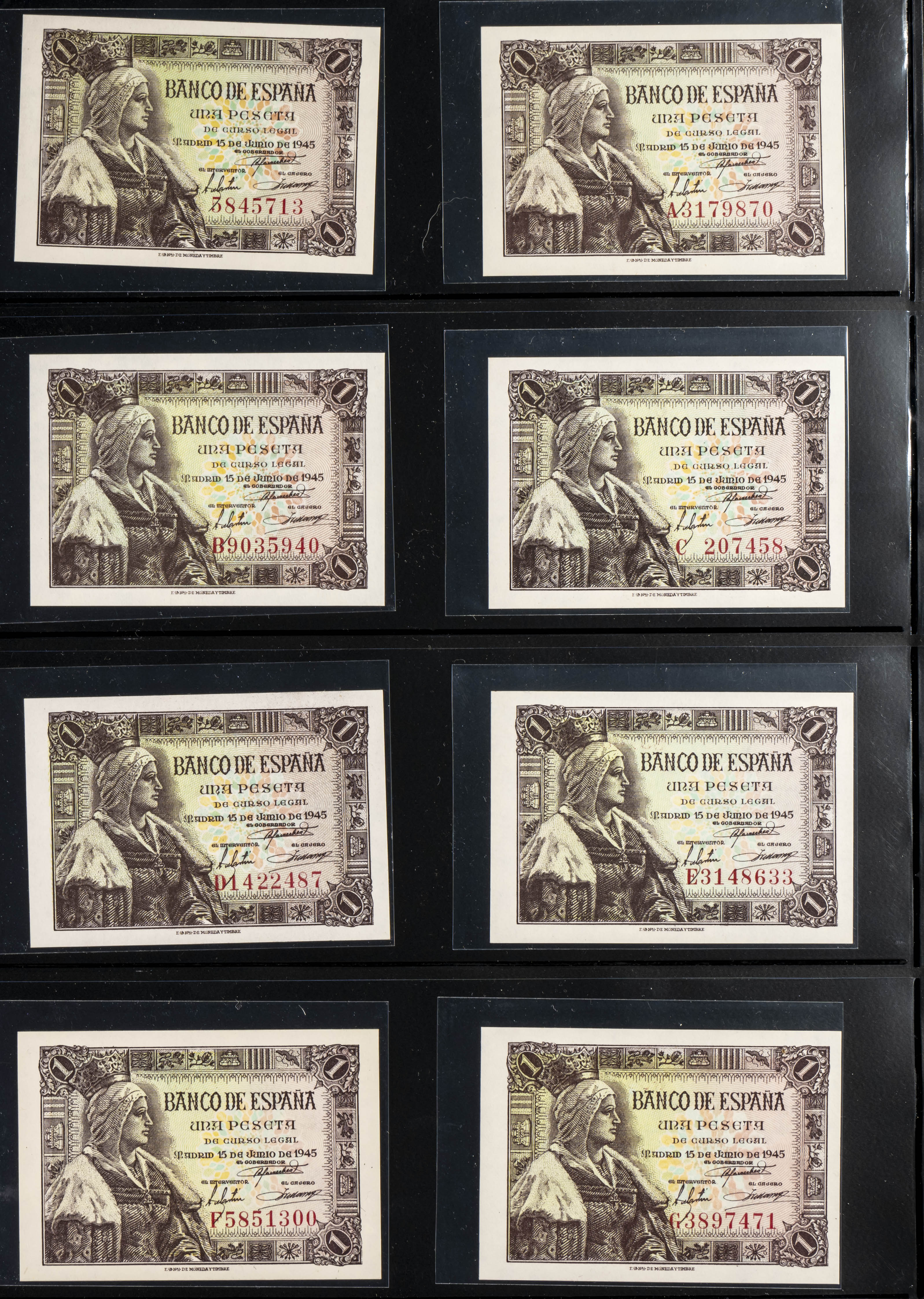 Conjunto de 14 billetes de 1 Peseta emitidos el 15 de Junio de 1945, uno de ellos sin serie y todas las demás series A, B, C, D, E, F, G, H, I, J, K, L, M (última serie emitida). (Edifil 2023: 448, 448a, 448b). Conservando en la mayoría de ellos el apresto original. SC/SC-.
