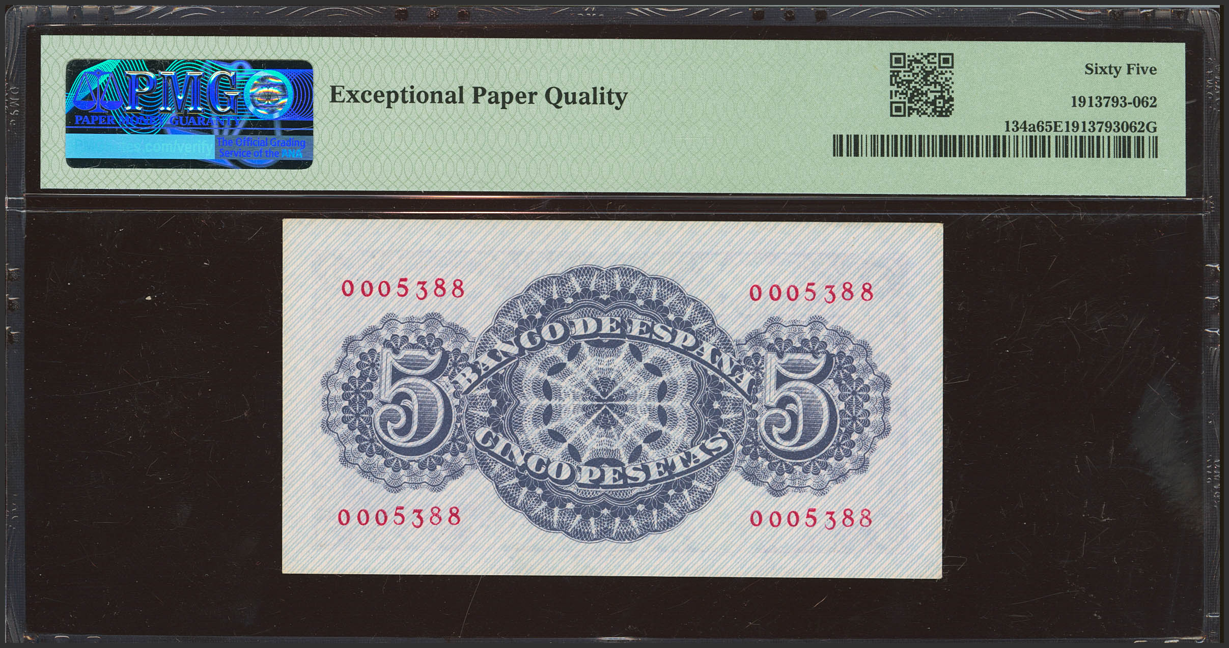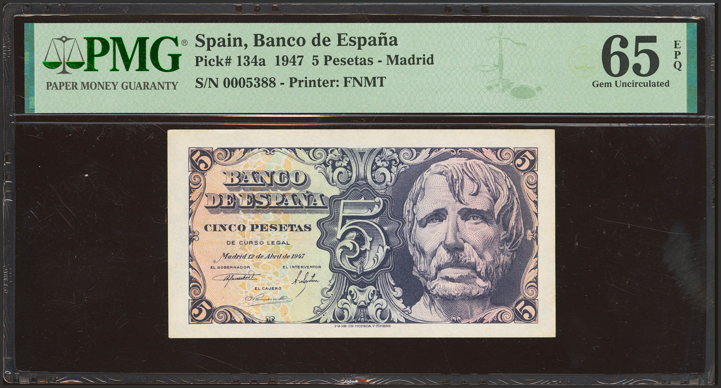 5 Pesetas. 12 de Abril de 1947. Sin serie y numeración bajísima. (Edifil 2023: 454, Pick: 134a). Inusual en esta calidad, apresto original. SC. Encapsulado PMG65EPQ.