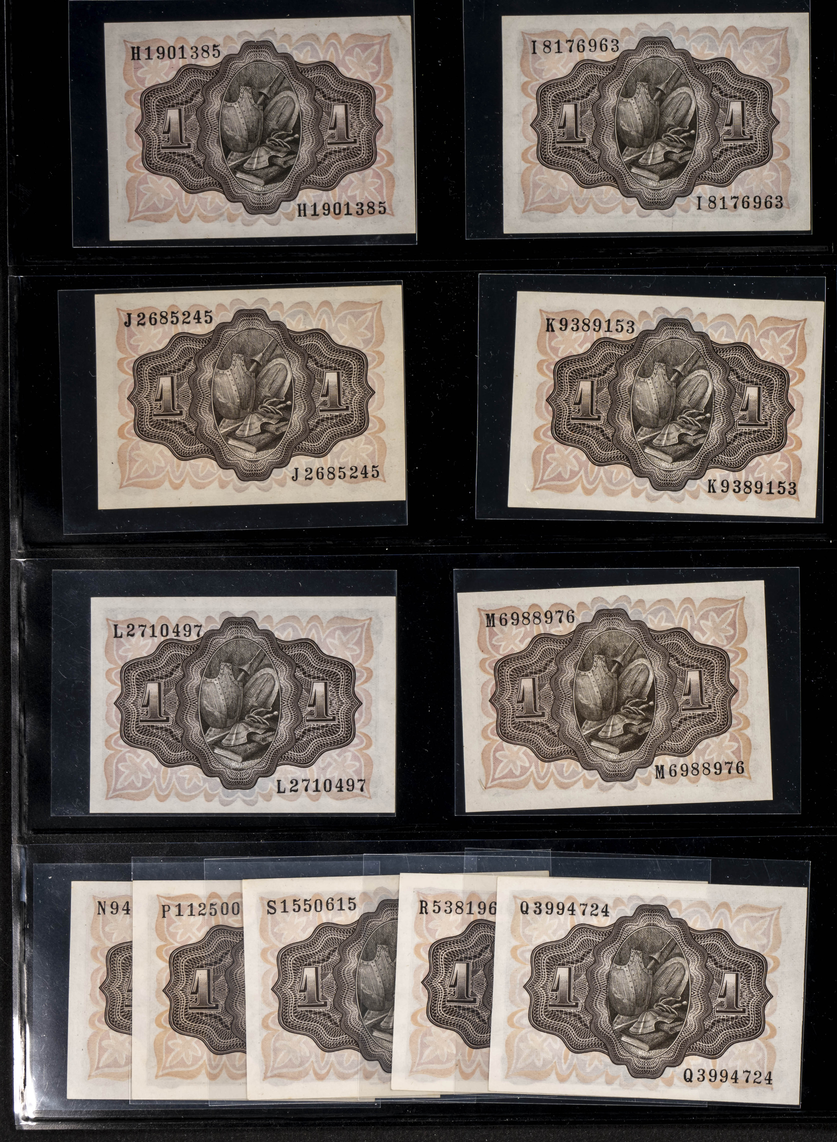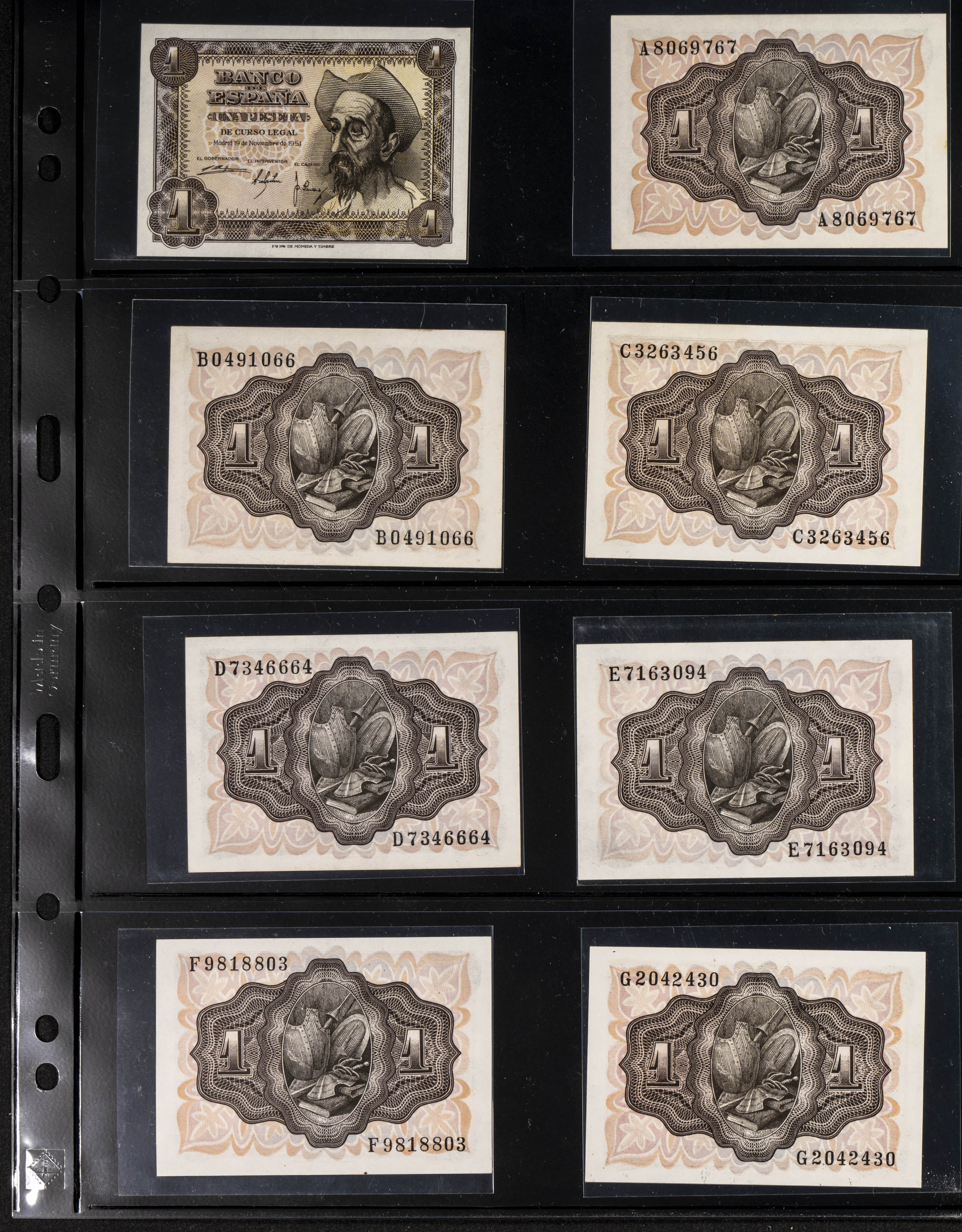 Conjunto de 19 billetes de 1 Peseta de 19 de Noviembre de 1951, uno de ellos sin serie y todas las demás series A, B, C, D , E, F, G, H, I, J, K, L, M, N, P, Q, P, R y S. (Edifil 2023: 461, 461a). Conservando en la mayoría de ellos el apresto original. SC/SC--.