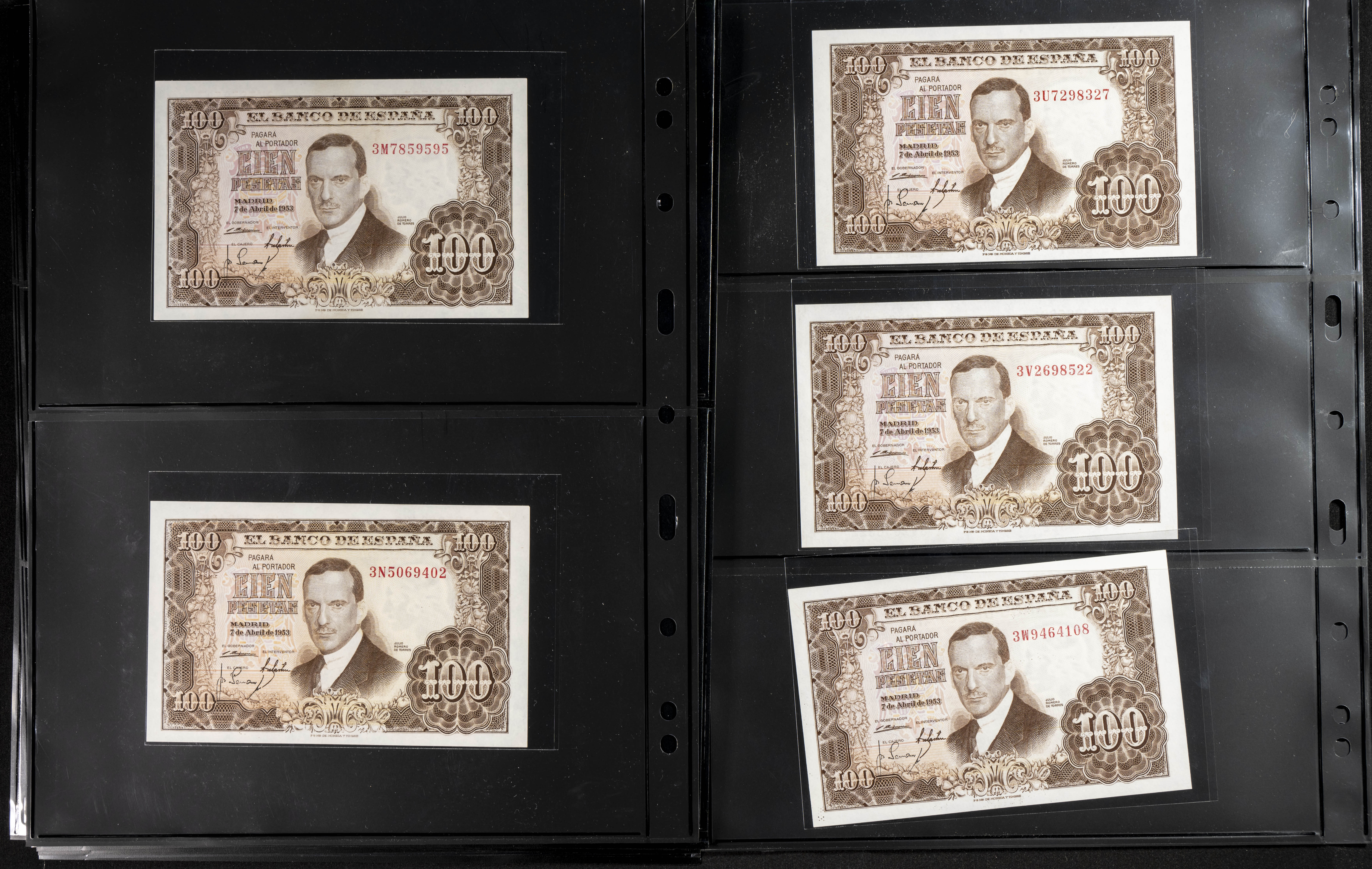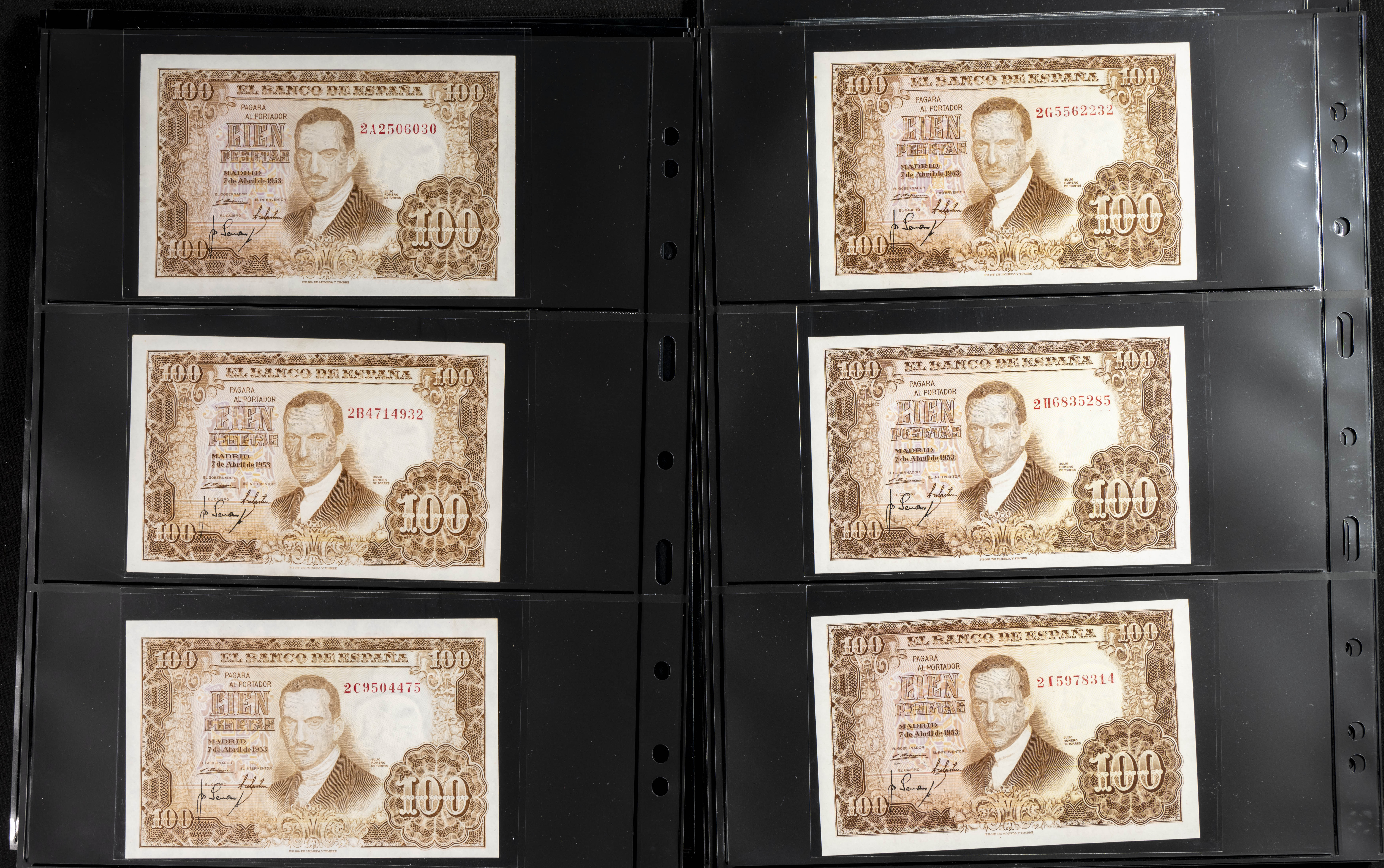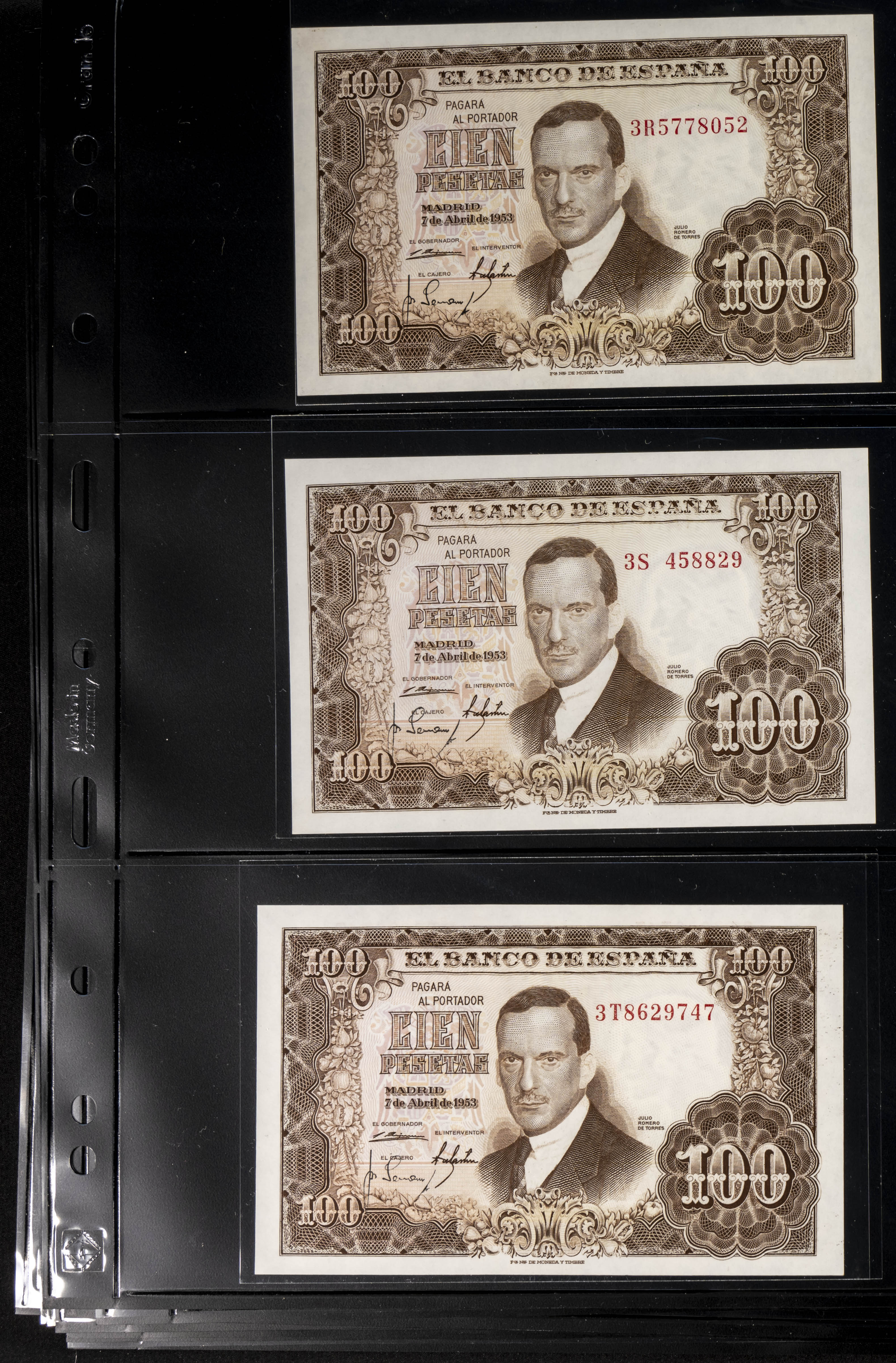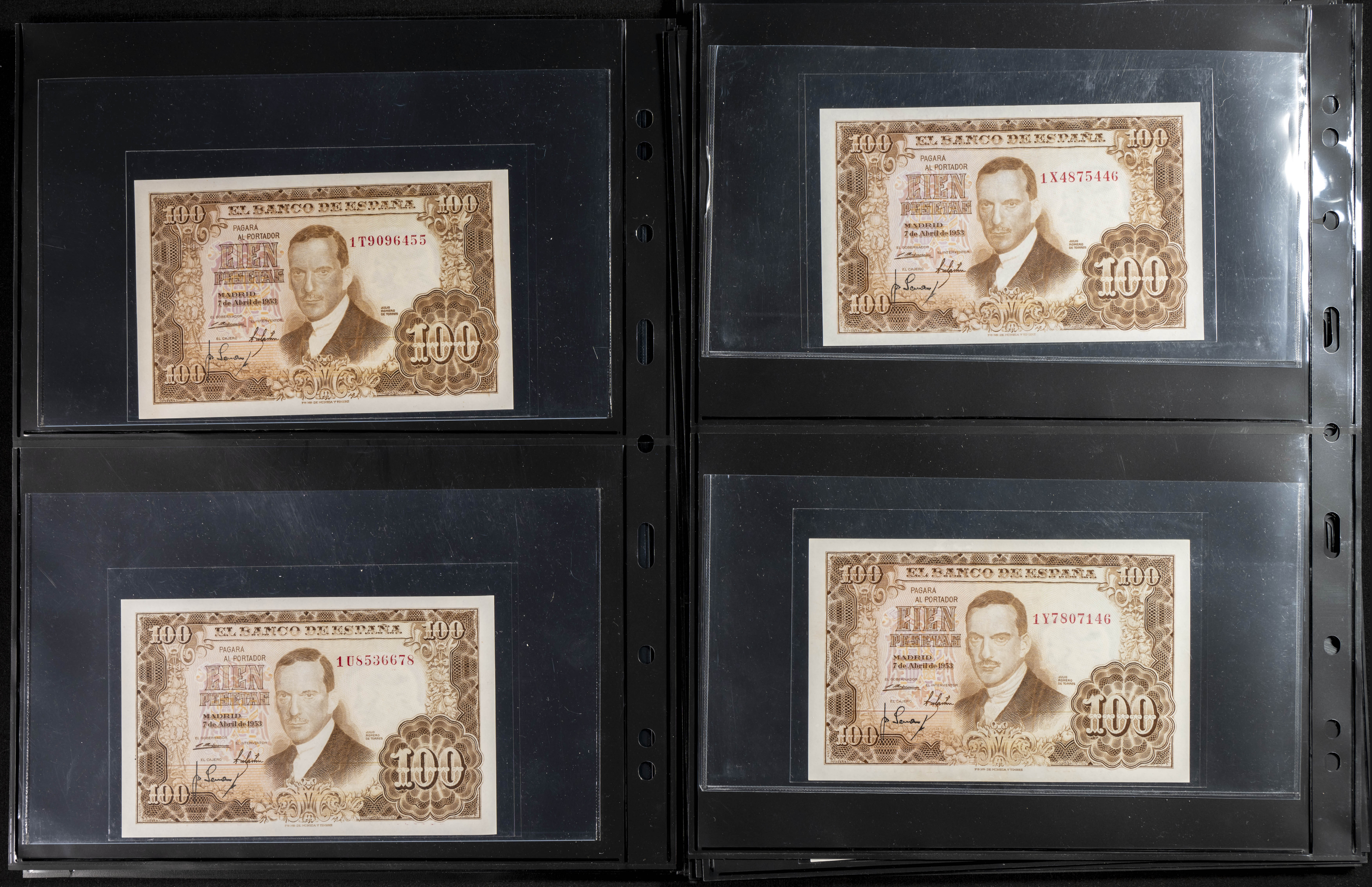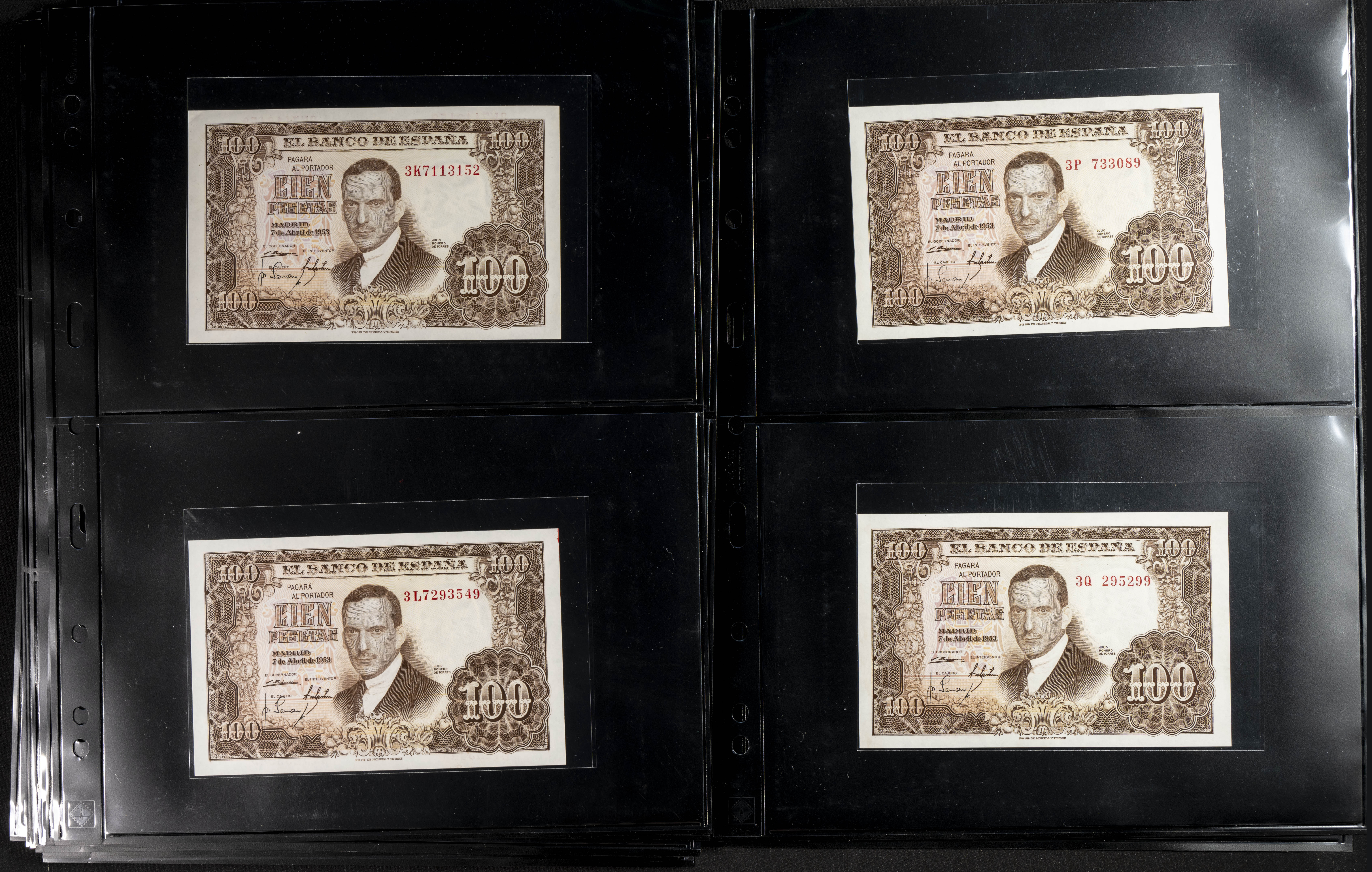 Conjunto de más de 75 billetes de 100 Pesetas emitidos el 7 de Abril de 1953, todos ellos con series diferentes. (Edifil 2023: 464, 464b, 464c). La gran mayoría en buena conservación, conservando en la mayoría de ellos el apresto original. A EXAMINAR.