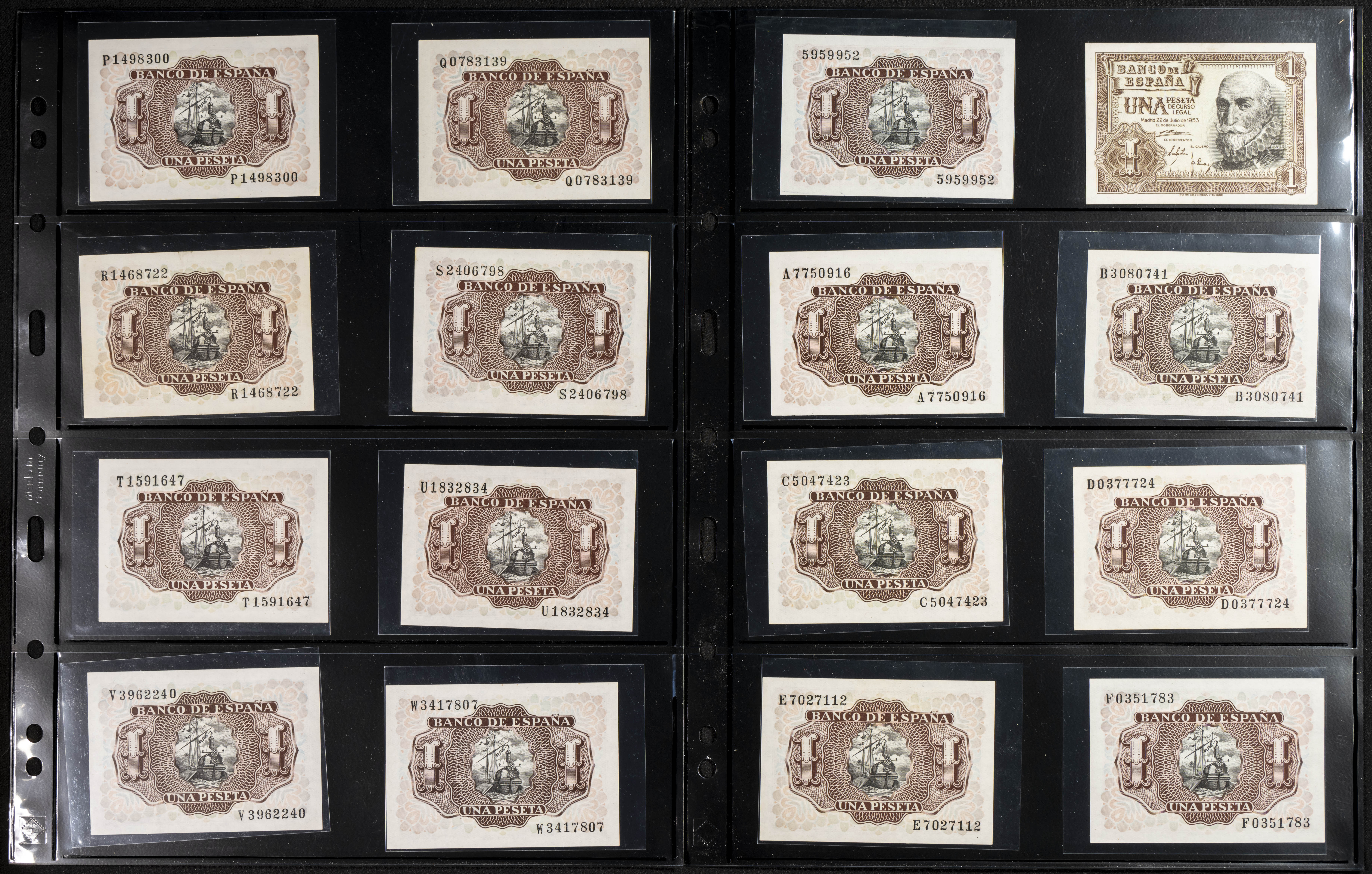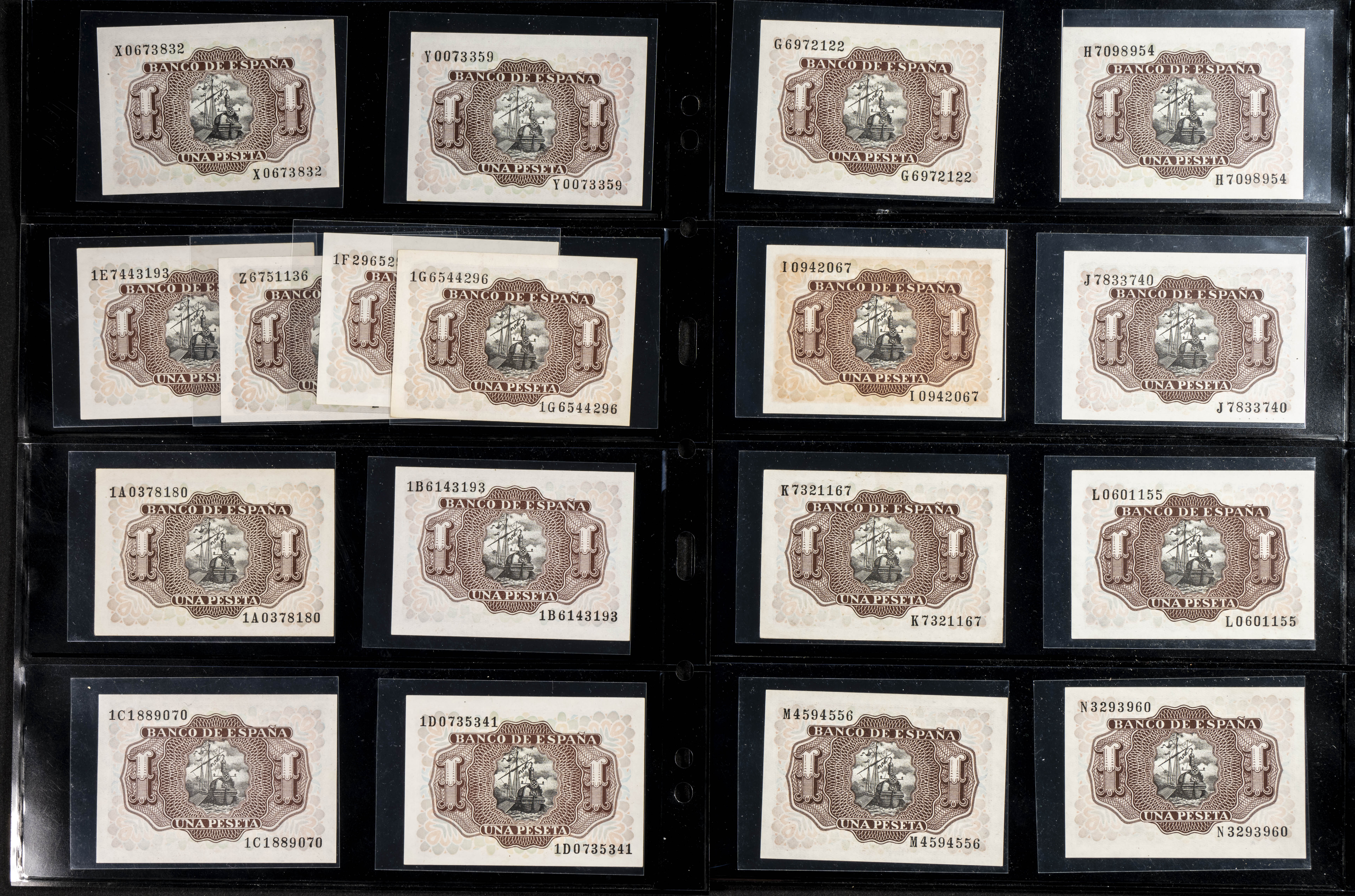 Conjunto de 34 billetes de 1 Peseta de 22 de Julio de 1953, uno de ellos sin serie y series A, B, C, D , E, F, G, H, I, J, K, L, M, N, P, Q, P, R, S, T, U, V, W, X(2), Y, Z, 1A, 1B, 1C, 1D, 1E, 1F, 1G (útlima serie emitida). (Edifil 2023: 465, 465a, 465b). Conservando en la mayoría de ellos el apresto original. SC/SC--.