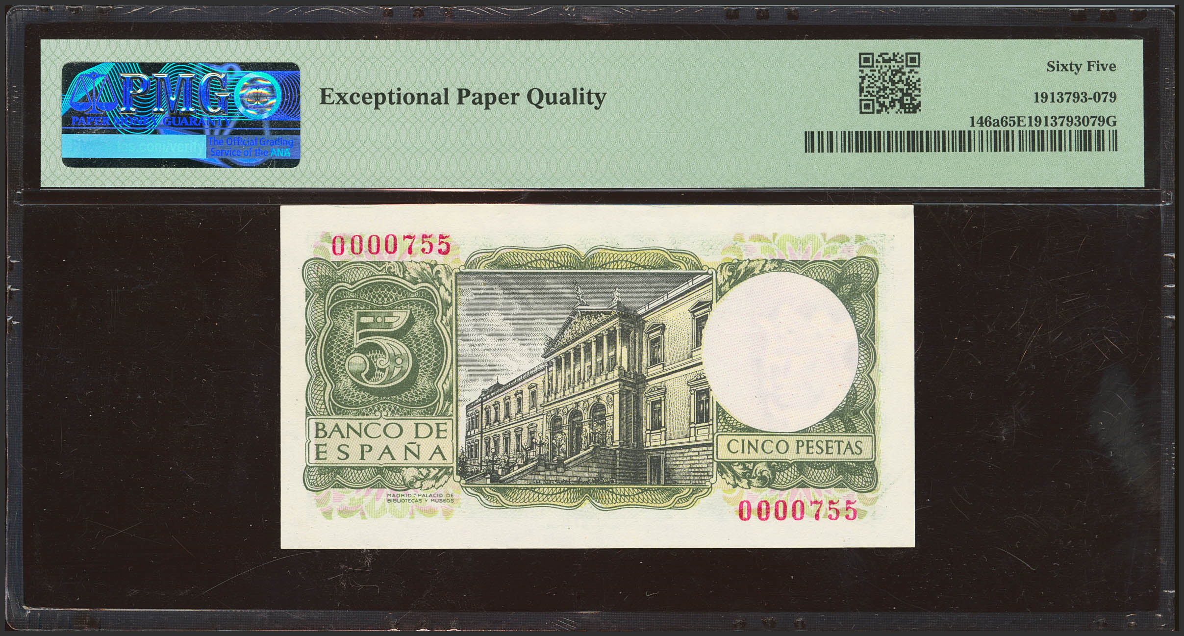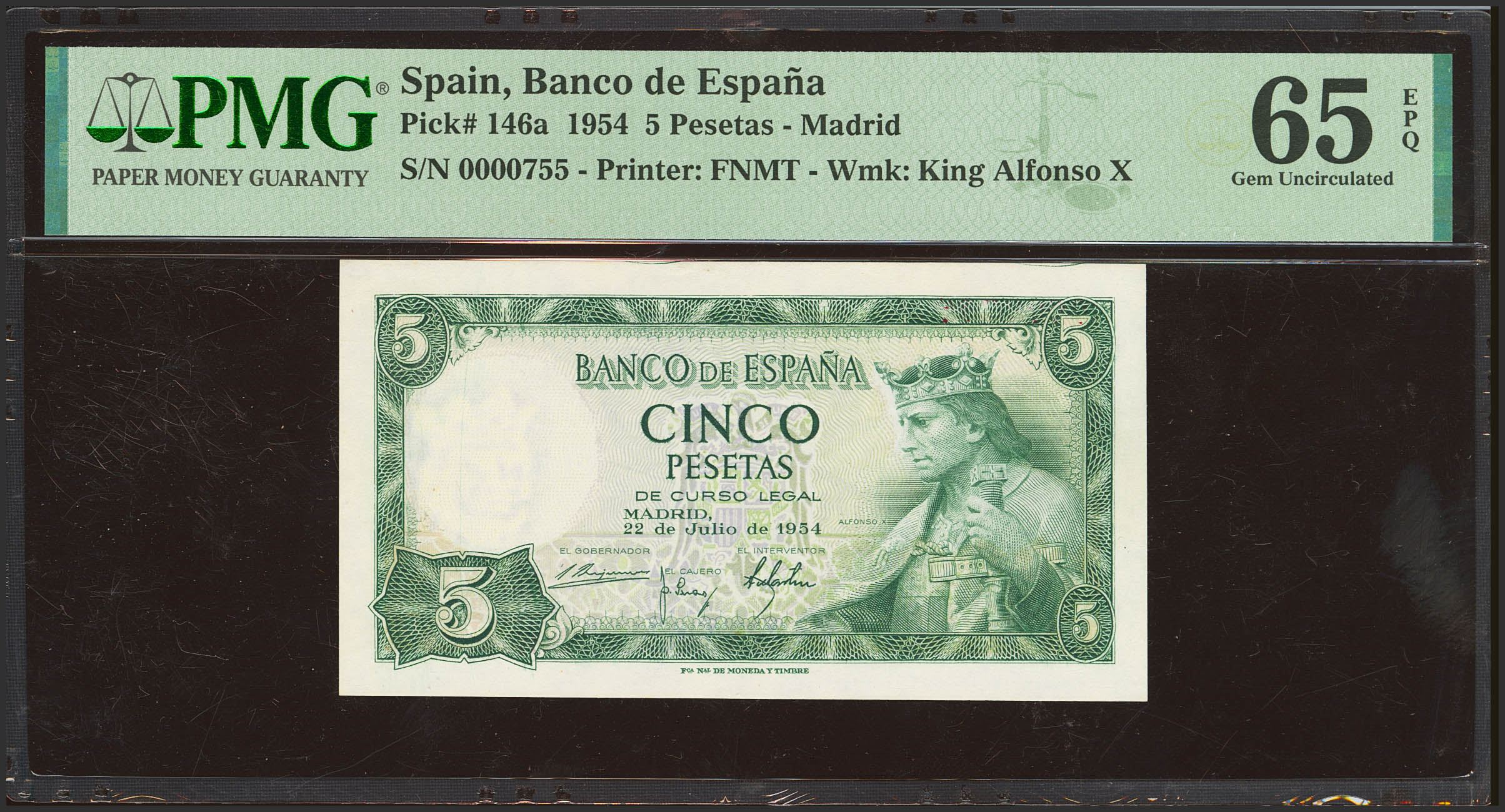 5 Pesetas. 22 de Julio de 1954. Sin serie y numeración bajísima (Nº0000755). (Edifil 2021: 466, Pick: 146a). Raro en esta excepcional calidad, apresto original. SC. Encapsulado PMG65EPQ.