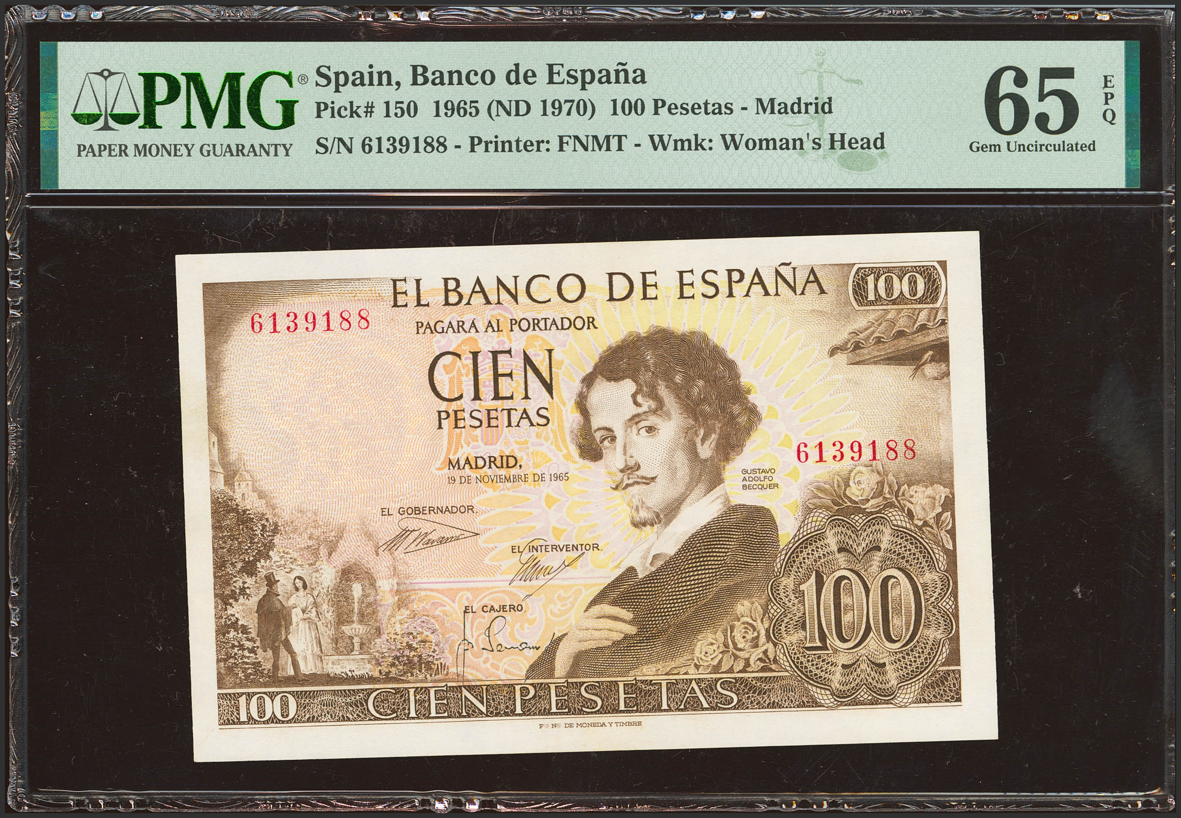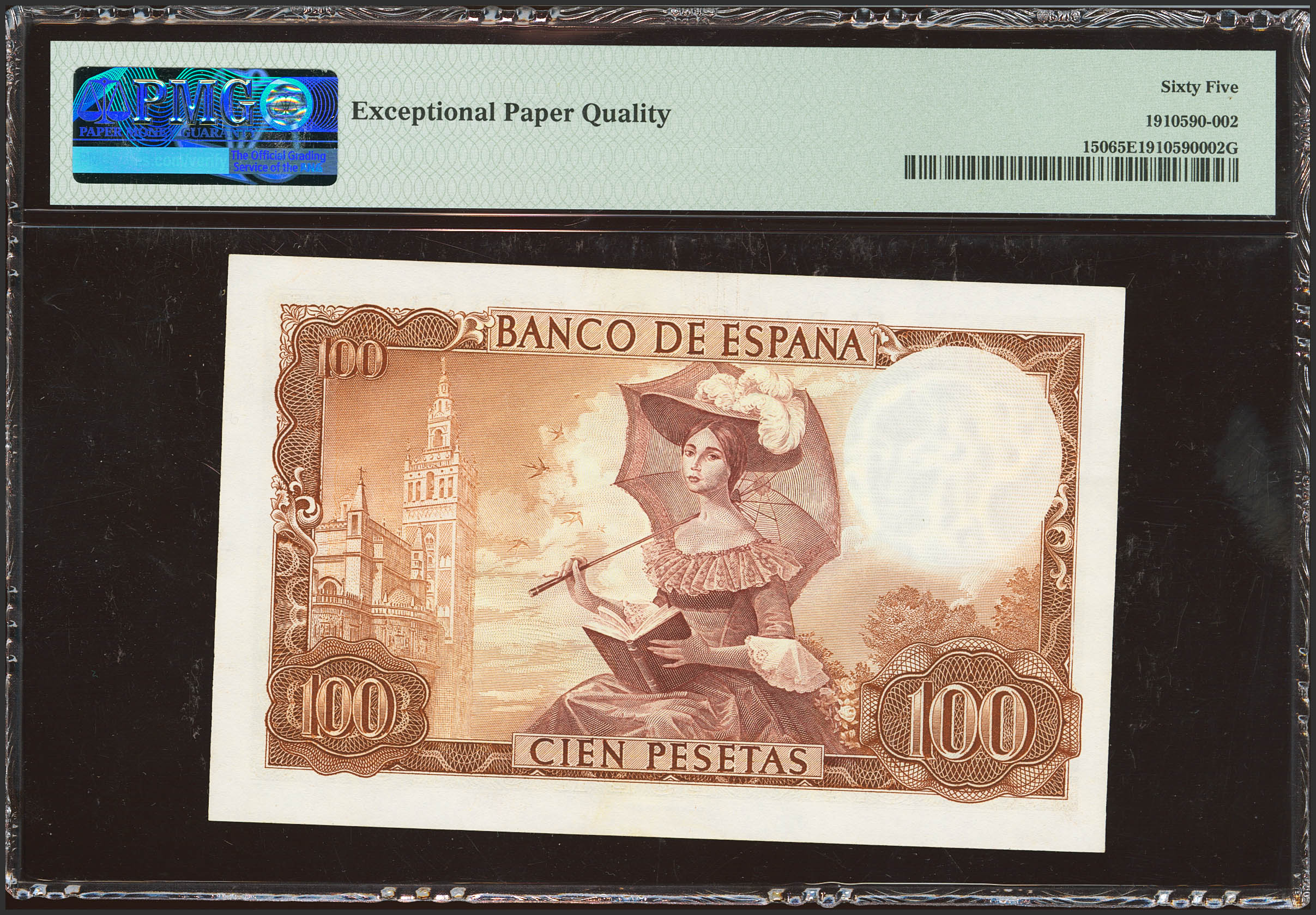 100 Pesetas. 19 de Noviembre de 1965. Sin serie. (Edifil 2023: 470, Pick: 150). Apresto original. SC. Encapsulado PMG65EPQ.