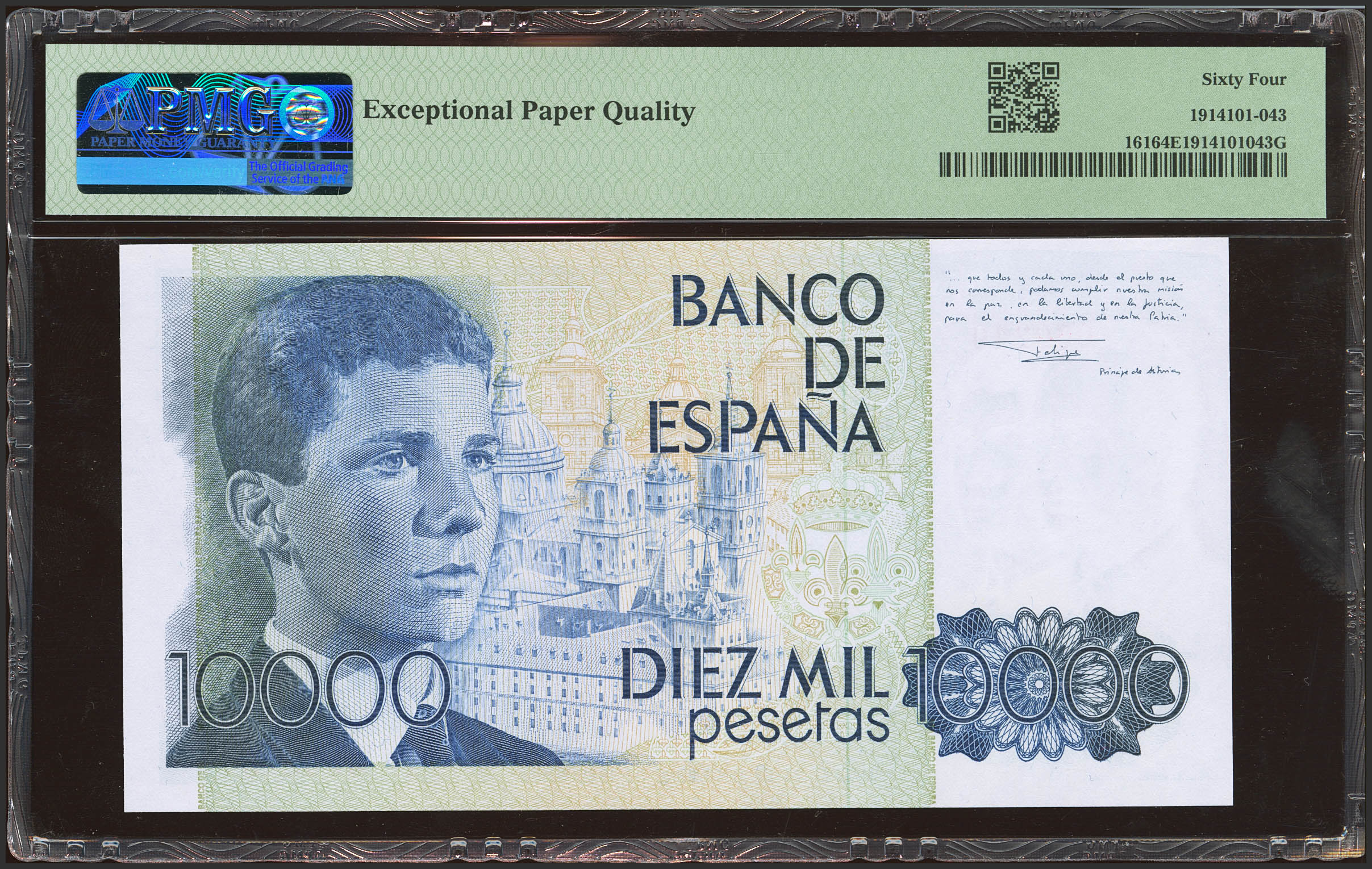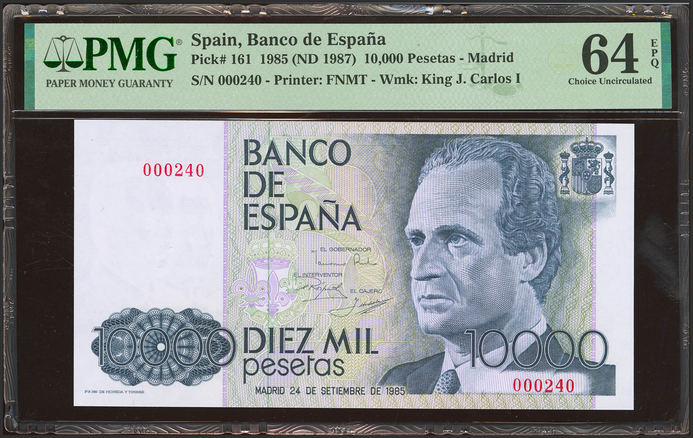 10000 Pesetas. 24 de Septiembre de 1985. Sin serie y numeración bajísima (Nº000240). (Edifil 2023: 481, Pick: 161). SC. Encapsulado PMG64EPQ.