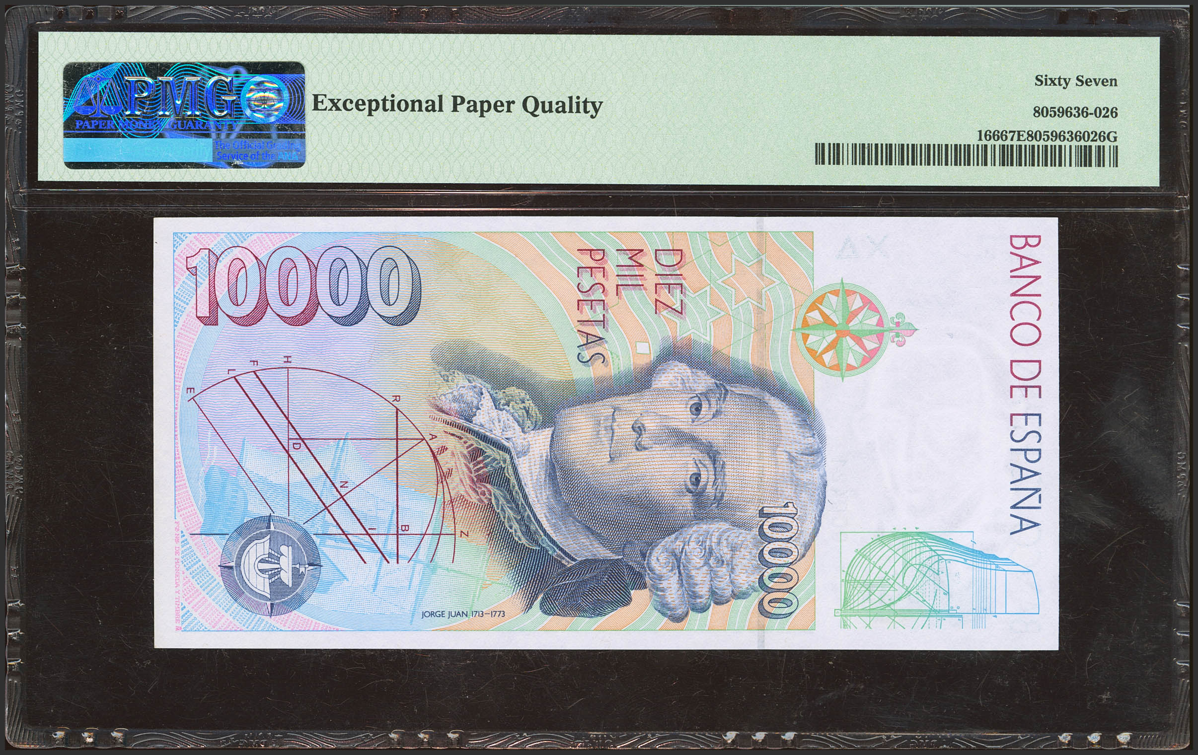 10000 Pesetas. 12 de Octubre de 1992. Sin serie y numeración bajísima (Nº000421). (Edifil 2023: 485, Pick: 166). SC. Encapsulado PMG67EPQ.