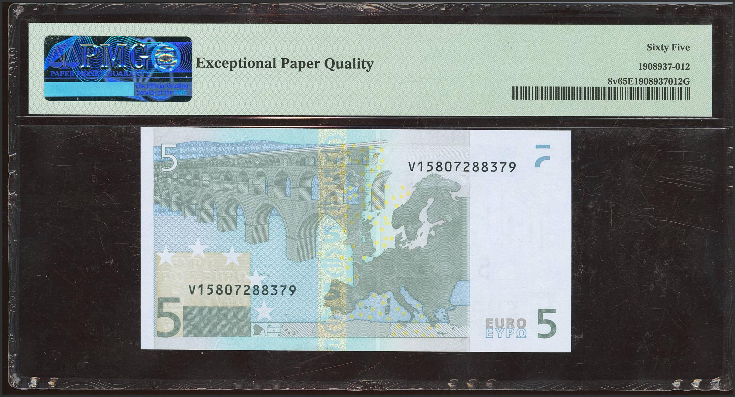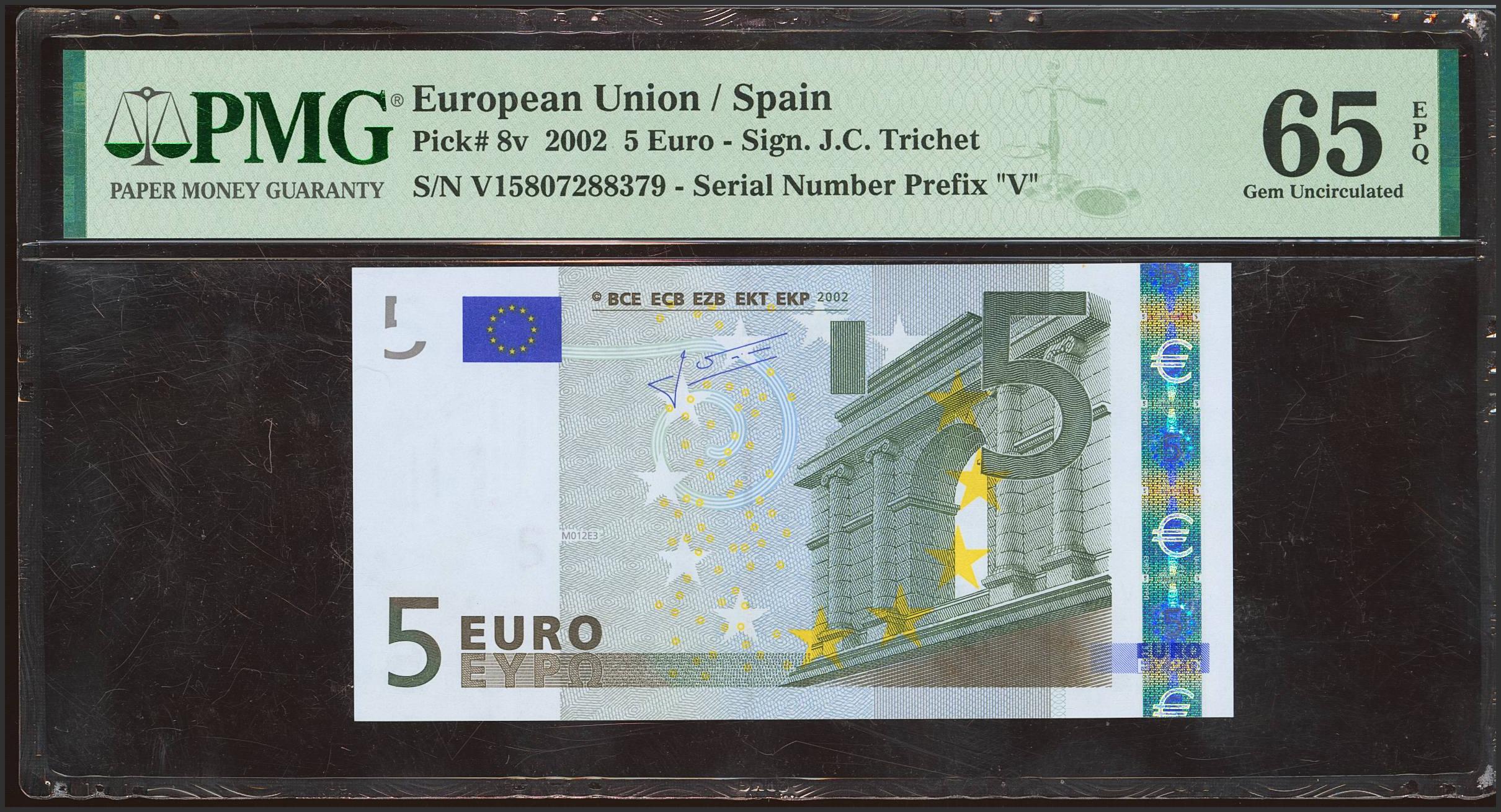 5 Euros. 1 de Enero de 2002. Firma Trichet. Serie V (España). (Edifil 2023: 486A, Pick: 8v). Apresto original. SC. Encapsulado PMG65EPQ.