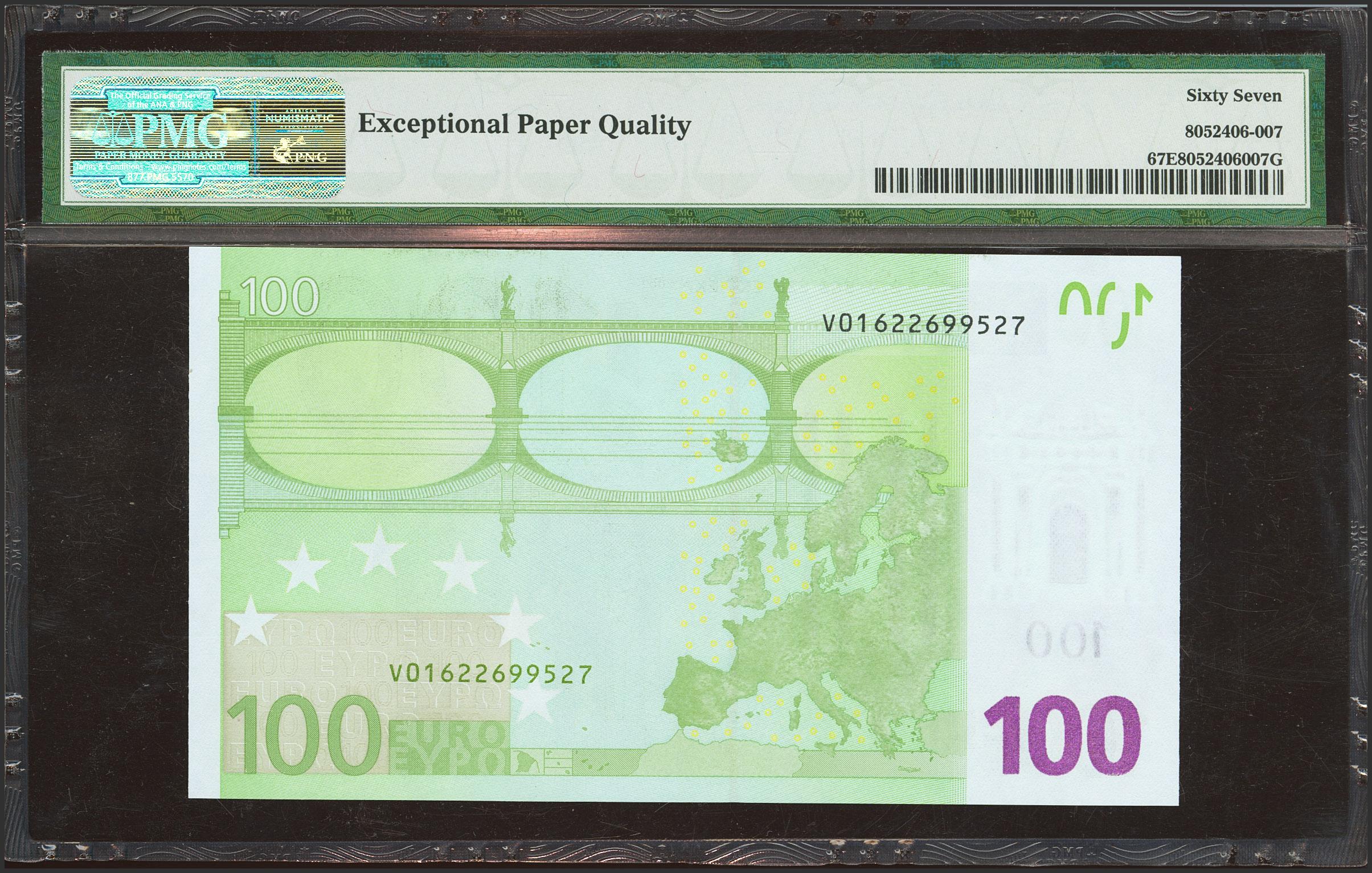 100 Euros. 1 de Enero de 2002. Firma Draghi. Serie V (España). (Edifil 2023: 490B, Pick: 5v). SC. Encapsulado PMG67EPQ.