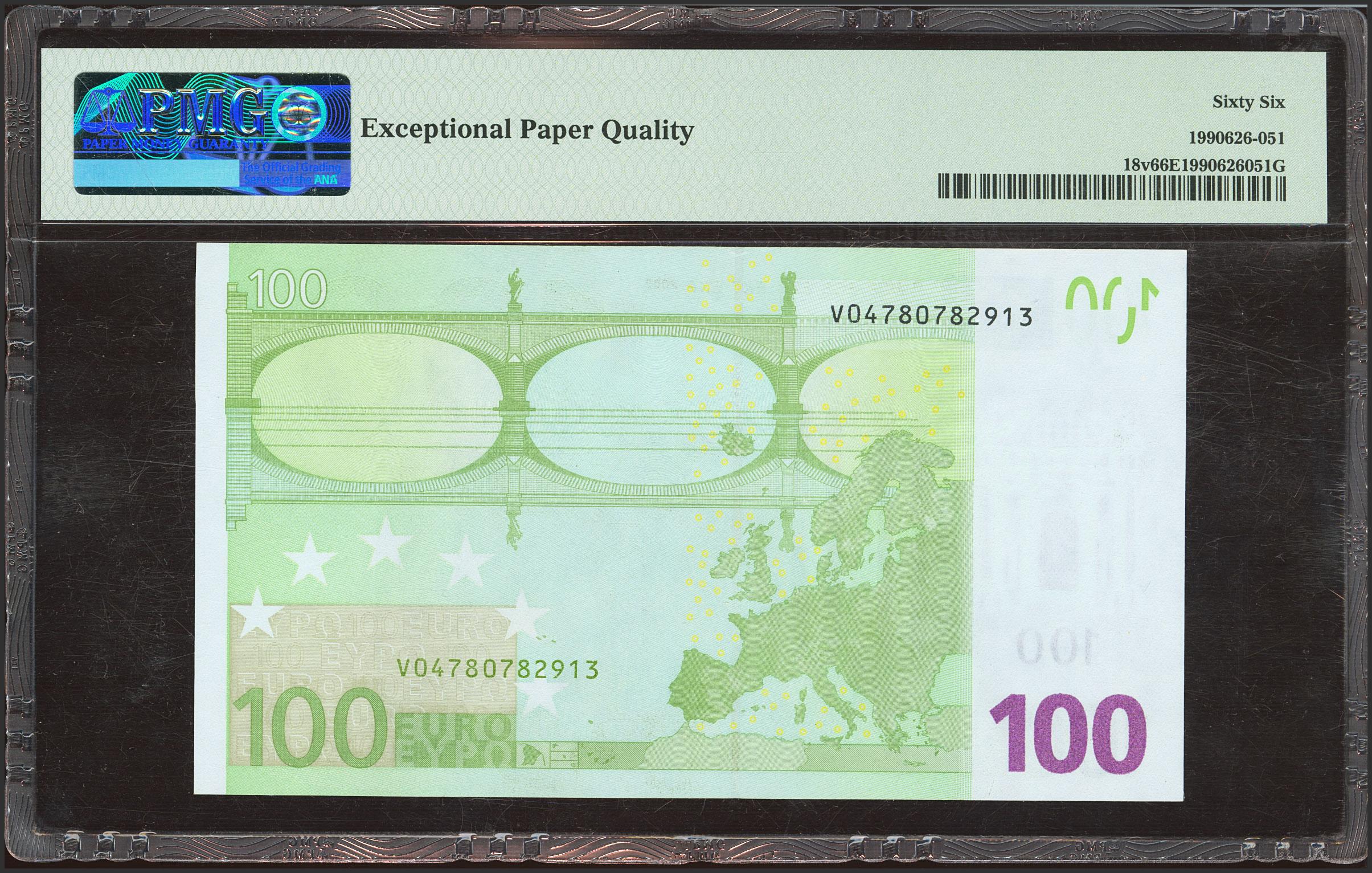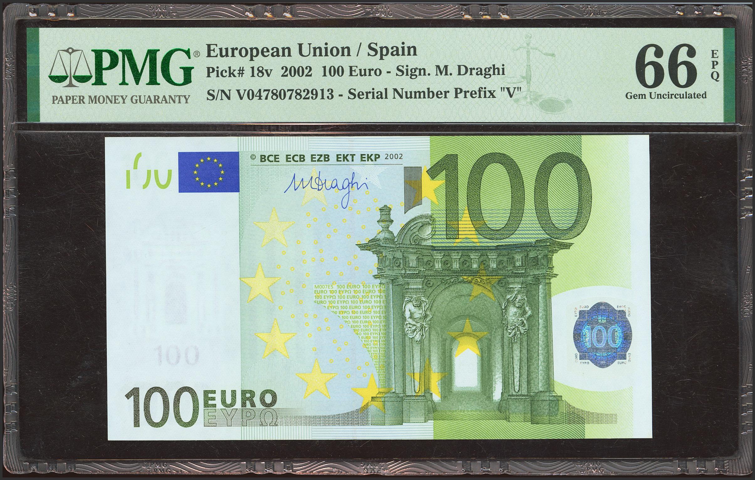 100 Euros. 1 de Enero de 2002. Firma Draghi. Serie V (España). (Edifil 2021: 490B, Pick: 18v). SC. Encapsulado PMG66EPQ.