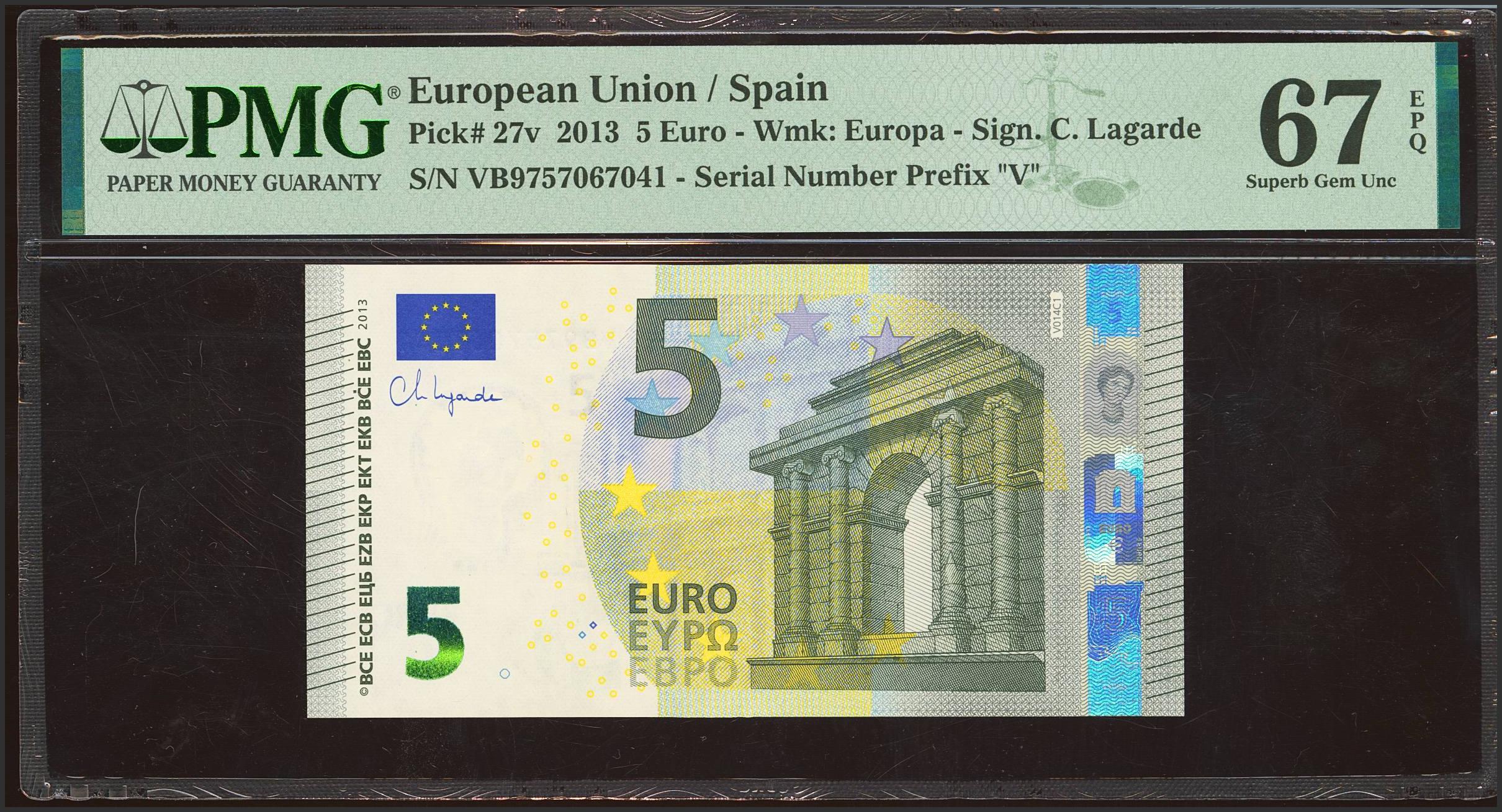 5 Euros. 2 de Mayo de 2013. Firma Lagarde. Serie V (España). (Edifil 2023: 493A, Pick: 27v). SC. Encapsulado PMG67EPQ.