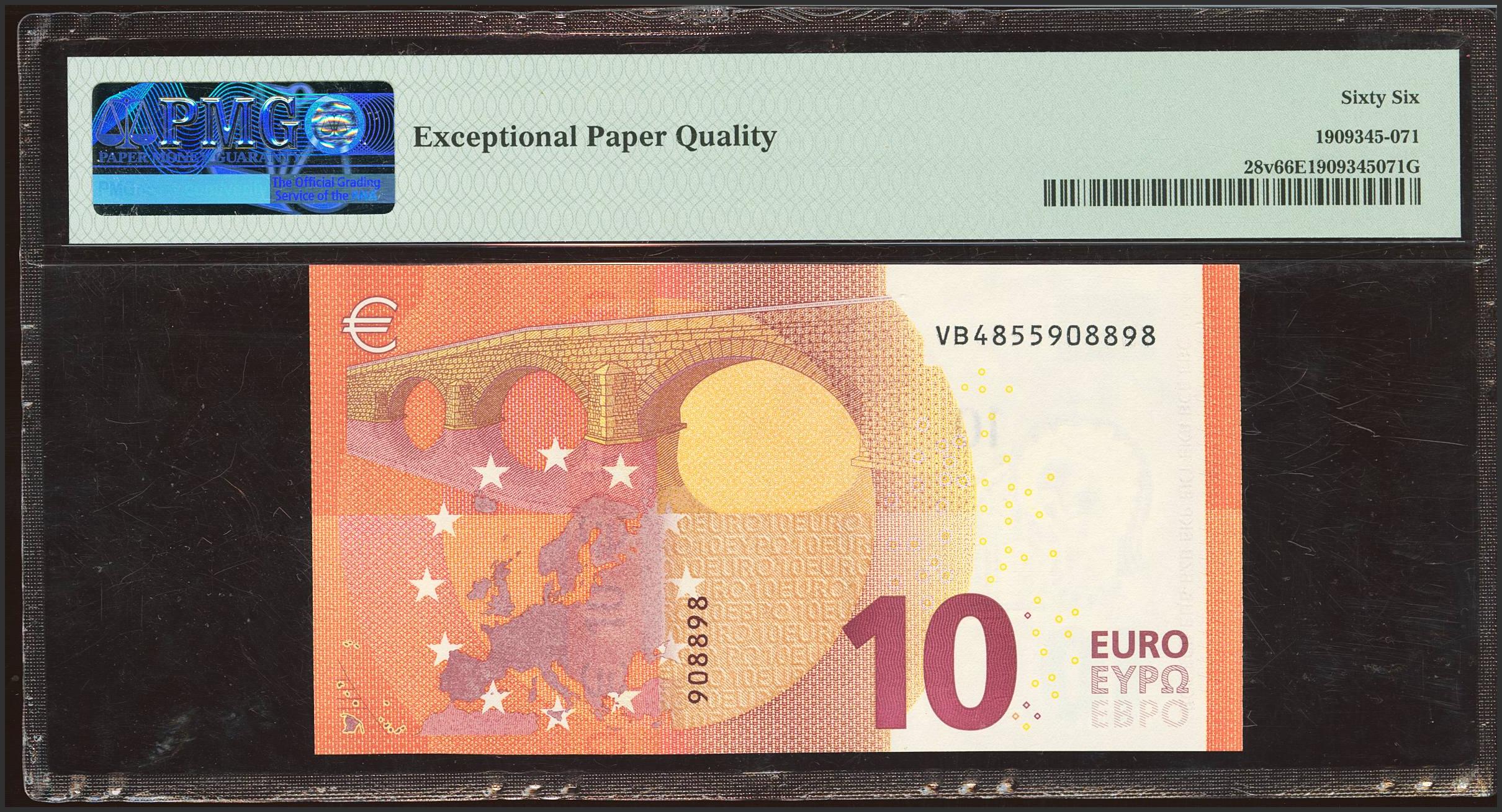 10 Euros. 23 de Septiembre de 2014. Firma Draghi. Serie VB (España). (Edifil 2023: 494a, Pick: 21v). Apresto original. SC. Encapsulado PMG66EPQ.
