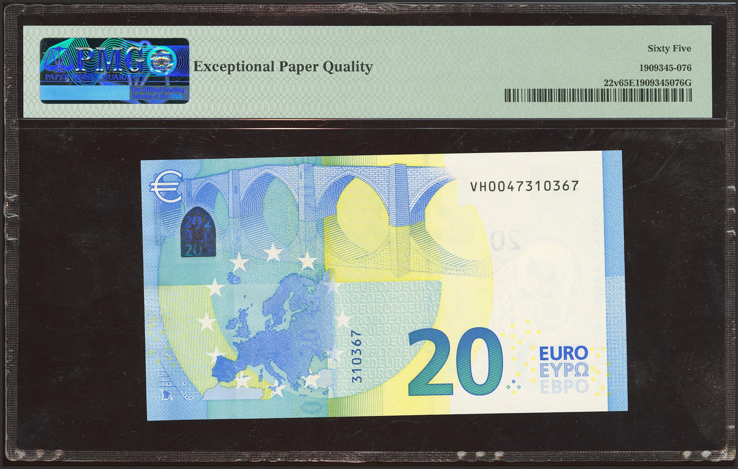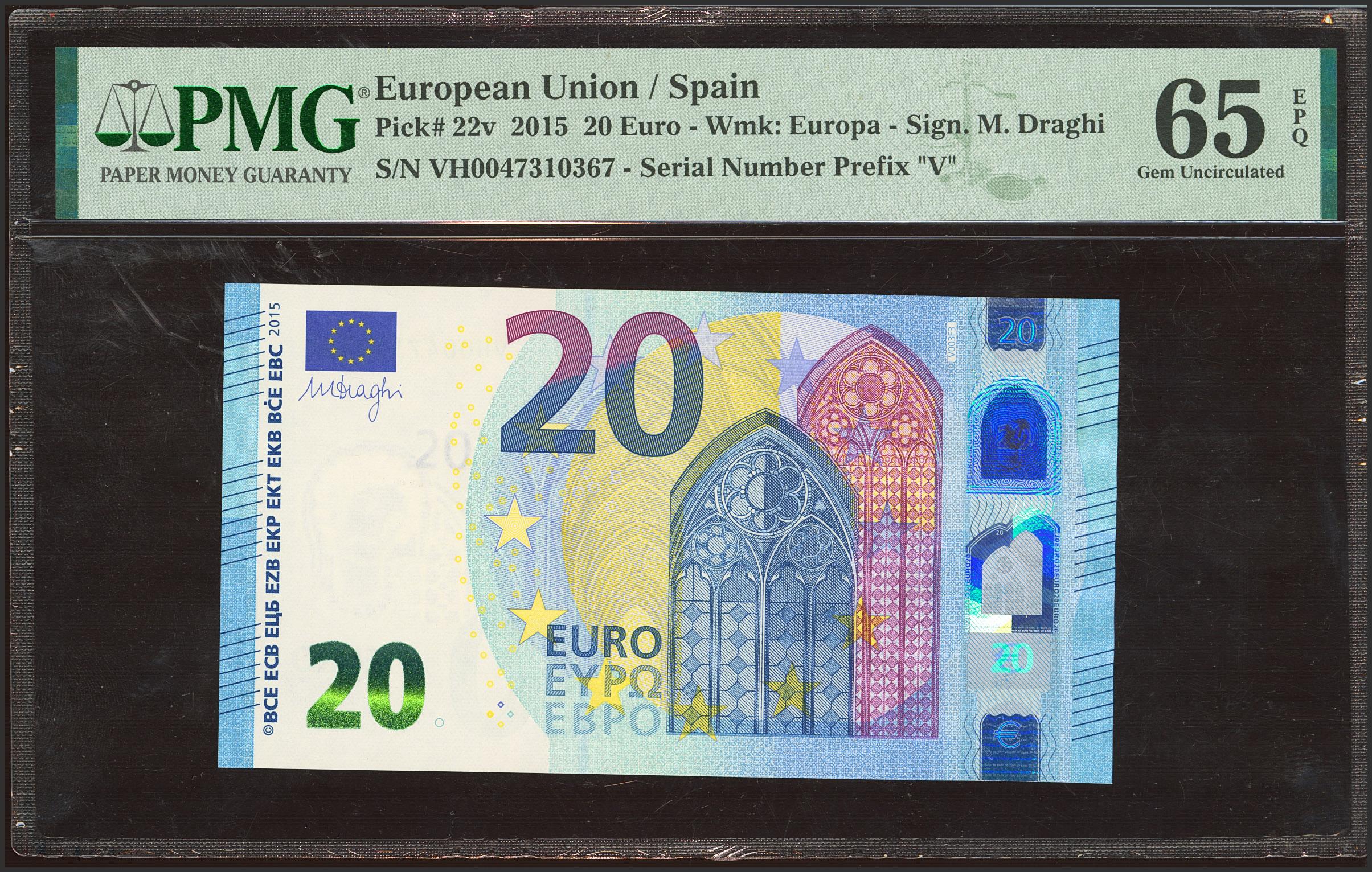 20 Euros. 25 de Noviembre de 2015. Firma Draghi. Serie especial VH (España). (Edifil 2023: 495a, Pick: 22v). SC. Encapsulado PMG65EPQ.