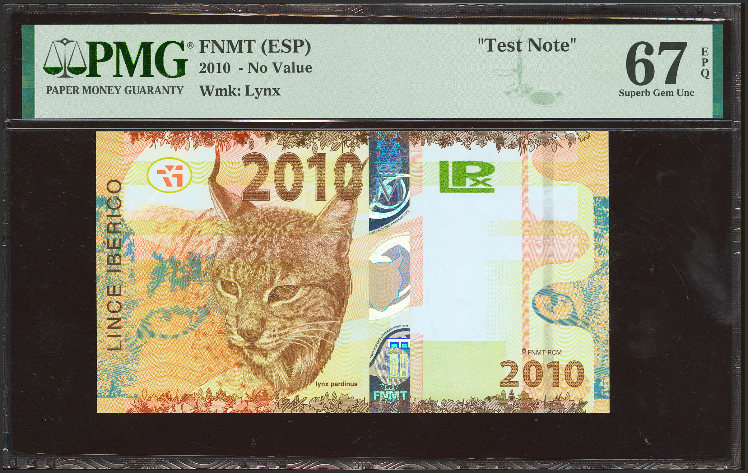 Prueba de billete de la FNMT, emitido en el 2010. Sin numeración. (Edifil 2023: 2). SC. Encapsulado PMG67EPQ.