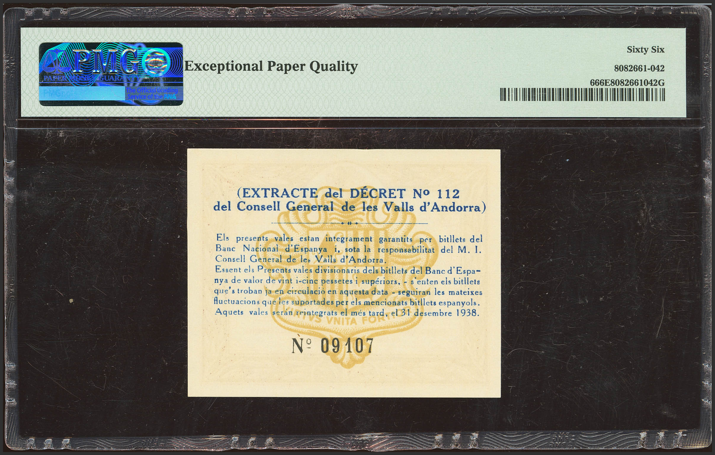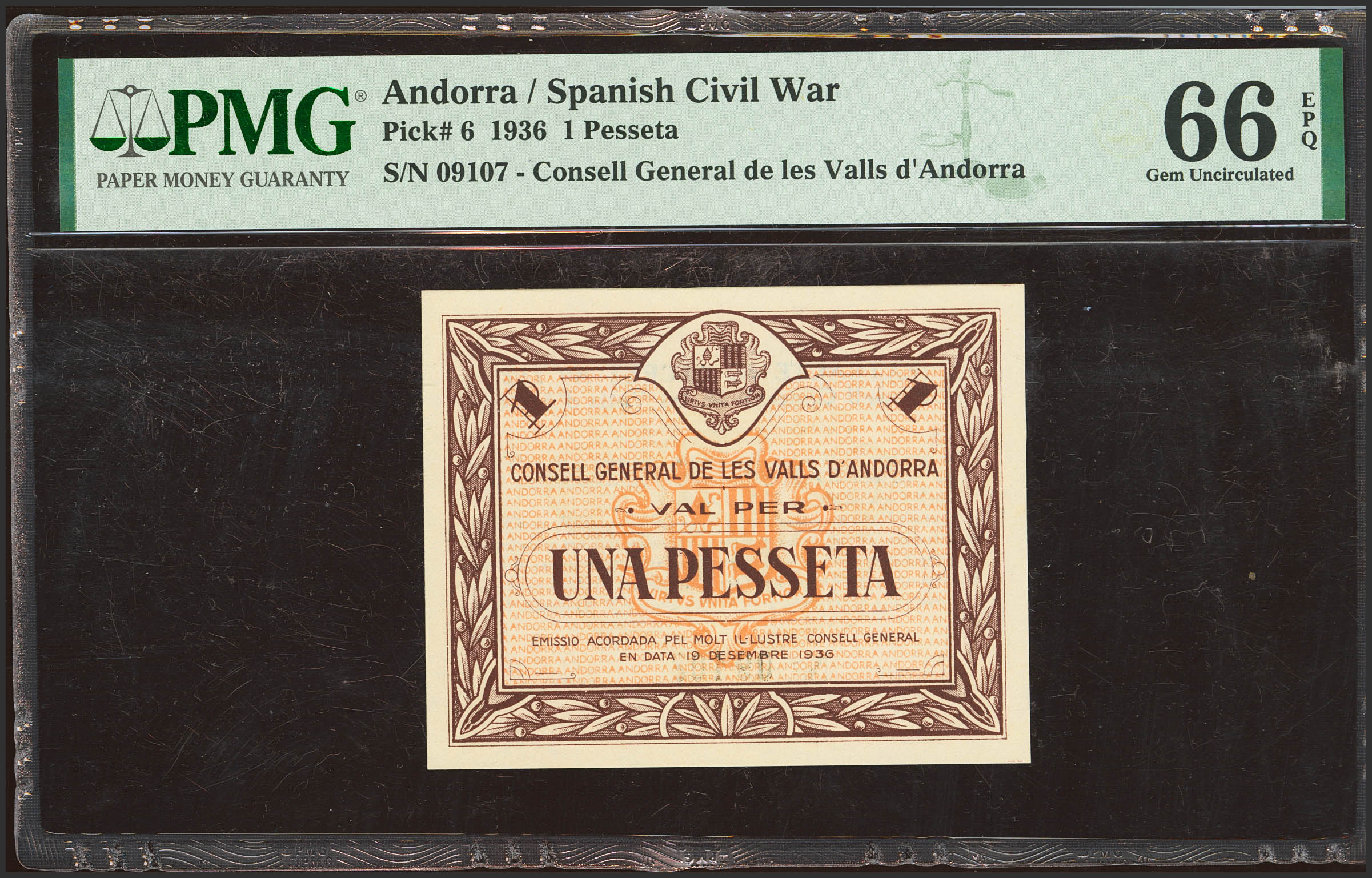ANDORRA. 1 Pesseta. 19 de Diciembre de 1936. Sin serie. (Edifil 2023: 3, Pick: 6). Raro, especialmente en esta excepcional calidad, apresto original. Encapsulado PMG66EPQ.