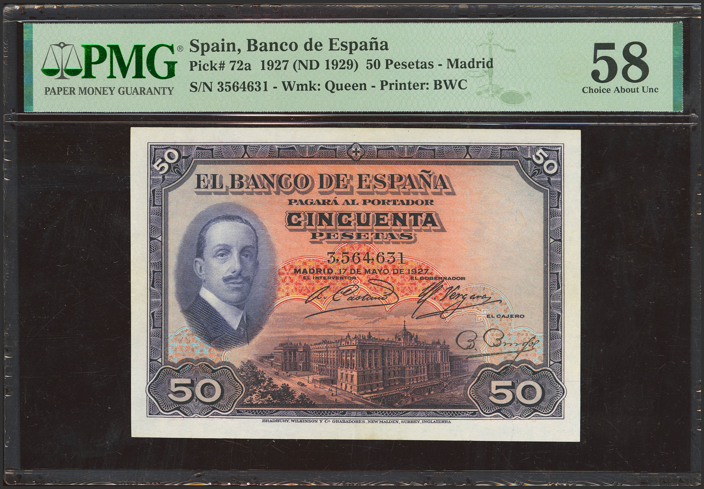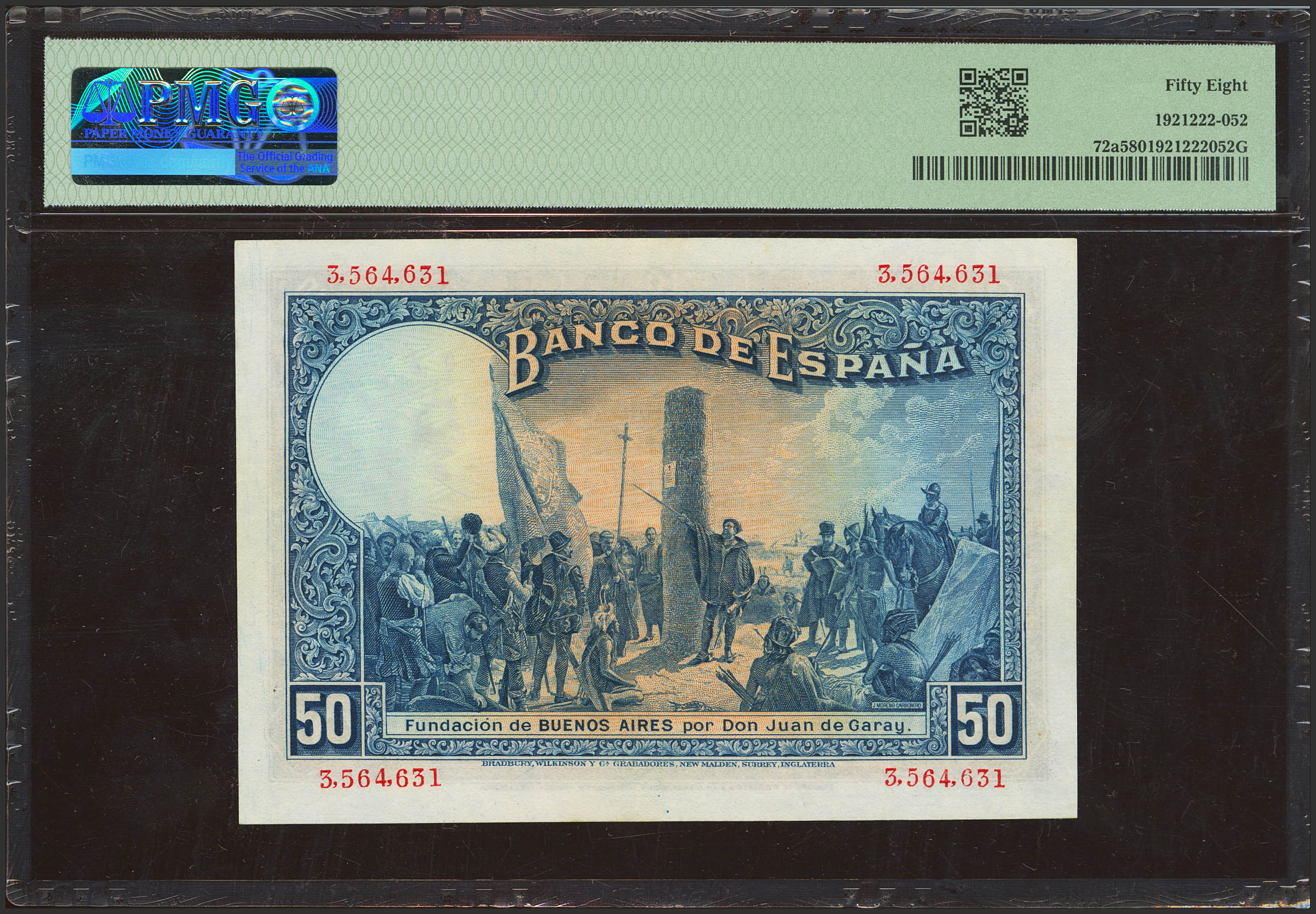 50 Pesetas. 17 de Mayo de 1927. Sin serie. (Edifil 2023: 326, Pick: 72a). Raro en esta calidad. EBC+. Encapsulado PMG58.
