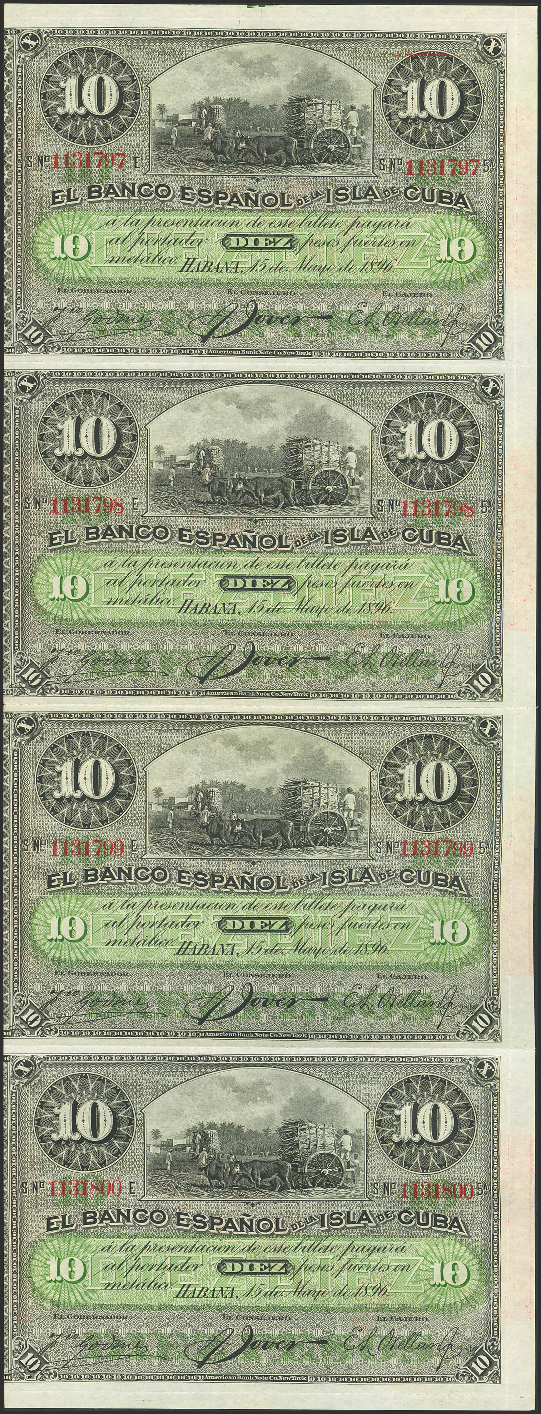BANCO ESPAÑOL DE LA ISLA DE CUBA. Conjunto de 4 billetes correlativos de 10 Pesos (sin desprender), emitidos el 15 de Mayo de 1896 con sobrecarga PLATA, al dorso. (Edifil 2023: 82). Apresto original, dos puntitos de aguja, no se trata de un defecto, sino que todos los billetes de esa posición lo tienen debido al sistema de impresión. SC.
