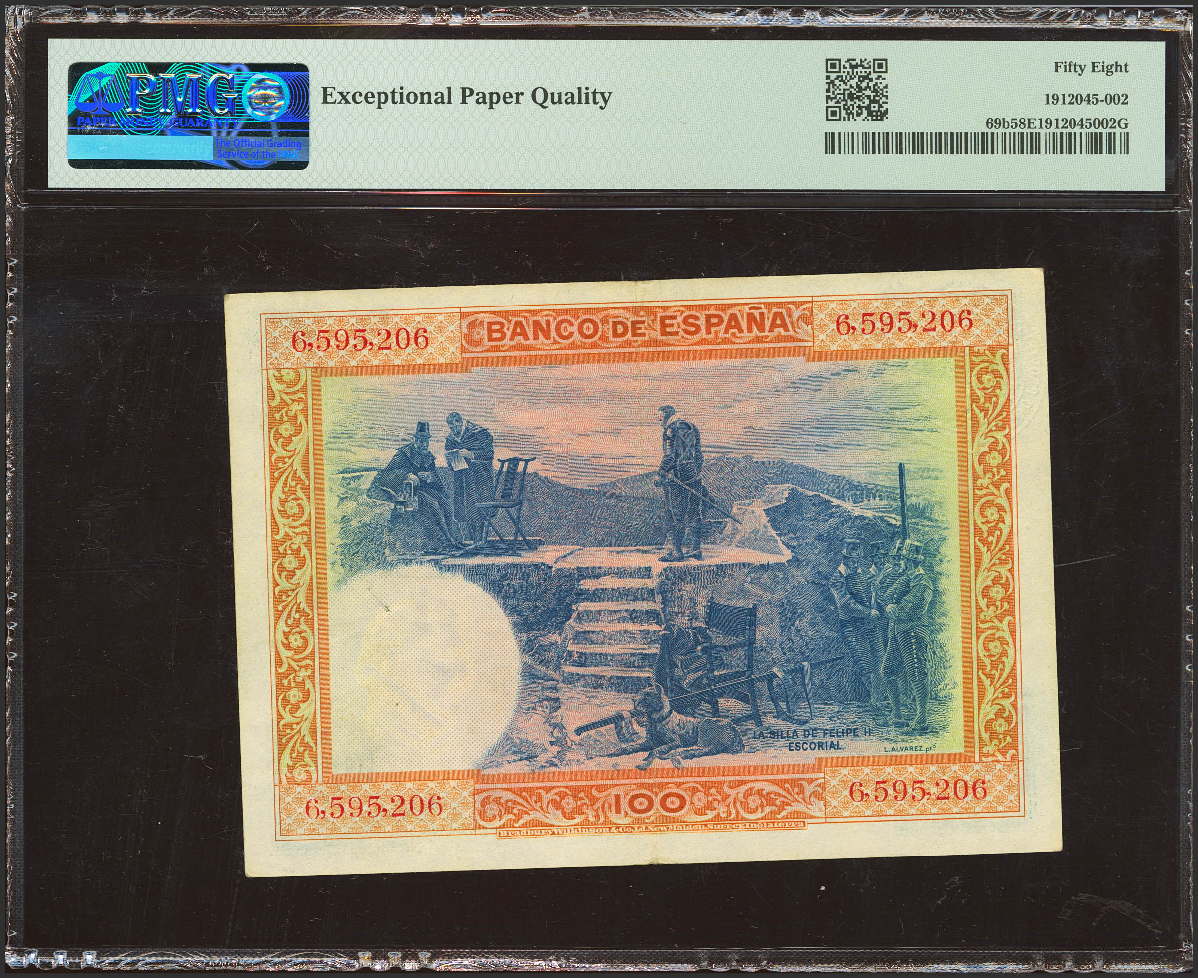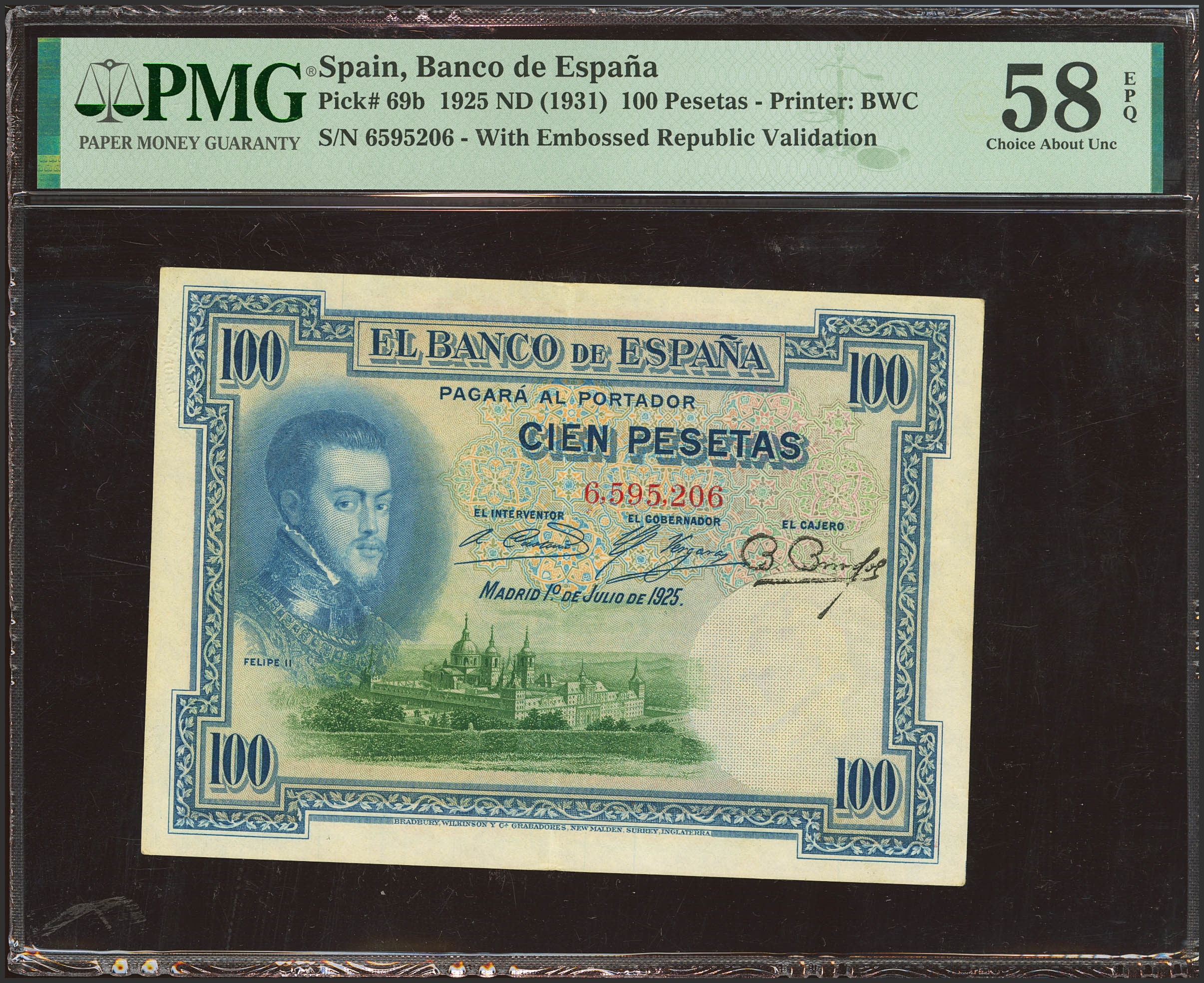 100 Pesetas. 1 de Julio de 1925. Sin serie y sello en seco GOBIERNO PROVISIONAL DE LA REPUBLICA / 14 ABRIL 1931. (Edifil 2023: 344, Pick: 69b). Apresto original. EBC+++. Encapsulado PMG58EPQ.