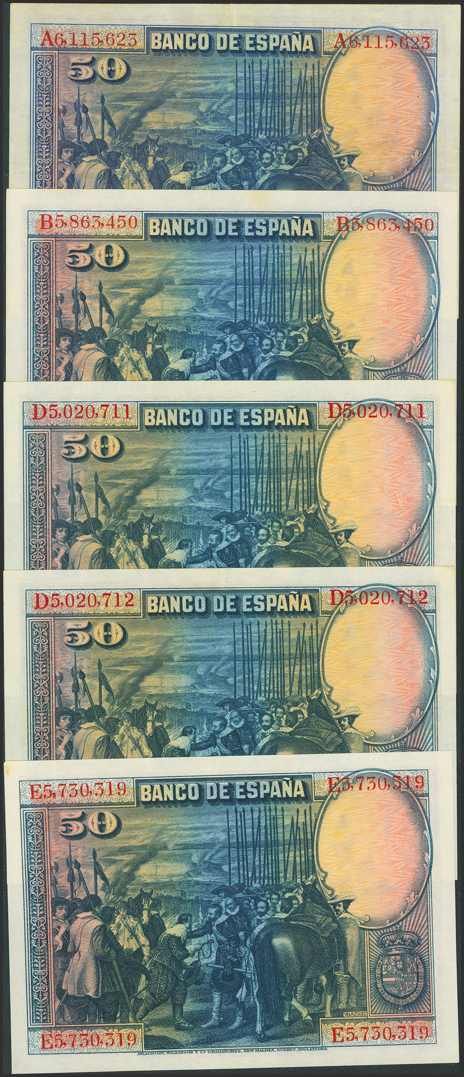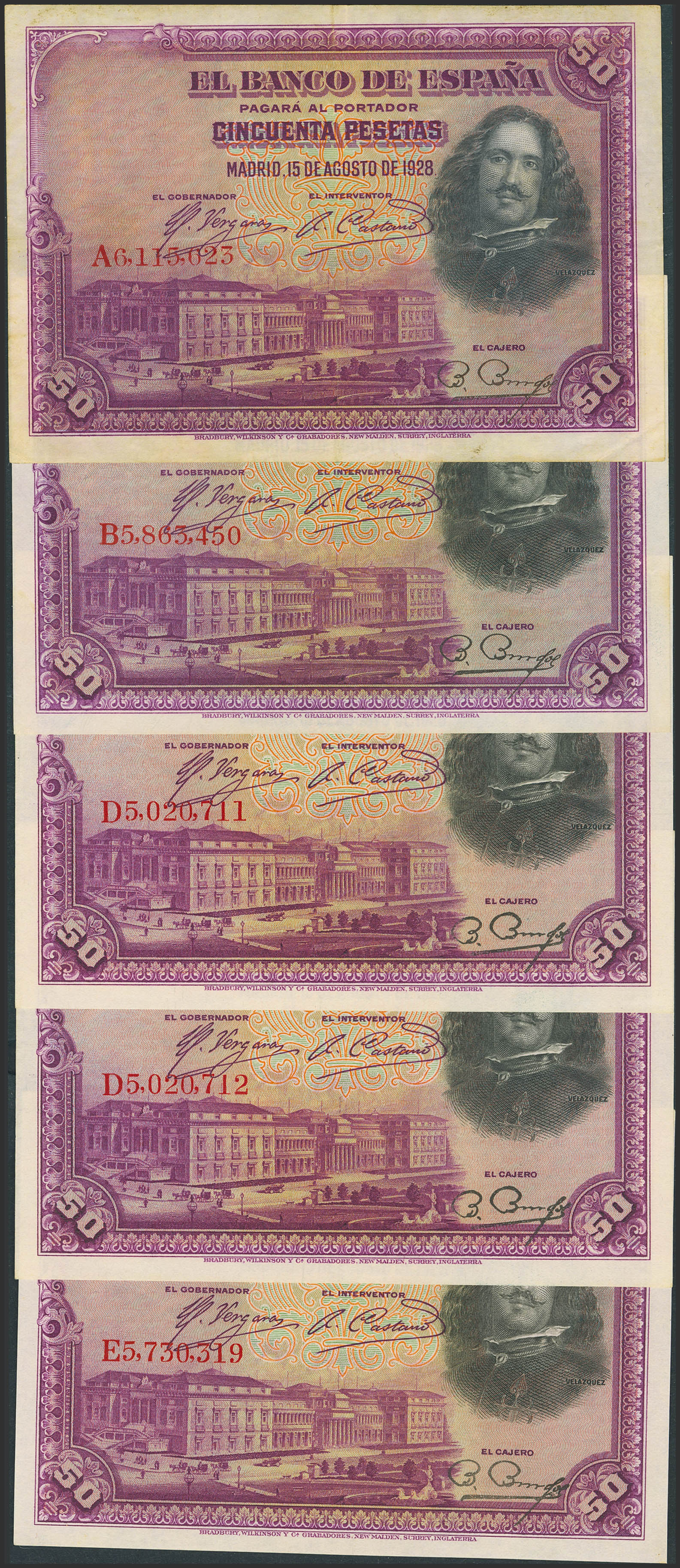 Conjunto de 5 billetes correlativos de 50 Pesetas emitidos el 15 de Agosto de 1928, con la serie A,B, C, D(2), E, respectivamente (Edifil 2023: 354). A EXAMINAR.