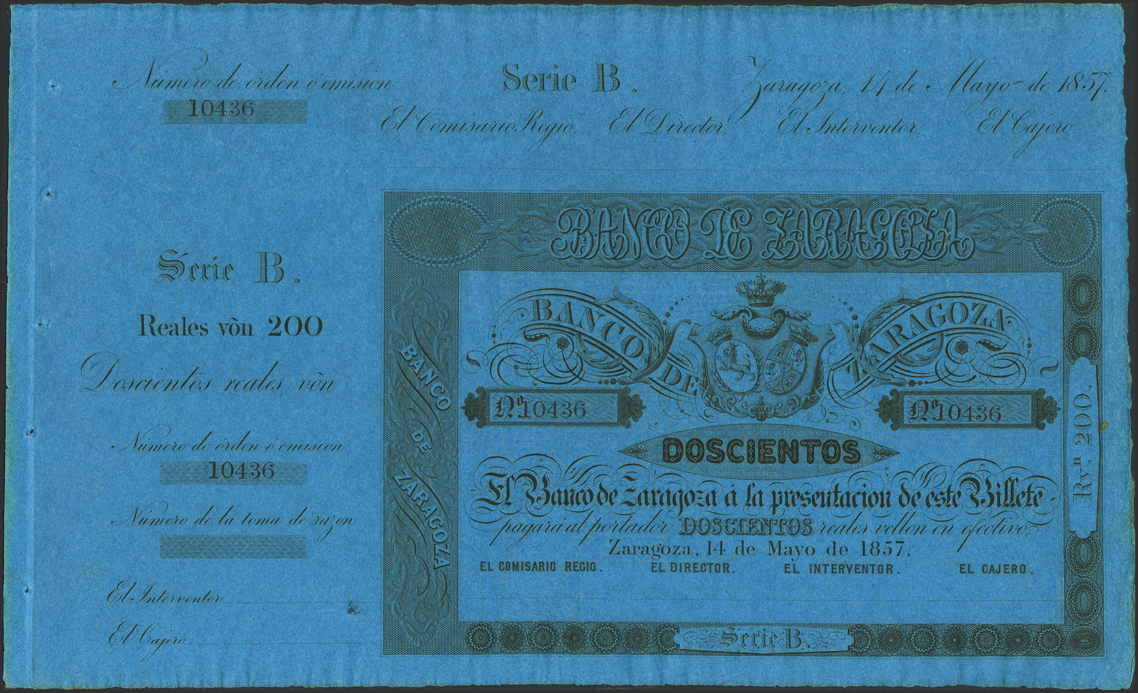 200 Reales. 14 de Mayo de 1857. Banco de Zaragoza. Serie B y con matriz. (Edifil 2023: 127). SC-.