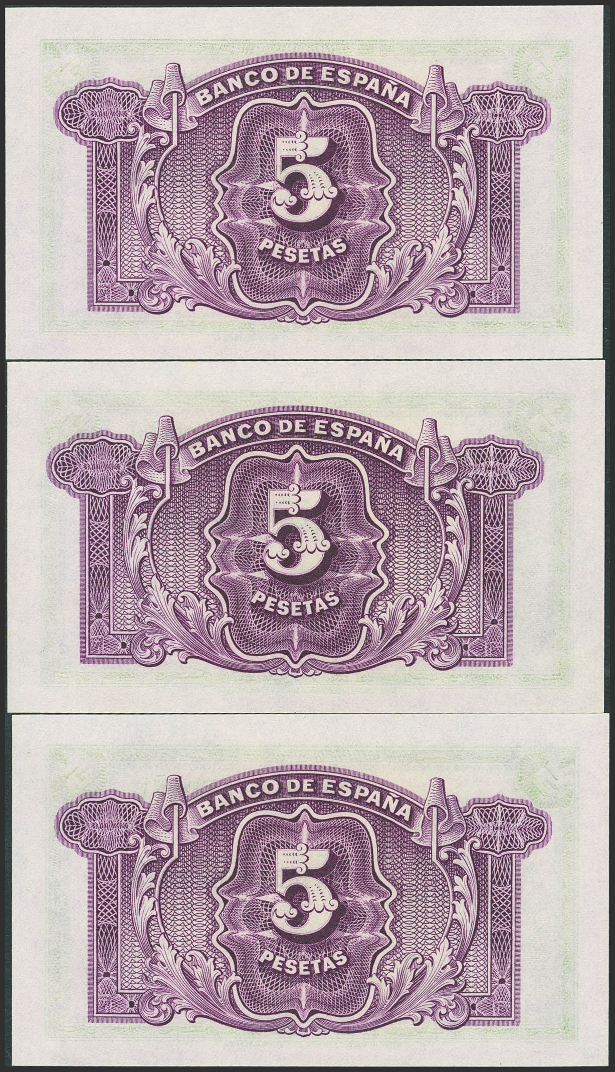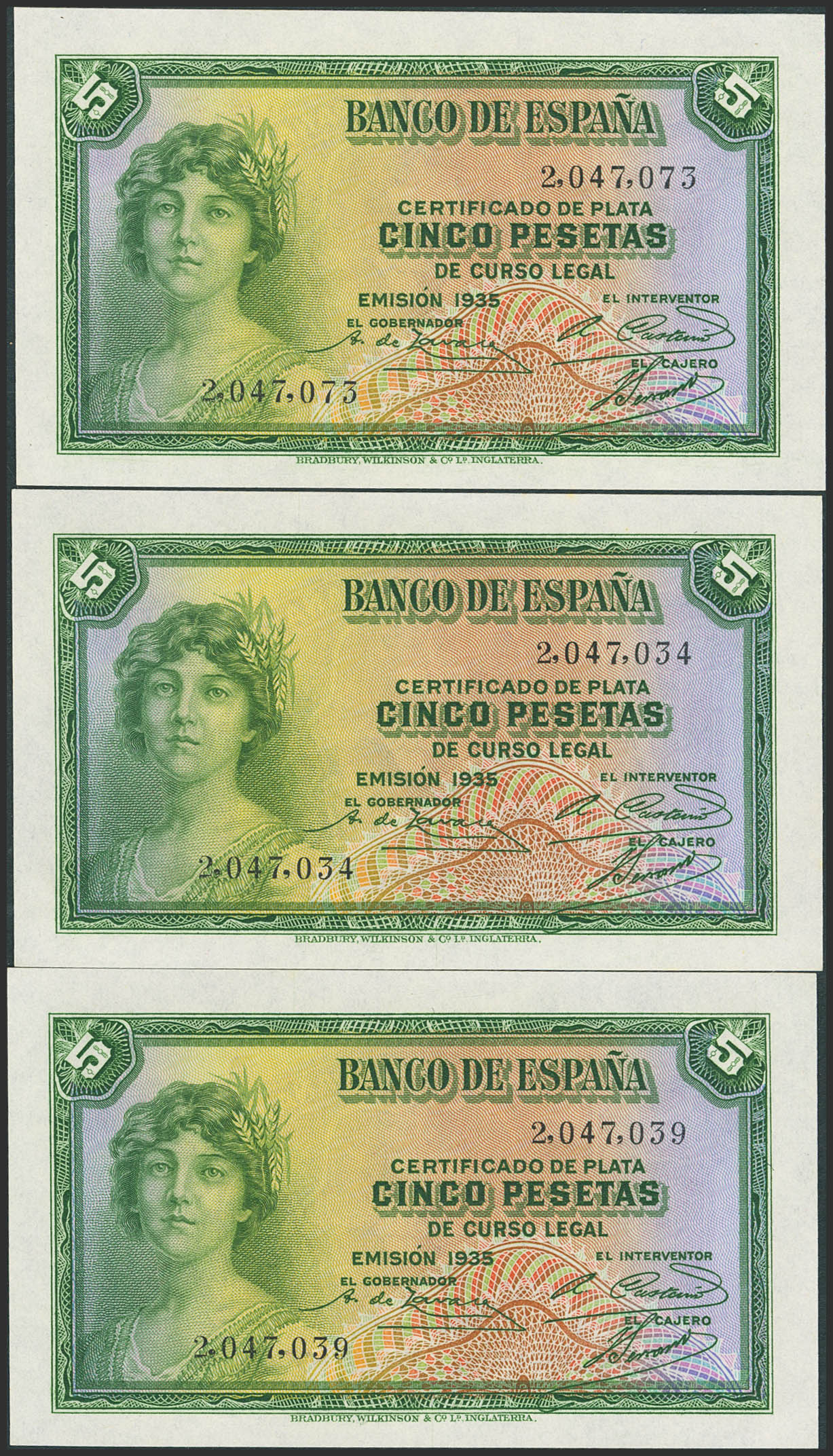 Conjunto de 3 billetes de 5 Pesetas Certificado de Plata emitidos en 1935, sin serie (Edifil 2023: 363), conservando todo su apresto original. SC/SC-.