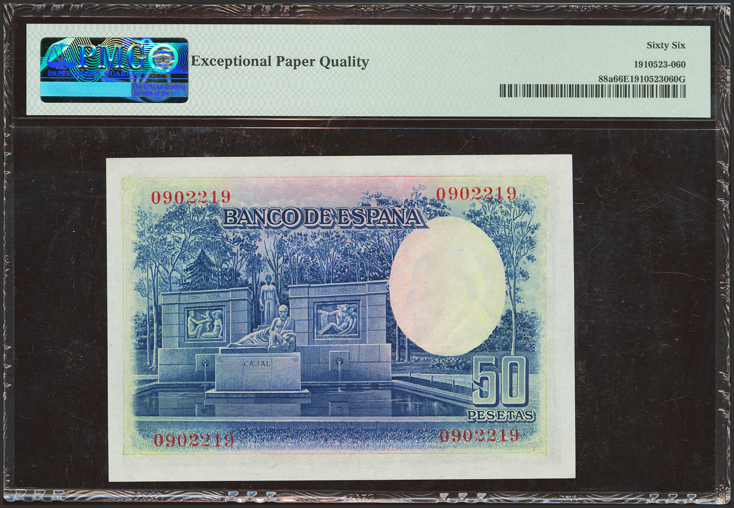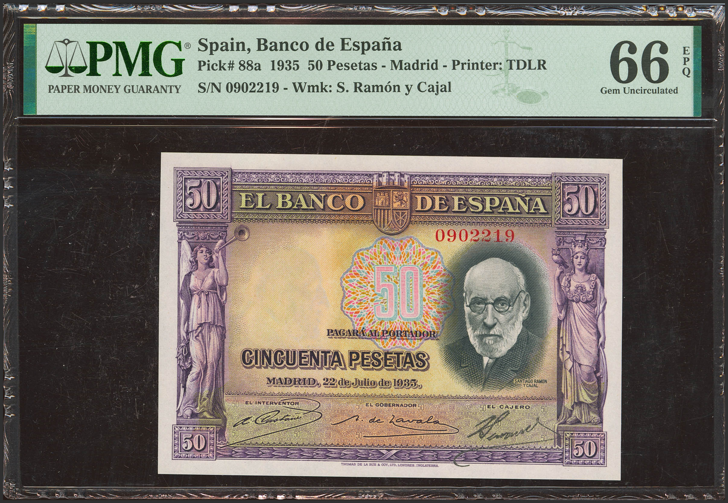 50 Pesetas. 22 de Julio de 1935. Sin serie. (Edifil 2023: 366, Pick: 88a). Inusual en esta calidad, apresto original. SC. Encapsulado PMG66EPQ.