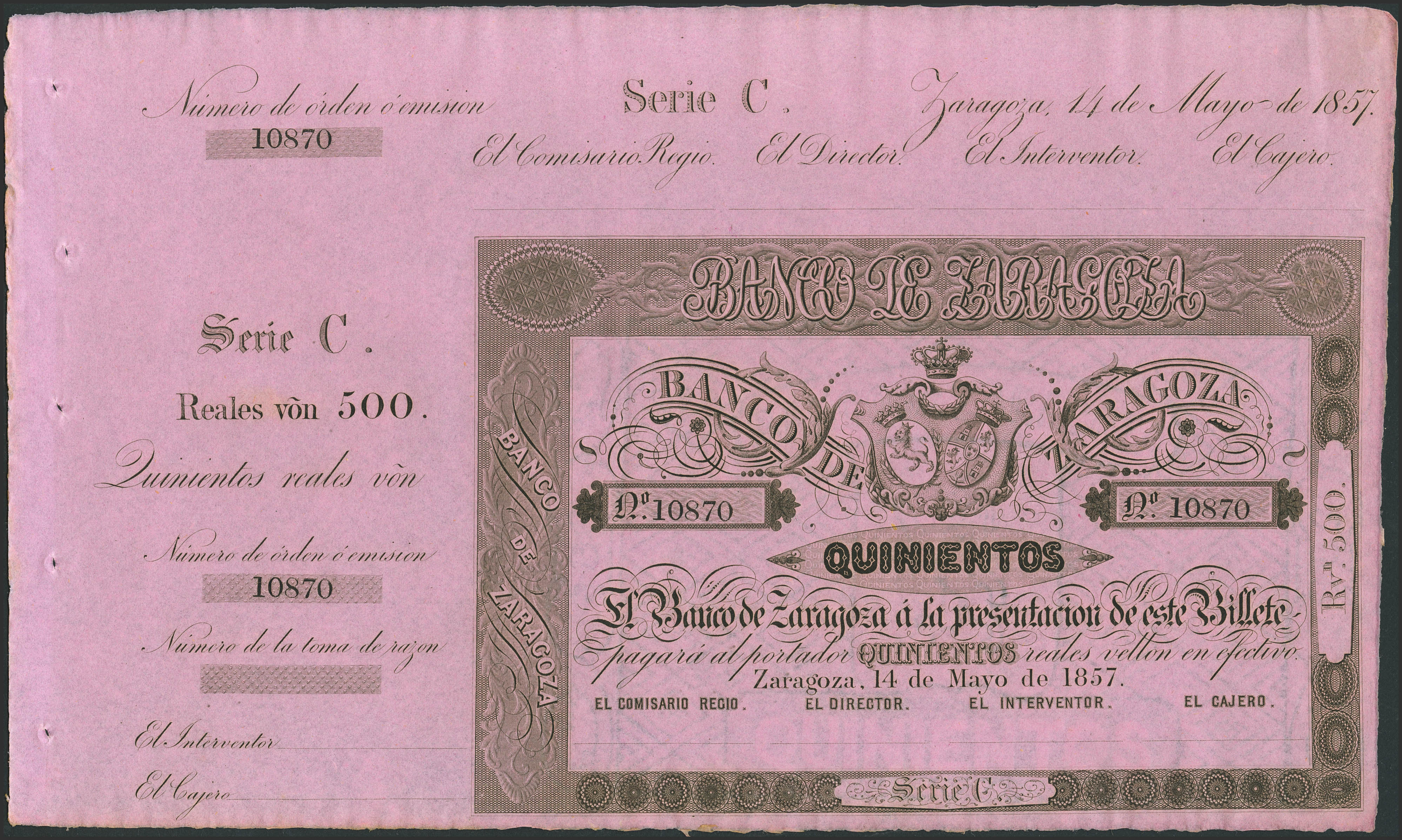 500 Reales. 14 de Mayo de 1857. Banco de Zaragoza. Serie C y con matriz. (Edifil 2023: 128B). Apresto original. SC-.