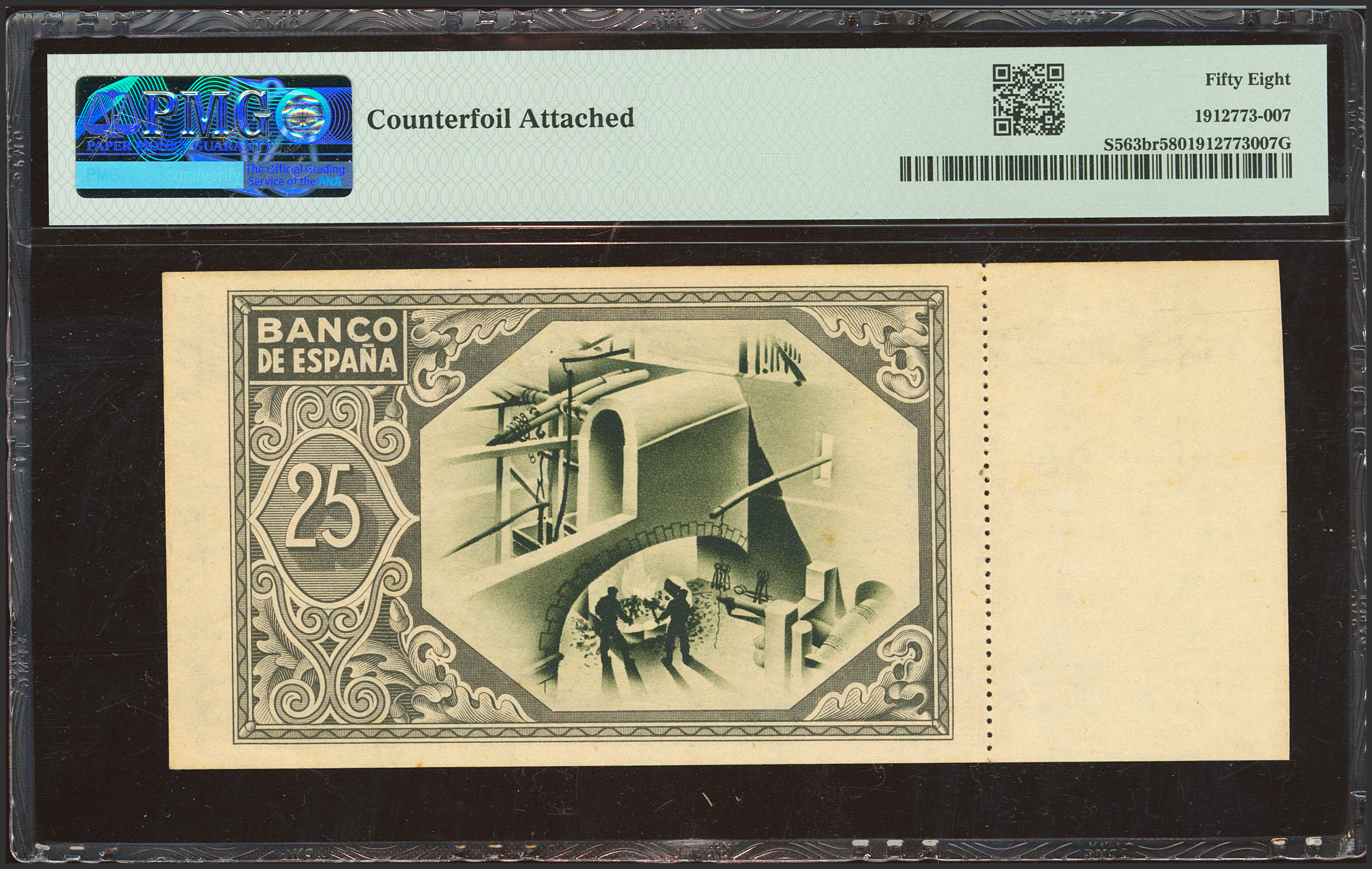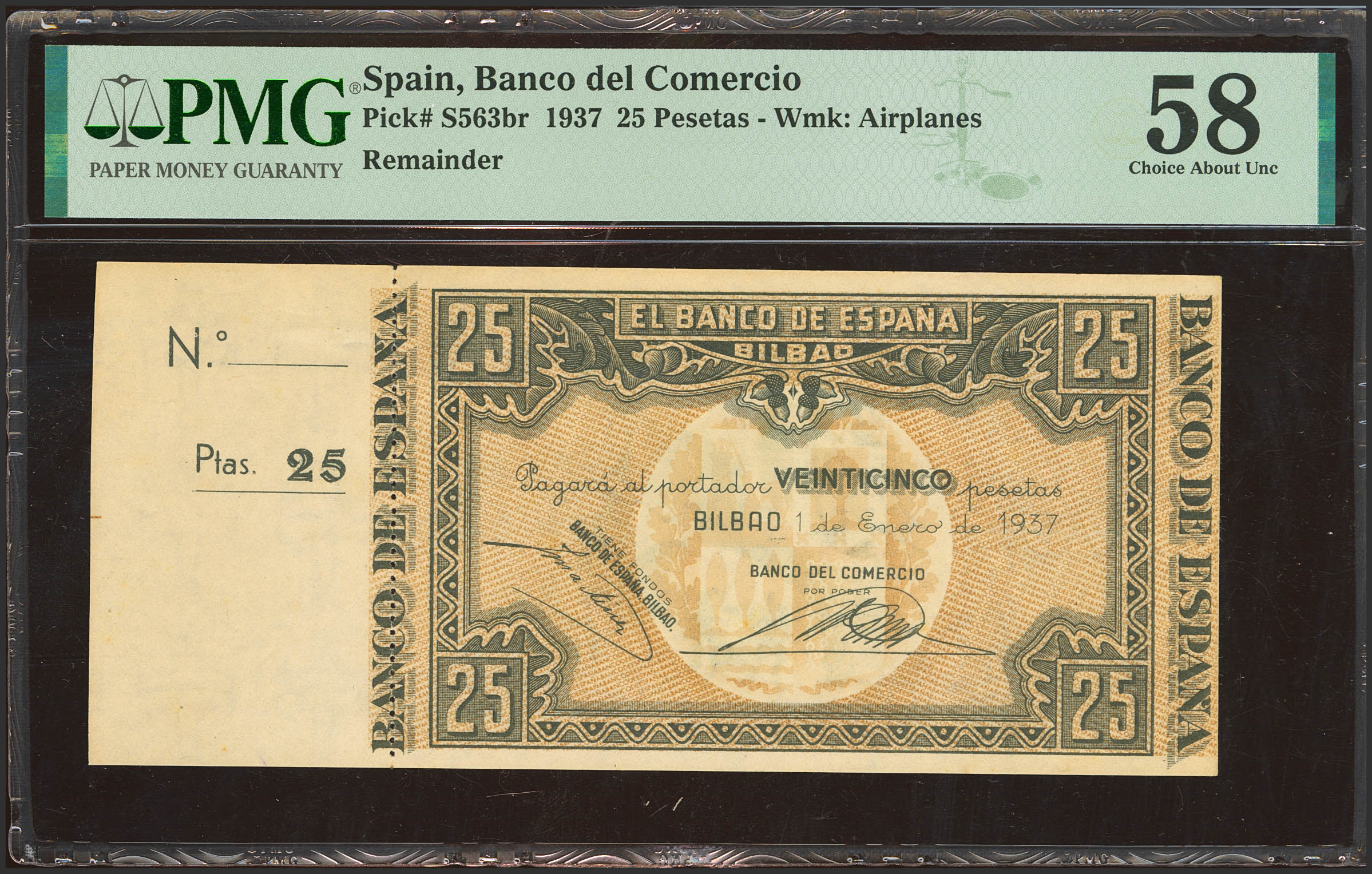 25 Pesetas. 1 de Enero de 1937. Sucursal de Bilbao, antefirma Banco del Comercio. Sin serie y sin numeración, con matriz a la izquierda. (Edifil 2023: 388b, Pick: S563br). Apresto original. SC. Encapsulado PMG58.