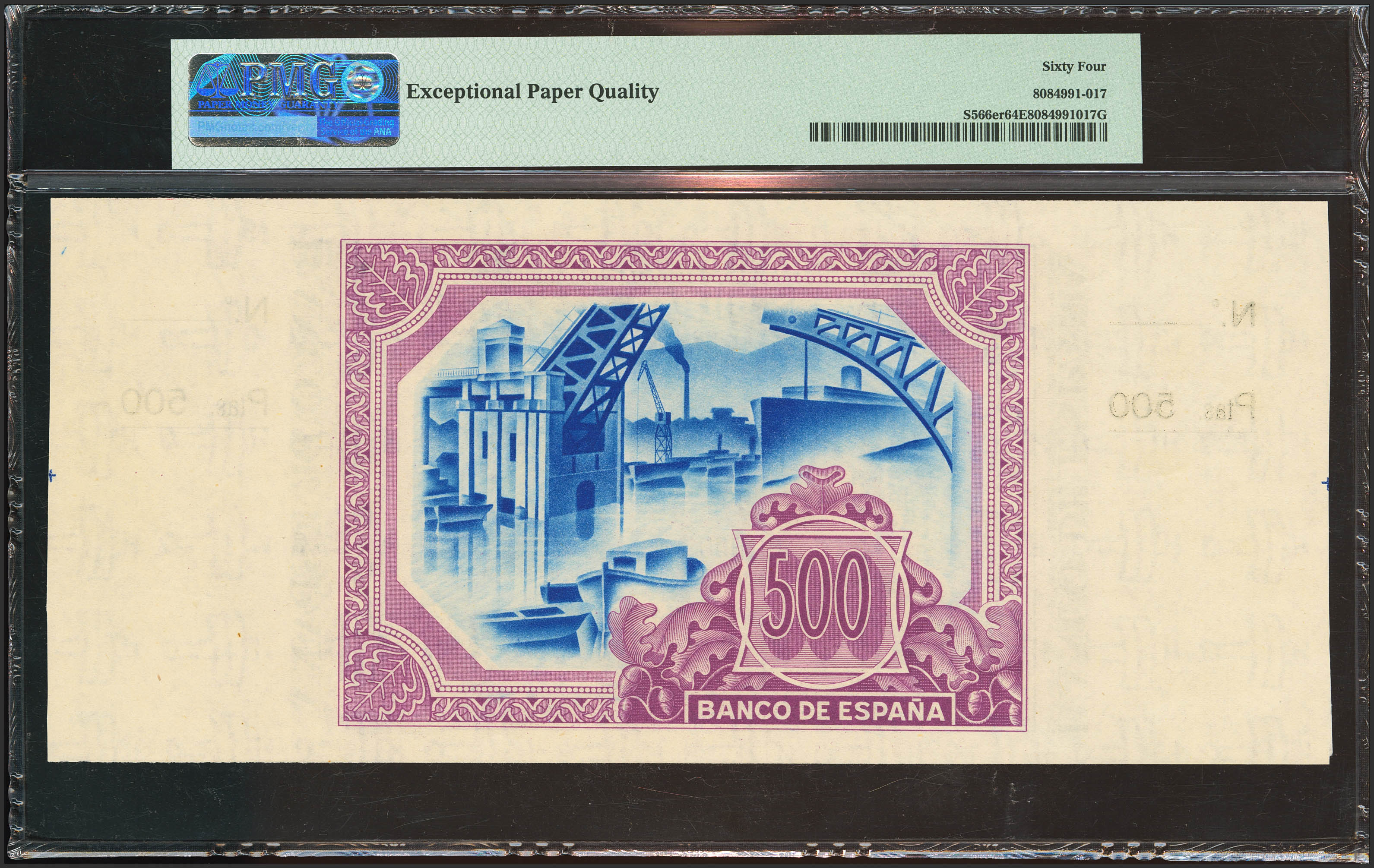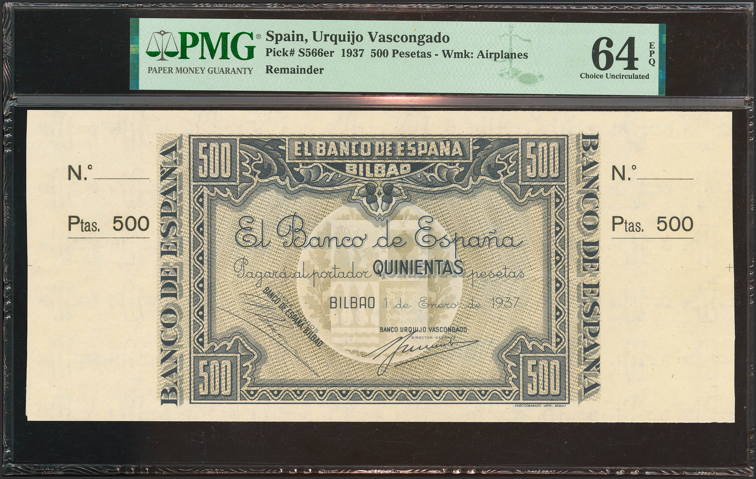 500 Pesetas. 1 de Enero de 1937. Sucursal de Bilbao, antefirma Banco Urquijo Vascongado. Sin serie y sin numeración, con ambas matrices. (Edifil 2023: NE26f, Pick: S566er). Muy raro en esta excepcional conservación. SC. Encapsulado PMG64EPQ (Para hacerse una idea de la rareza de este billete en esta calidad PMG otorga, a día 1 de Abril de 2025, la cuarta mejor calificación de esta antefirma).